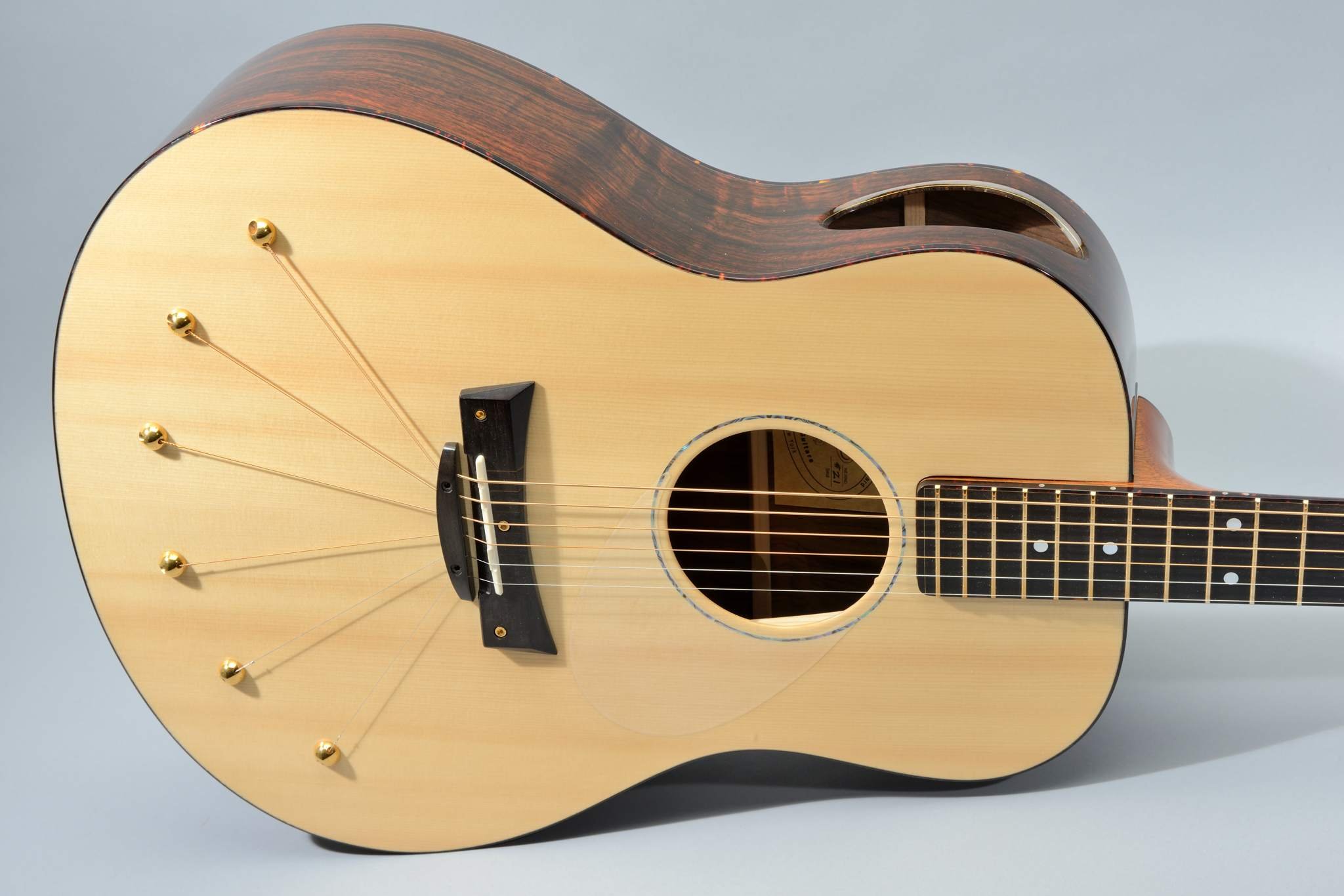 This guitar also features patented Torque Reducing Split Bridge, Continually Adjustable Neck and String Anchored Lateral Compression Soundboard.