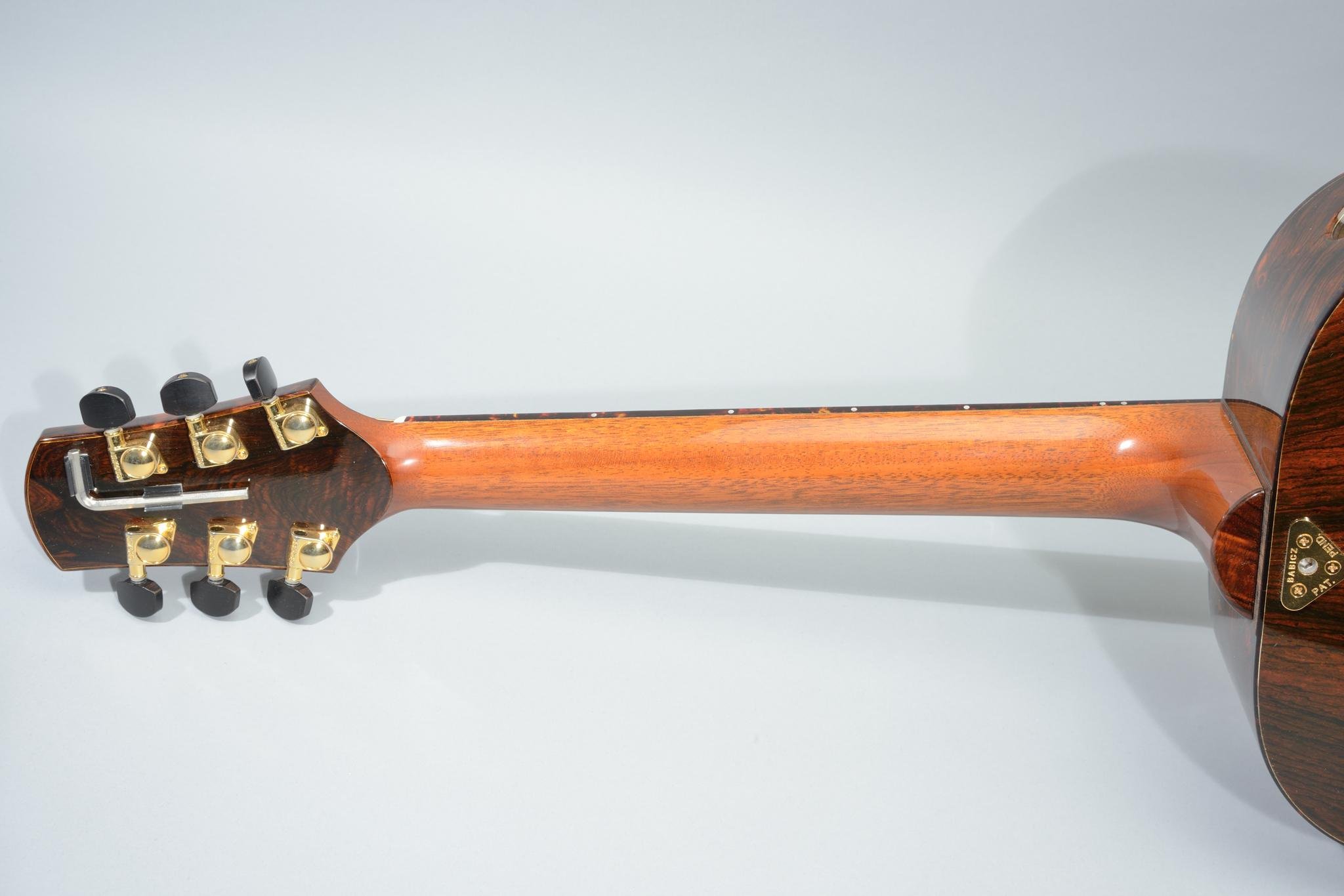 I once again had a blast raising and lowering the neck on the D’esque and I discovered another cool thing: Babicz’s Continually Adjustable Neck System makes it much easier to use more extreme tunings, both above and below standard pitch. For instance, dropping most acoustics down to DADGAD or below (say, to open C) typically necessitates using heavier strings to avoid the rattling and buzzing caused by the decreased string tension. Not with this guitar. I took out the trusty Allen wrench and simply raised the D’esque’s action until the rattles went away. It took about five seconds. Conversely, I found that higher tunings, such as open e and eBeABe (DADGAD up a full step)—unadvisable if not impossible on most acoustics—were actually manageable on the D’esque because I could lower the action.