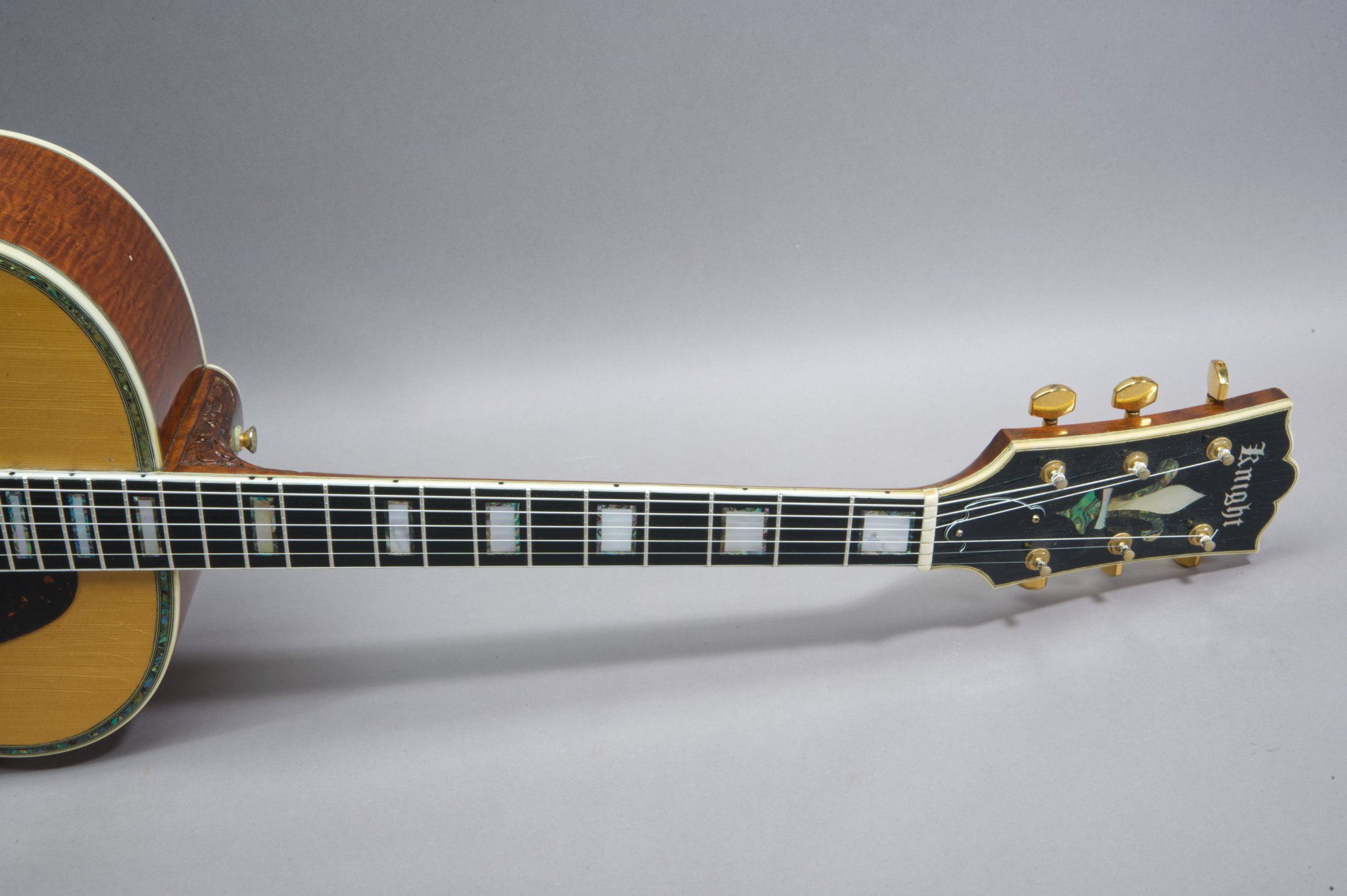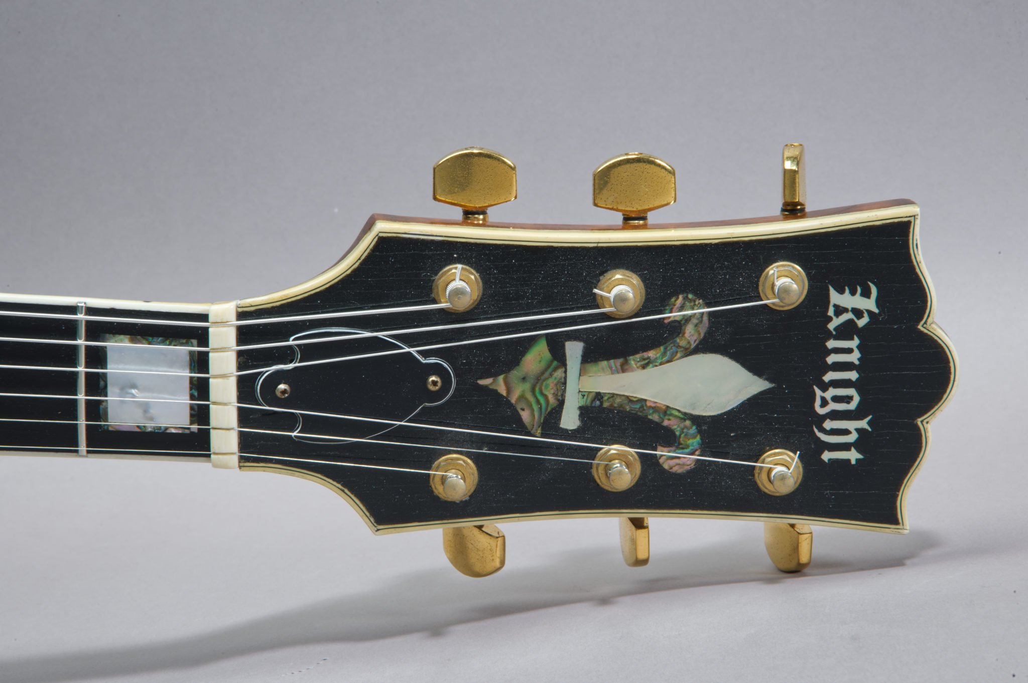 Black Headstock overlay with the Knight Logo in MOP and Abalone Inlays.
