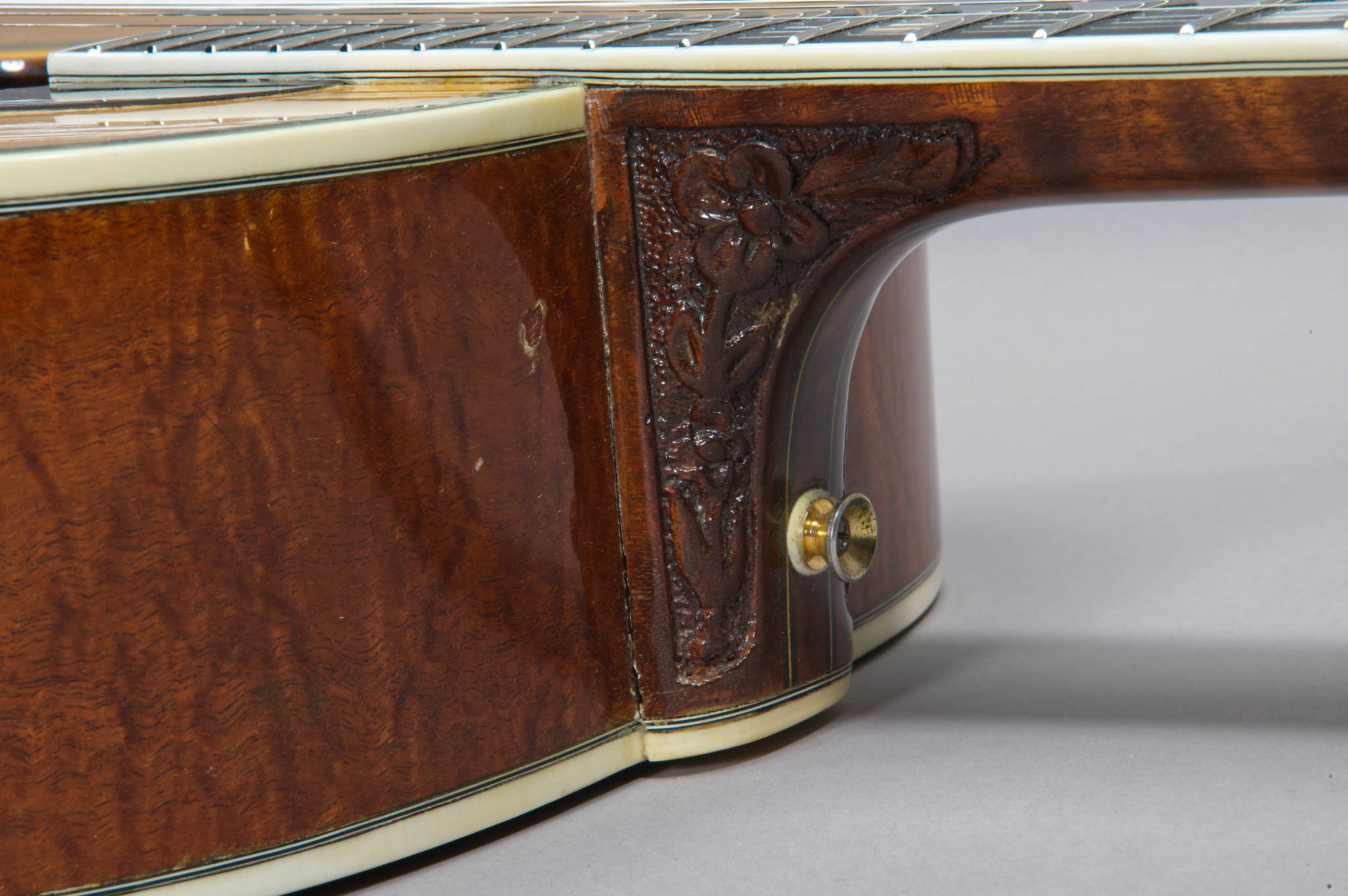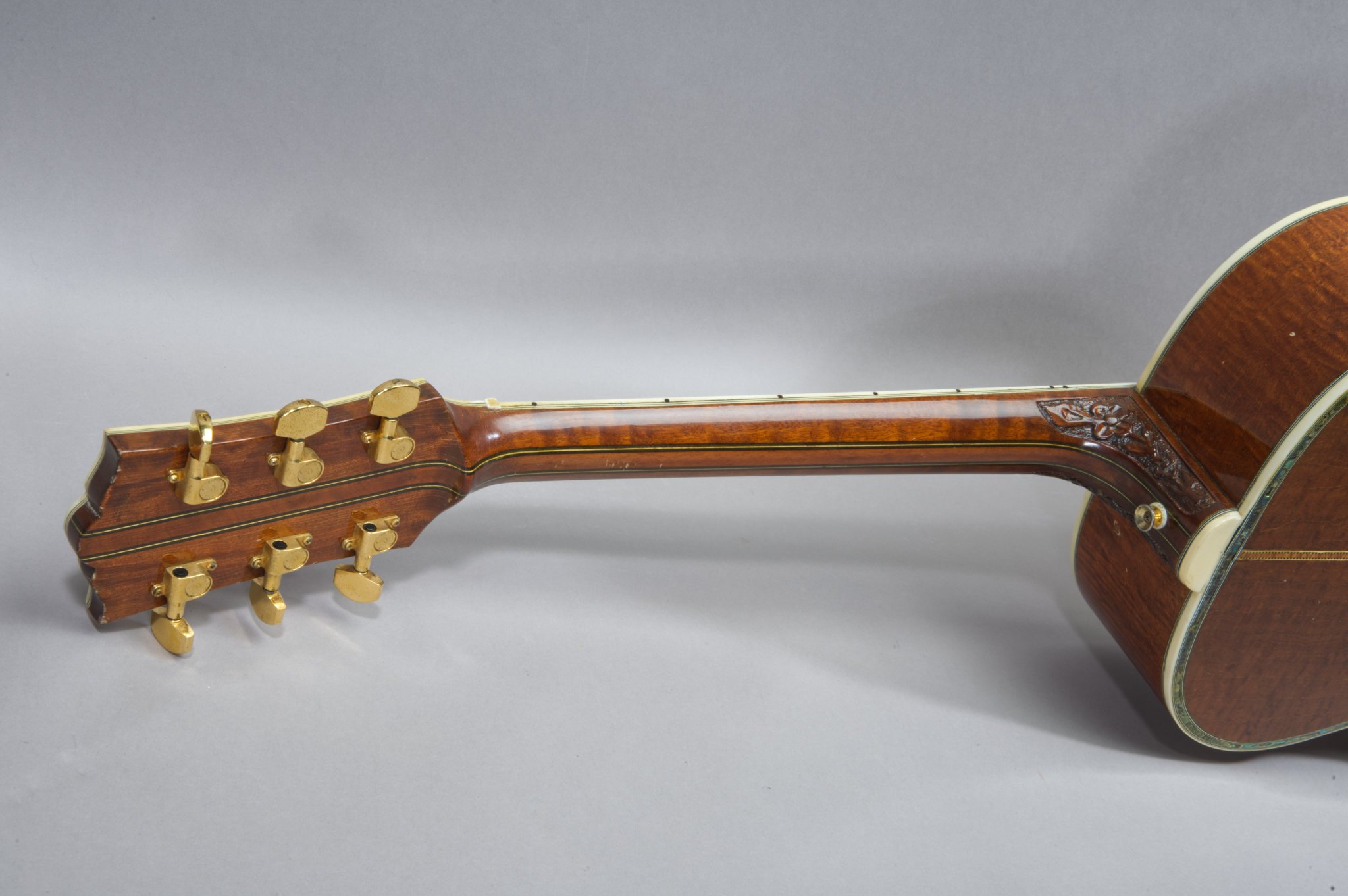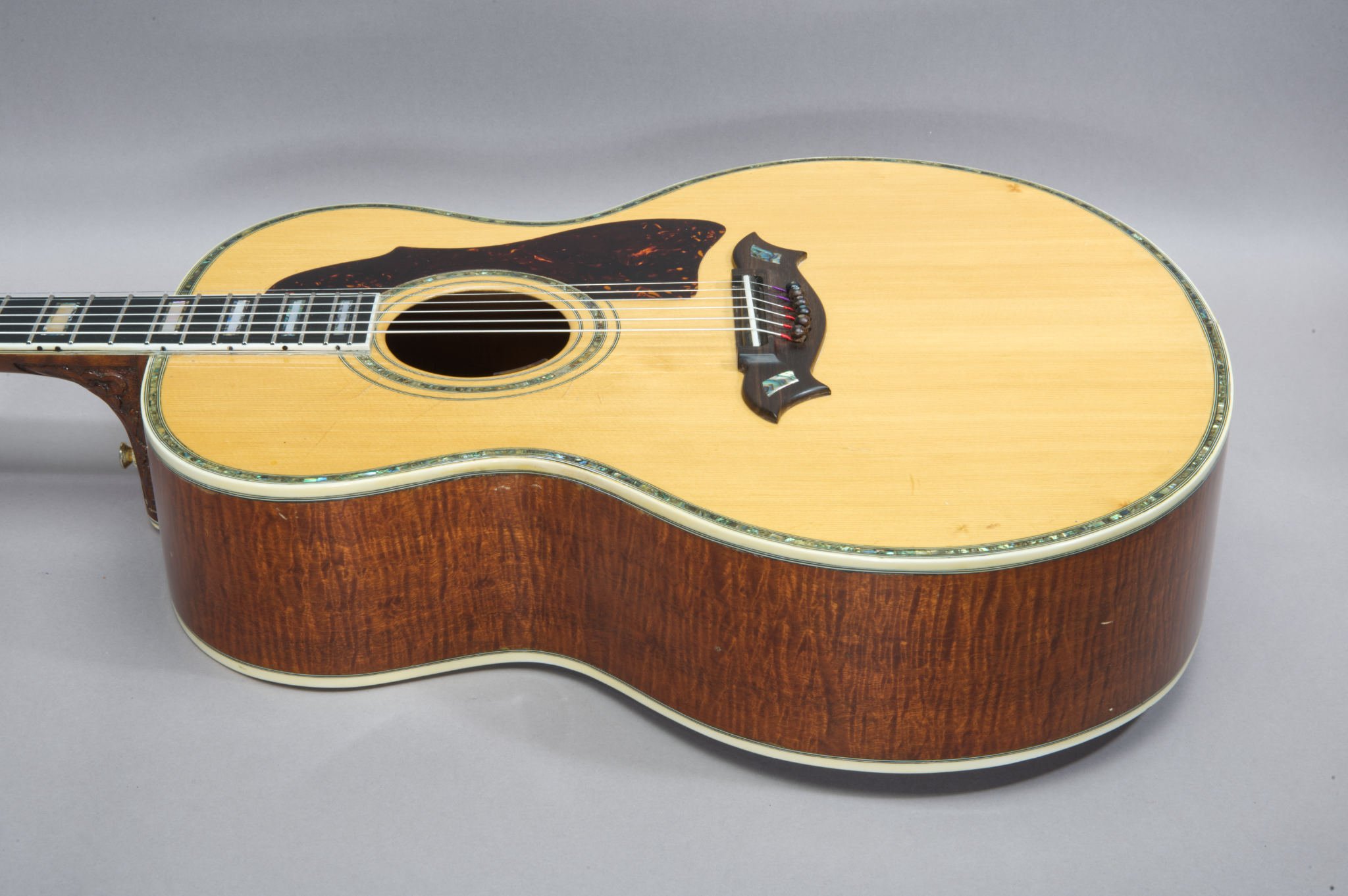 1 Piece Tabasco Mahogany Sides & 2 Piece Back with binding and Abalone Inlays.