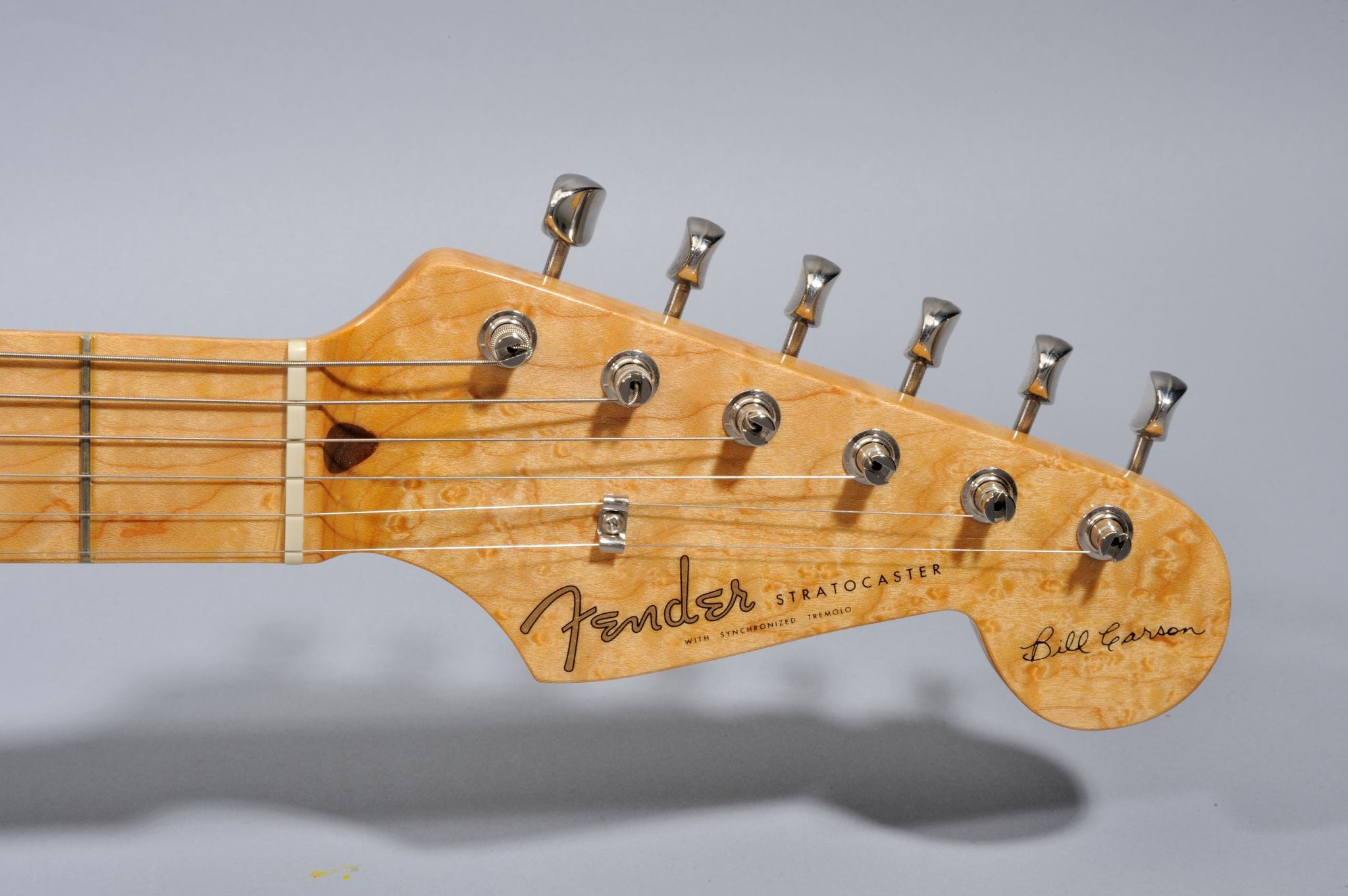 In July 1991, Don Schwartz, owner of Music Trader in Panama City Florida contacted John Grunder at the Fender Custom Shop to inquire about the design and construction of the "Bill Carson Stratocaster". Mr. Grunder was intrigued by the idea and after speaking to Mr. Carson and receiving confirmation from Fender Senior Management, started working on the exact design of the guitar. The Bill Carson Stratocaster was designed based on the year Bill Carson officially came onto the Fender payroll, as a full-time employee in 1957. The guitar is built to U.S. 57 Reissue specs with a highly figured specially shaped bird's eye maple neck and features Bill Carson's signature engraved on the neck plate and as a decal adjacent to the headstock logo. 100 guitars were planned to be issued.