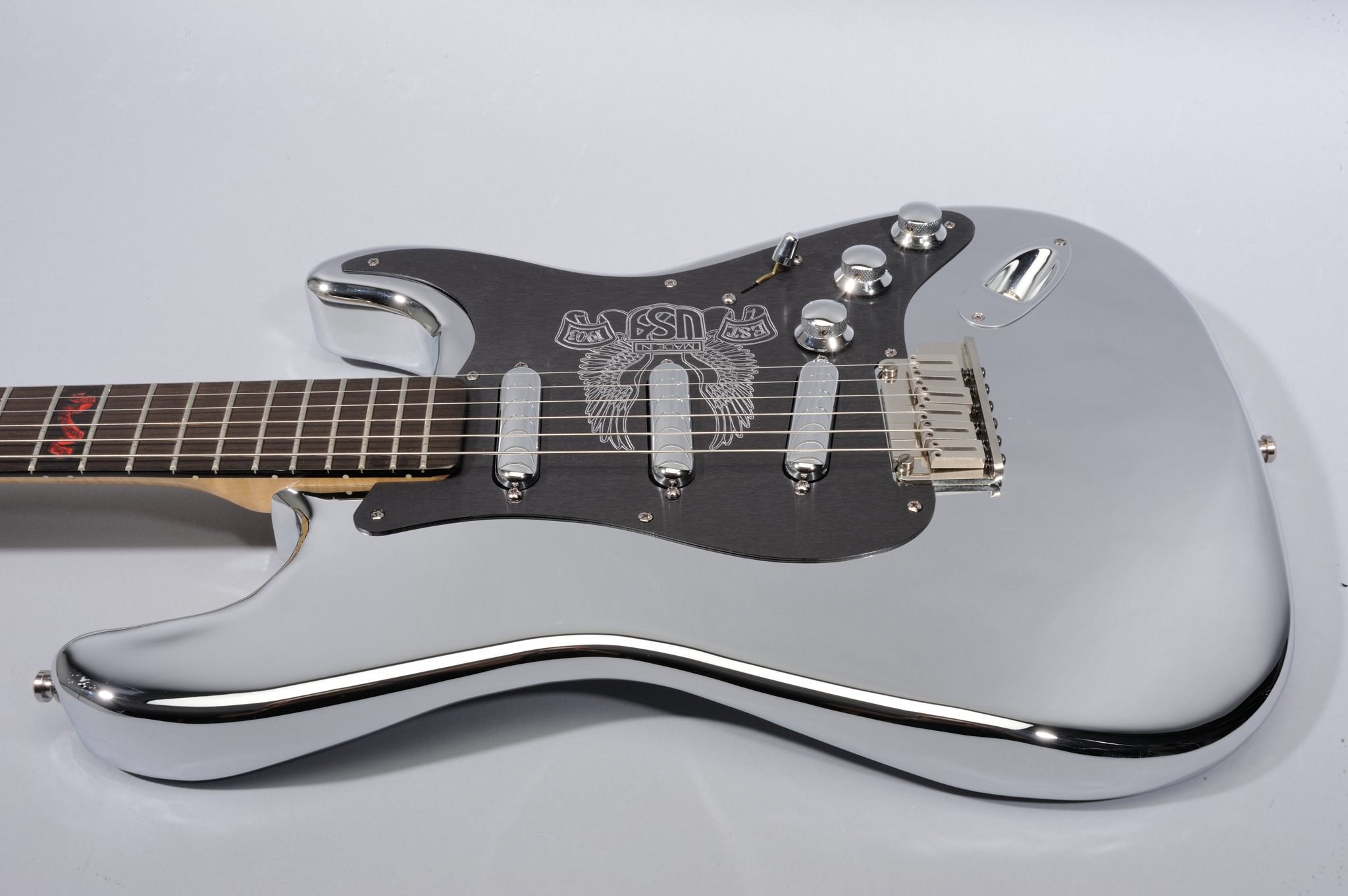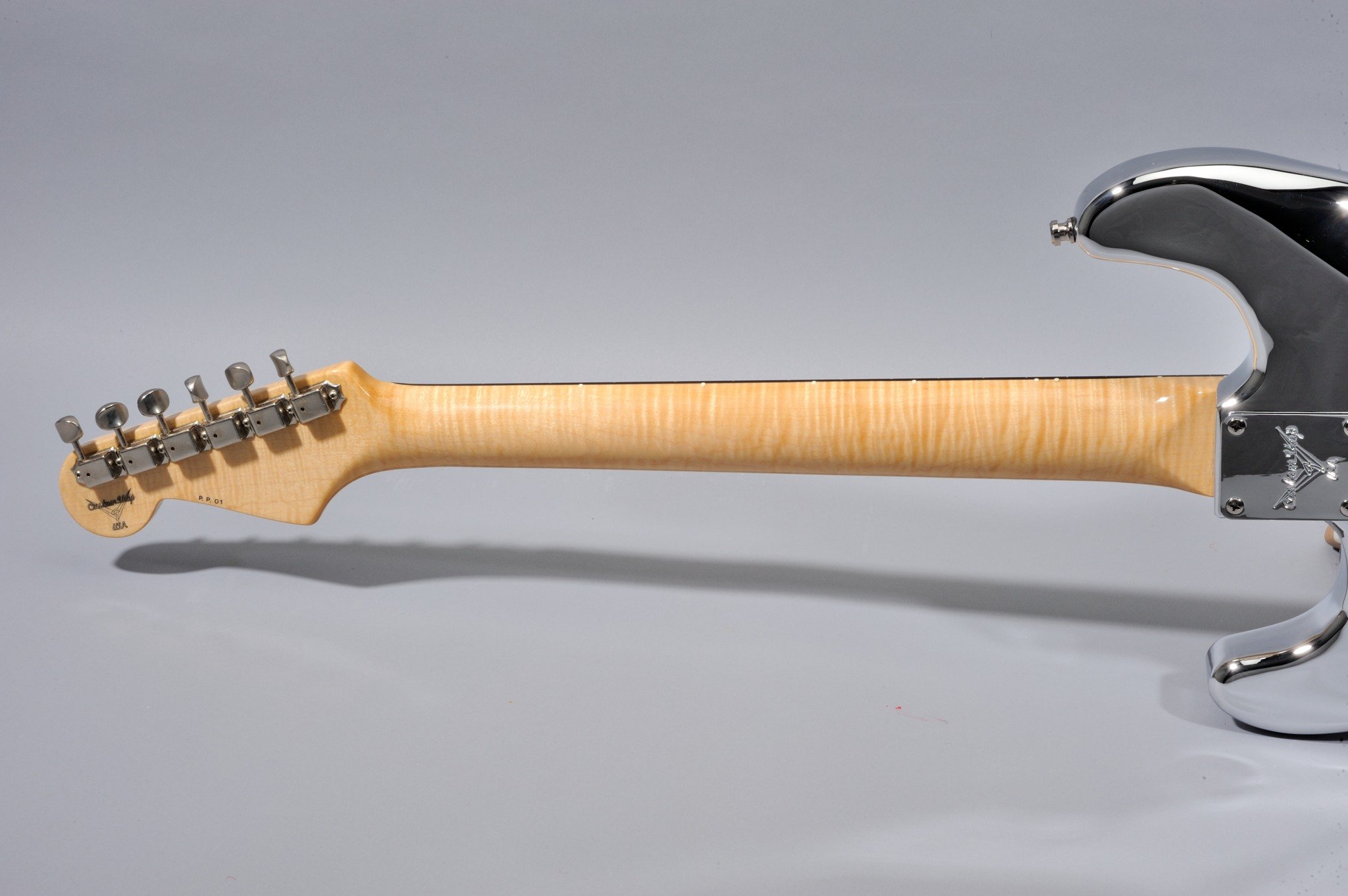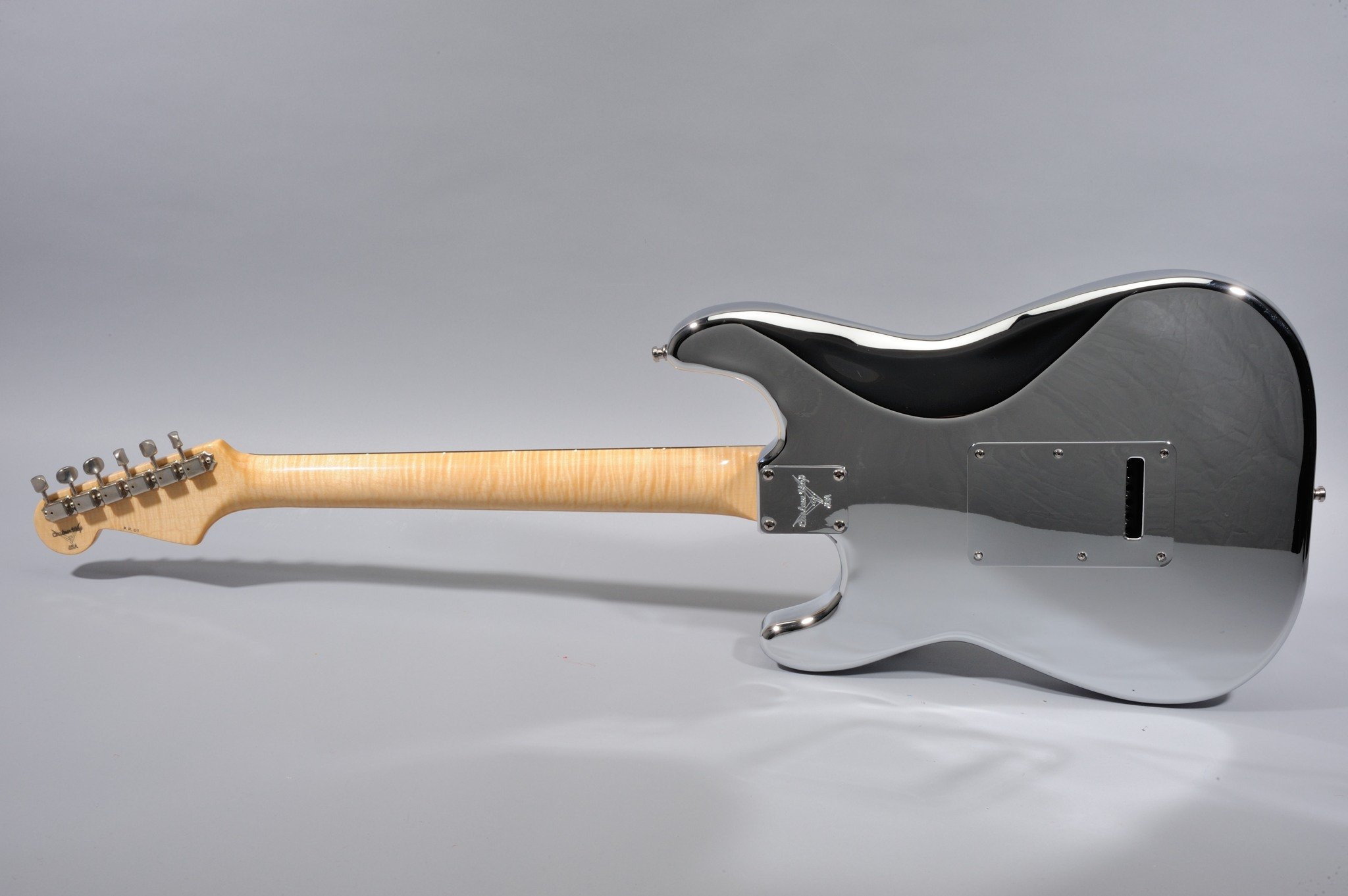 As for the other two HD Strats Chrome Prototypes, the Peghead Art is hand-painted by Pamelina Hovnatanian herself, and not silk-screened as on the production model.
