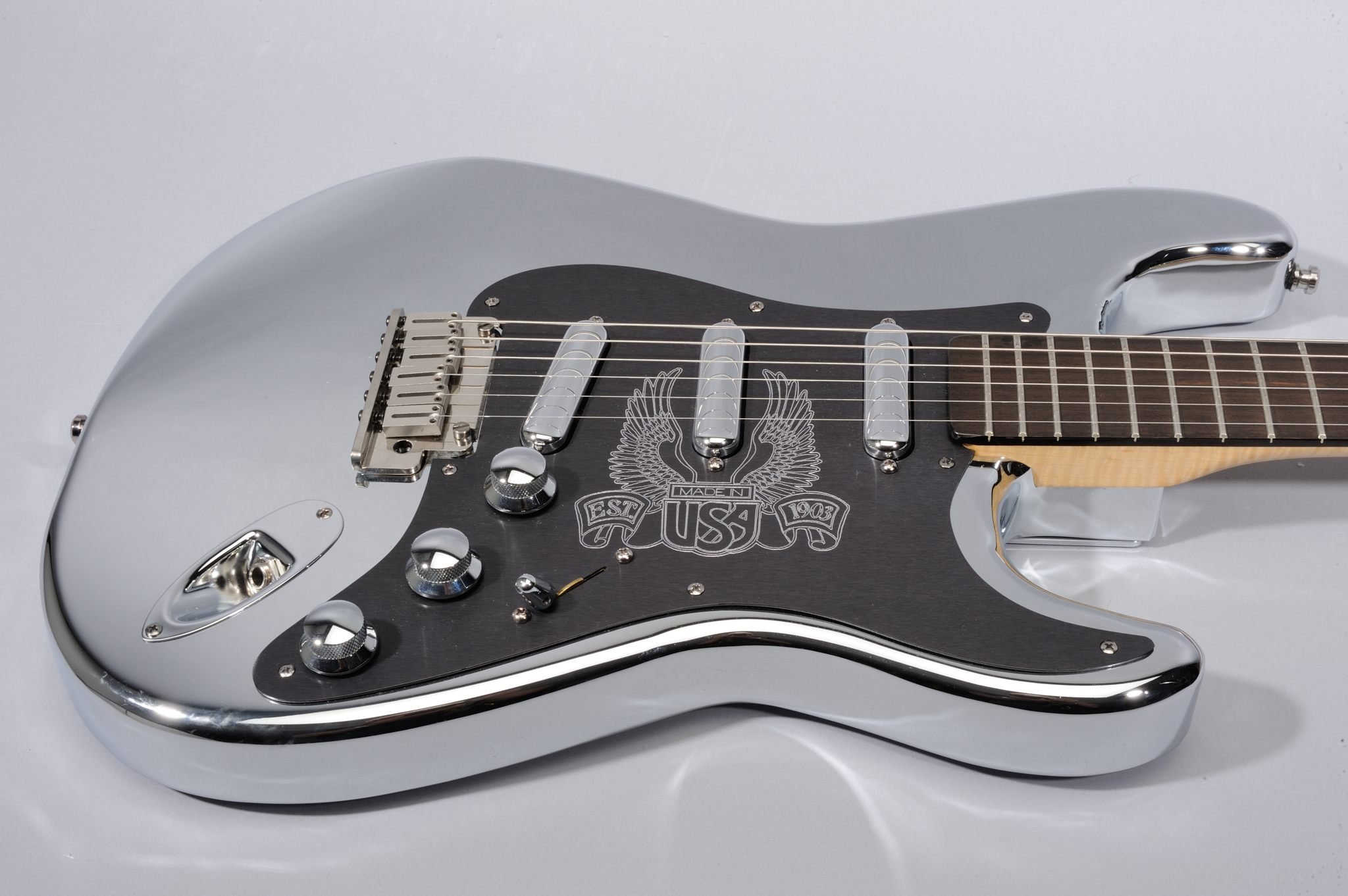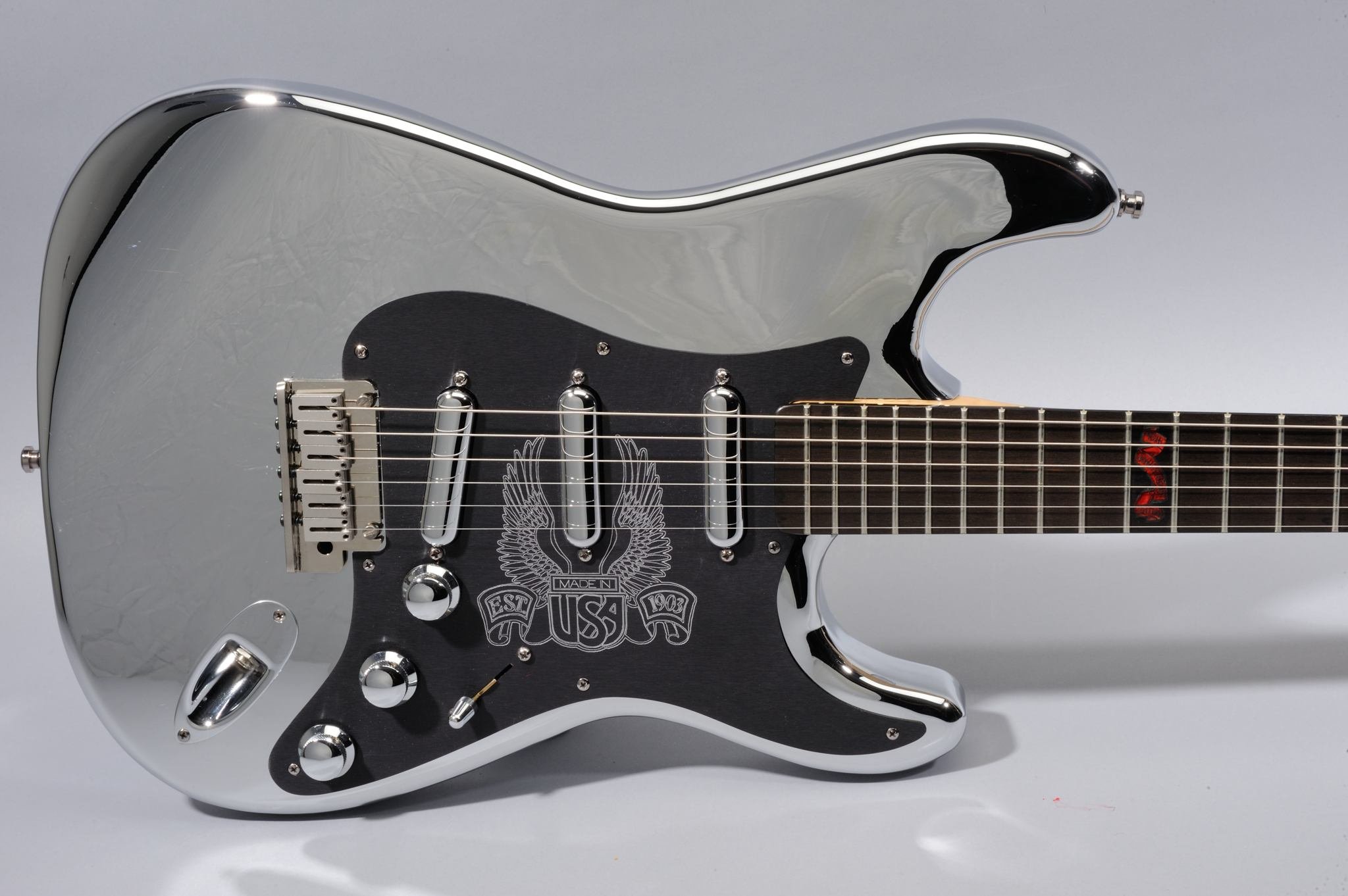 Engraved Black Anodized Aluminum Pickguard with Lipstick Chrome Pickups.