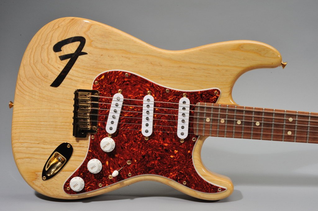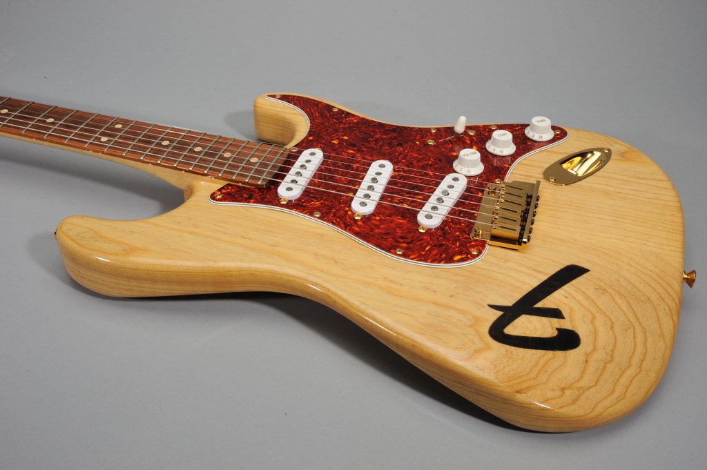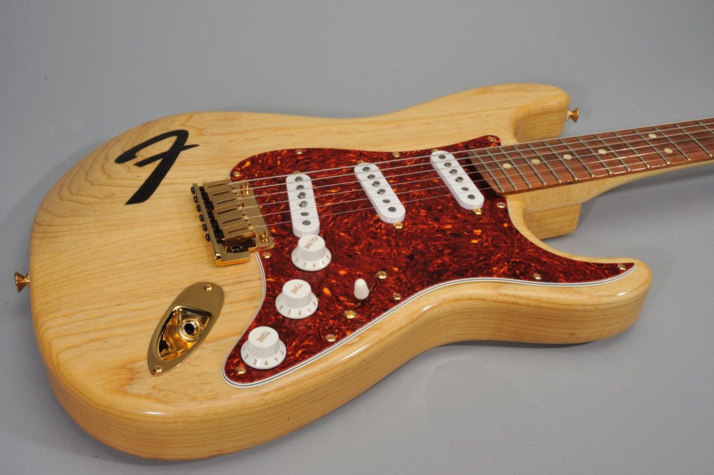 Highly Figured Swamp Ash Body in Vintage Natural Finish with F Brand on fore arm fold.