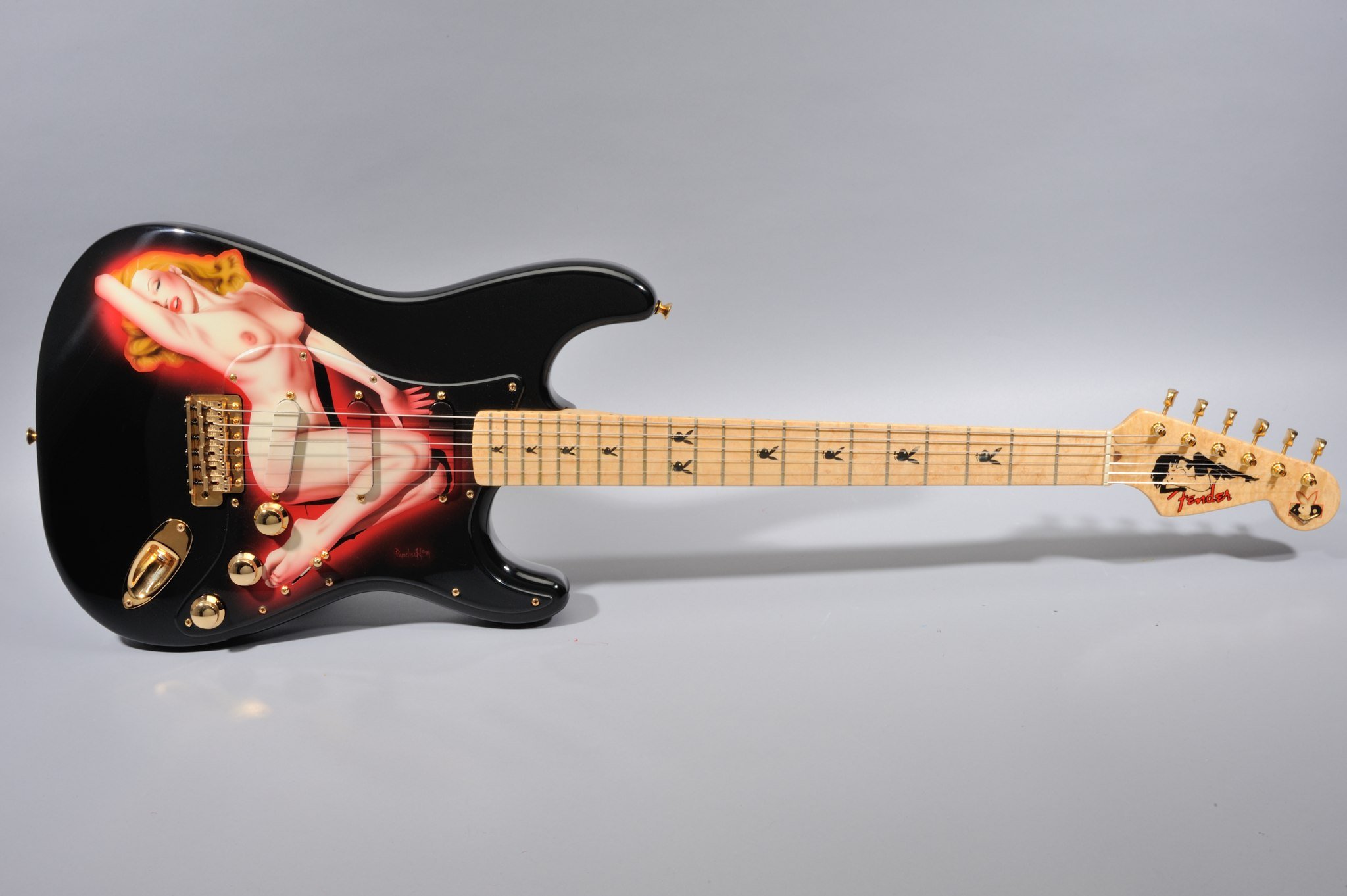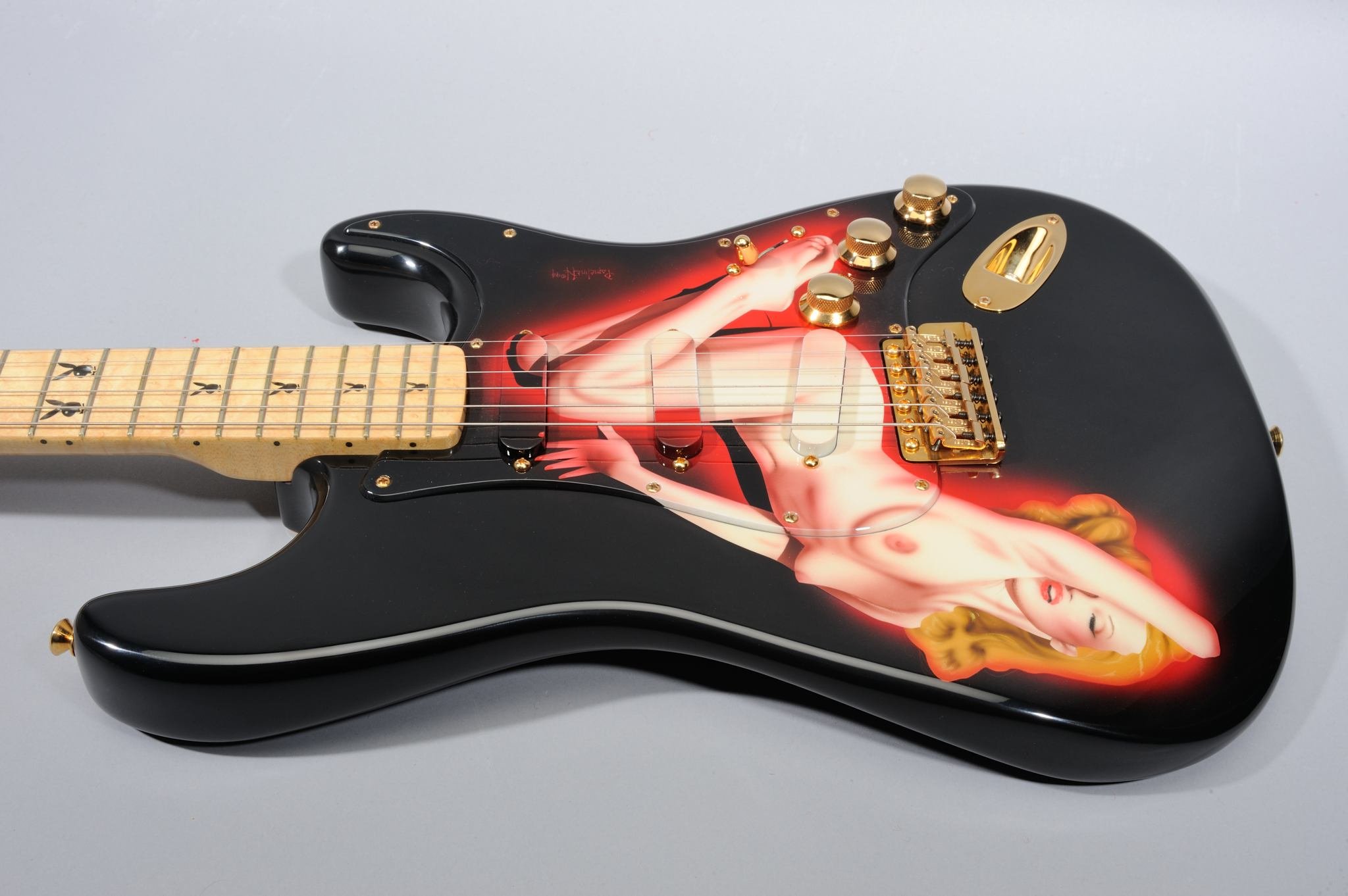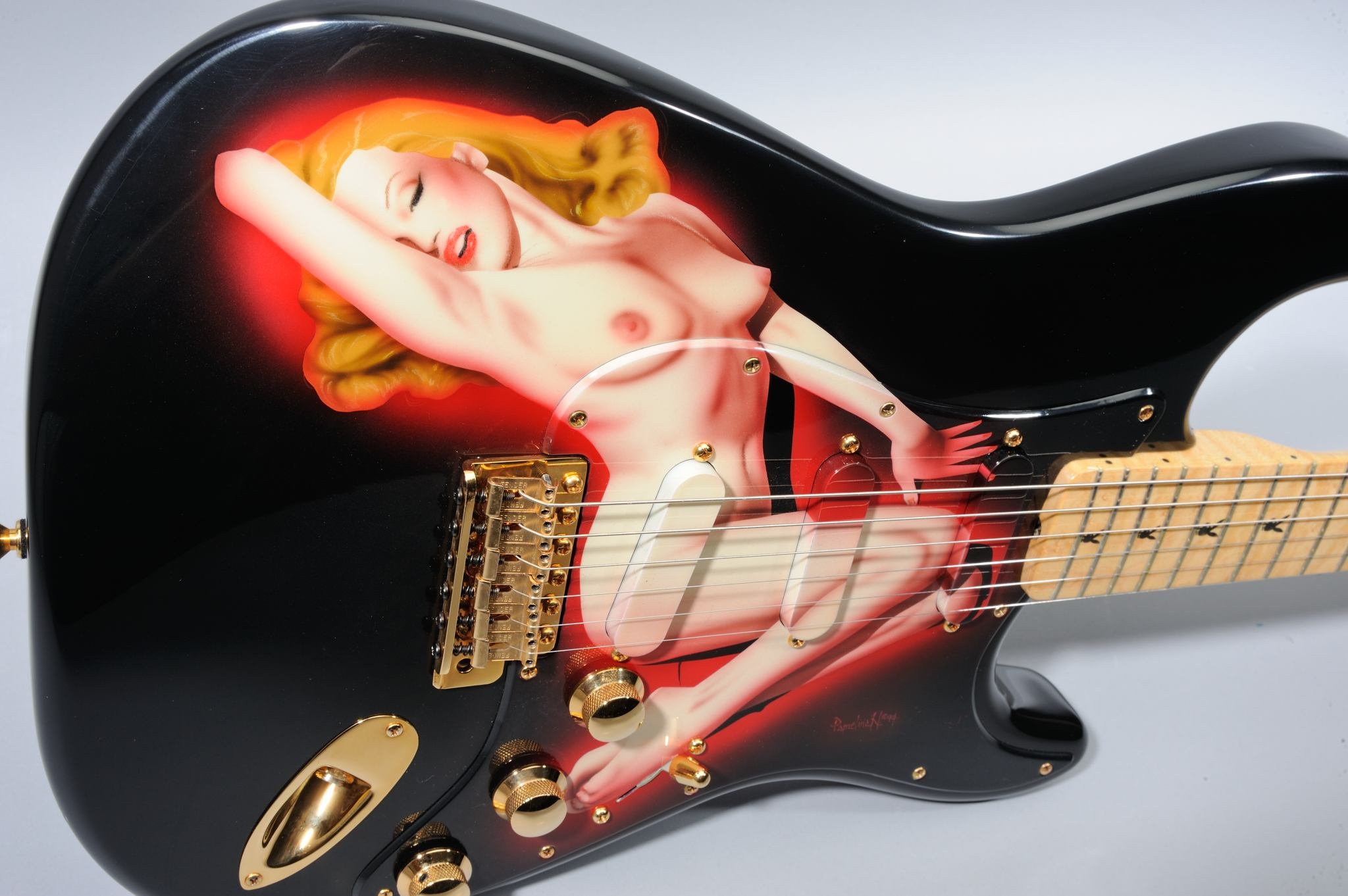 Her original design was rather tame; she felt it more appropriate for Fender. But, as she told the SCND, “the guitar with my original ‘no nude’ design was presented to Playboy and scrubbed. They asked if, instead, the first pin-up of Marilyn Monroe could be done…I painted the Marilyns for a year…"