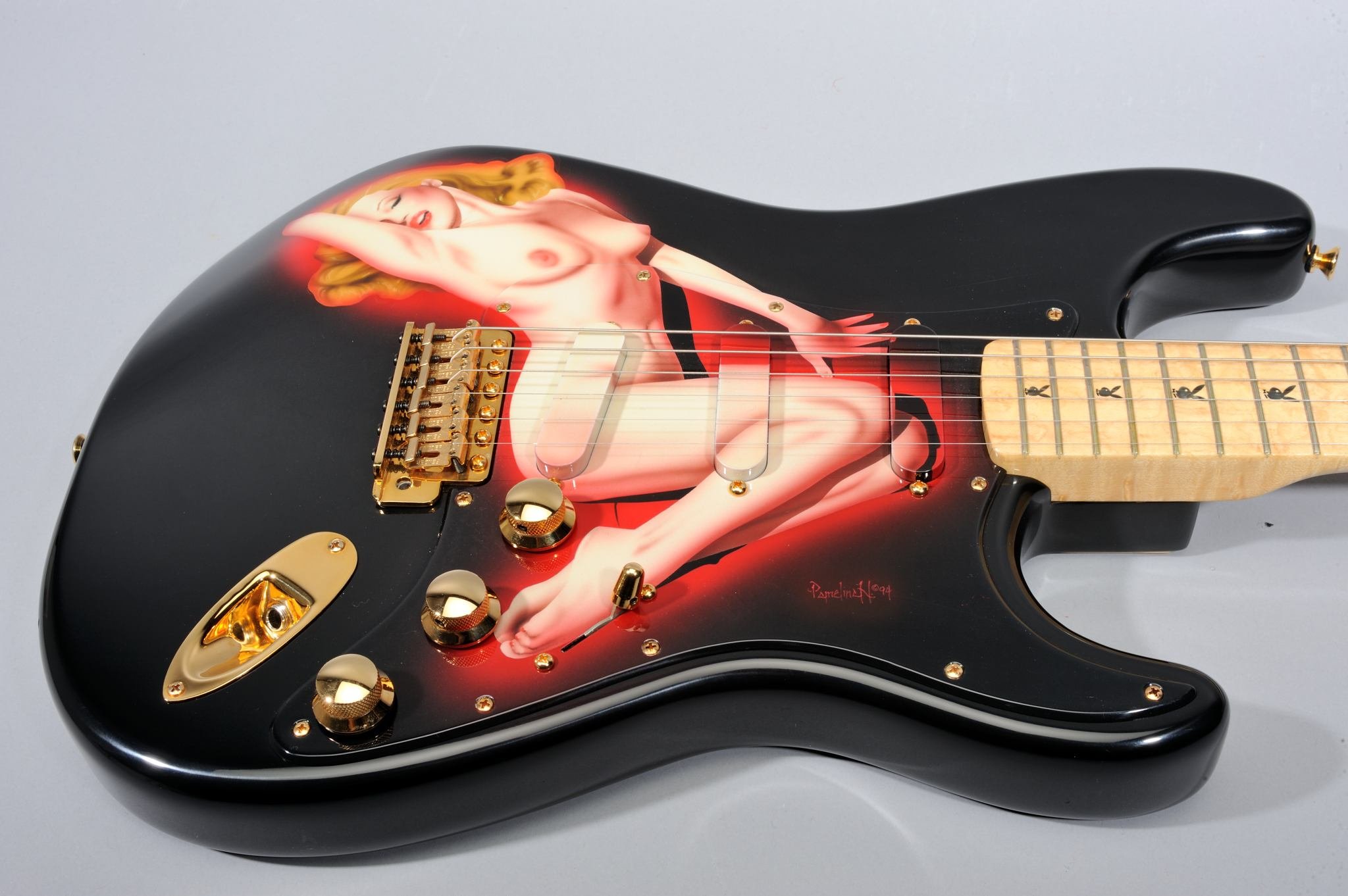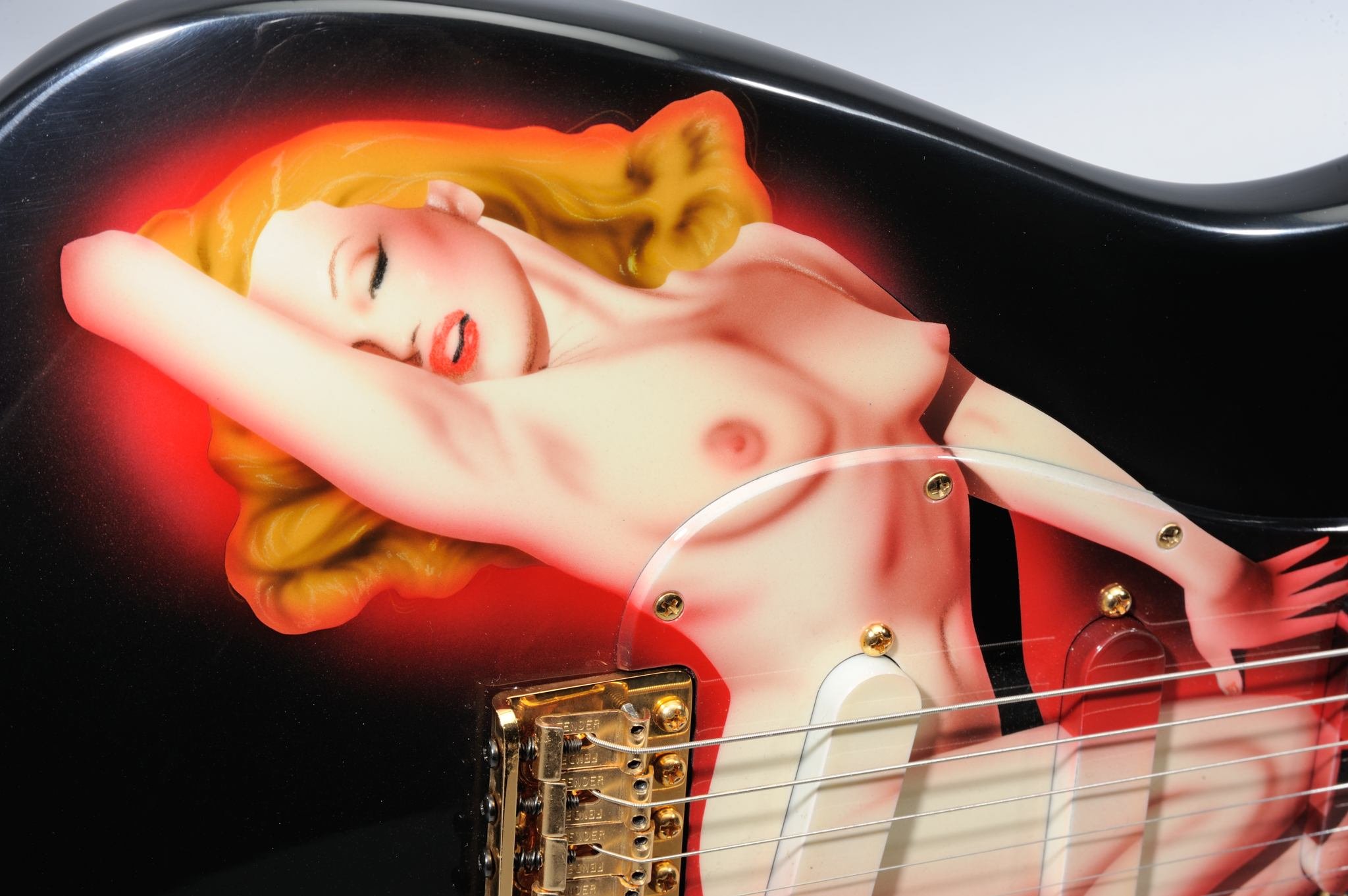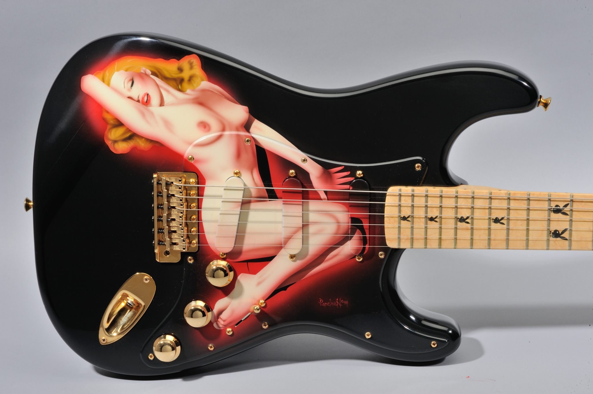 Her original design was rather tame; she felt it more appropriate for Fender. But, as she told the SCND, “the guitar with my original ‘no nude’ design was presented to Playboy and scrubbed. They asked if, instead, the first pin-up of Marilyn Monroe could be done…I painted the Marilyns for a year…"