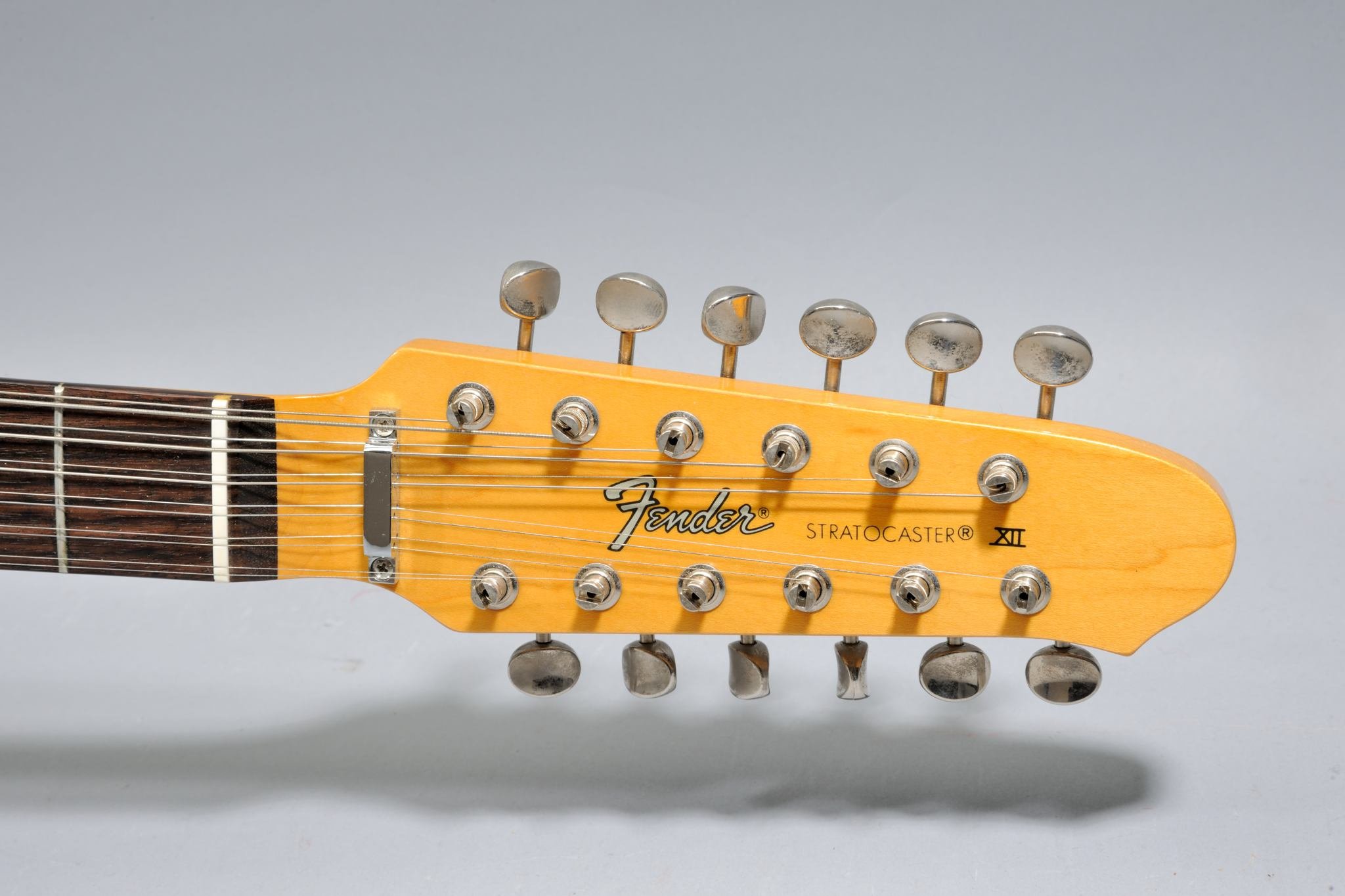 Made in Japan and introduced in 1988, the Strat XII had most customary Stratocaster features and design elements, with the additions of a special 12-saddle bridge and a large headstock with a brand-new shape to accommodate six tuners on each side.