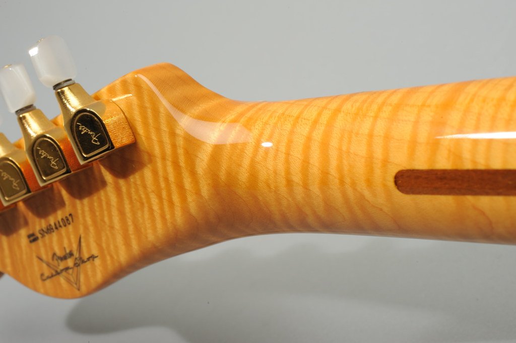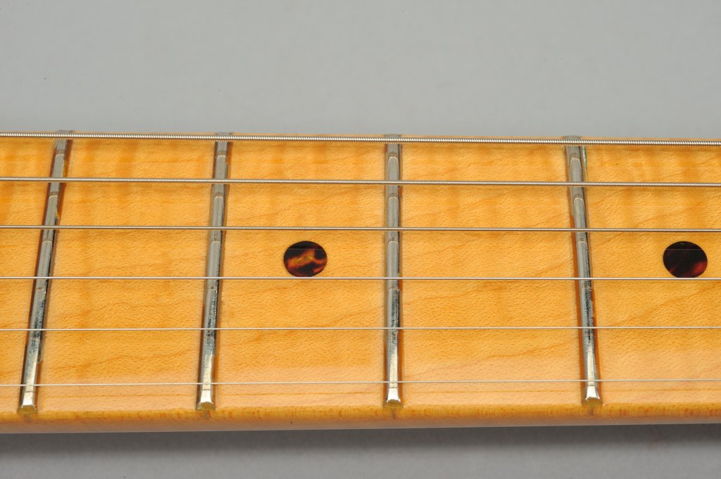 1 Piece Stripe Flame Maple Neck and Fretboard with Tortoise Dots.