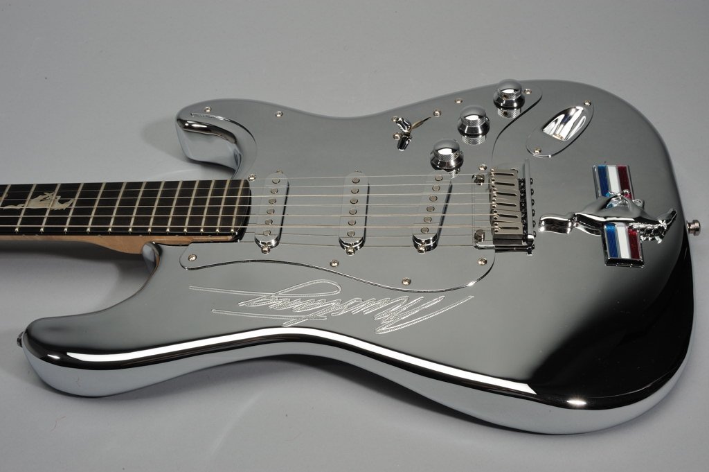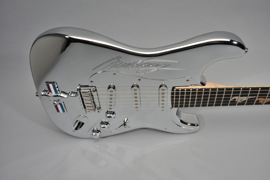 As part of the celebration, Fender®’s Custom Shop created thirty-five limited edition chrome Stratocaster® guitars, and Ford kicked in one very souped-up, custom-made 1999 Mustang® GT convertible that was customized by Classic Design Concepts.