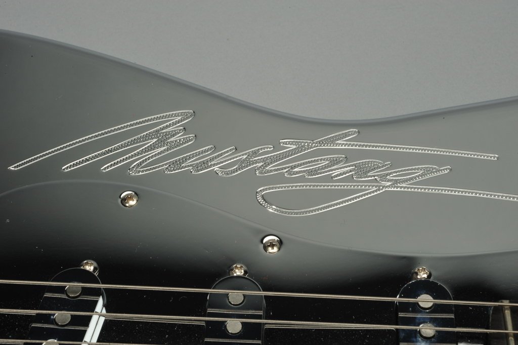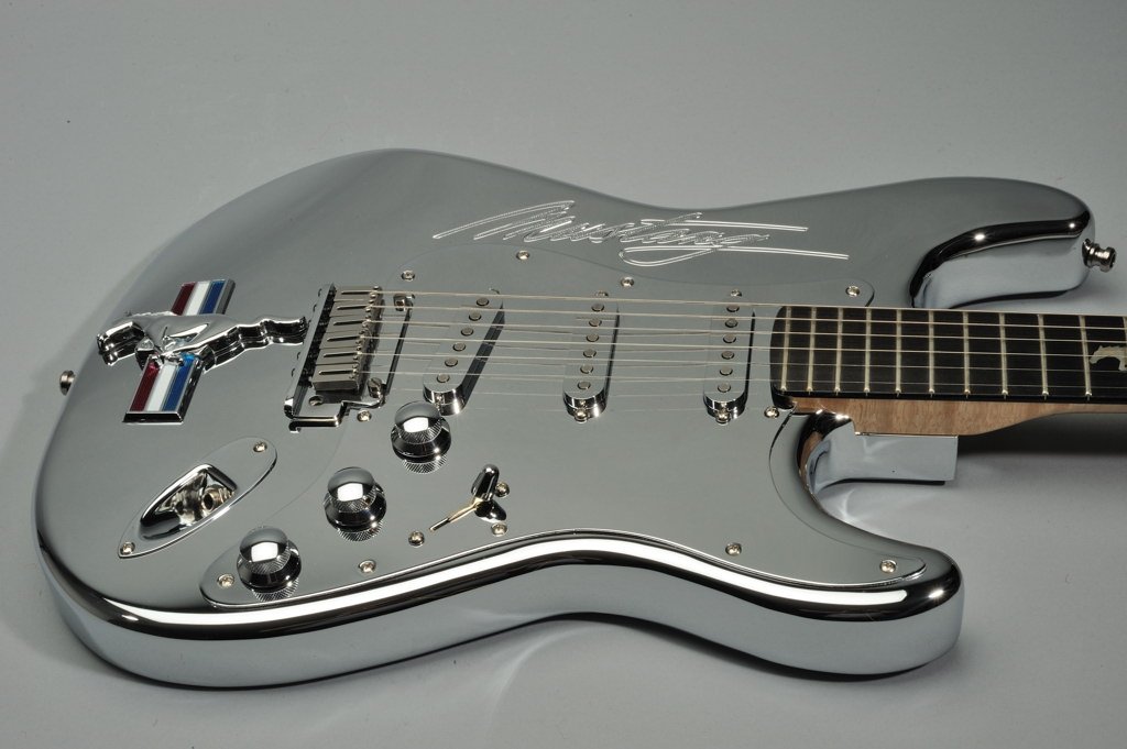 The custom Strats are chromed aluminum guitars, and feature “Running Mustang®” inlays on their ebony fingerboards. To top that, Fender® added an original Mustang® emblem just behind the tailpiece, and original Mustang® radio knobs for the volume and tone controls. Fifteen of the guitars went to lucky concert -goers, one for each stop of the tour, while one very special winner took home the Mustang®.