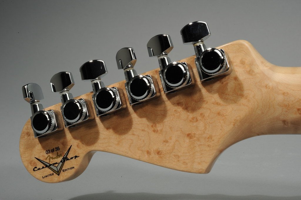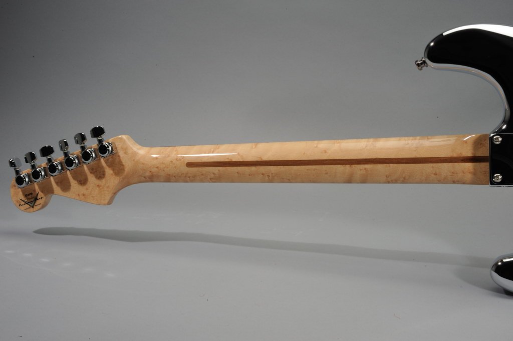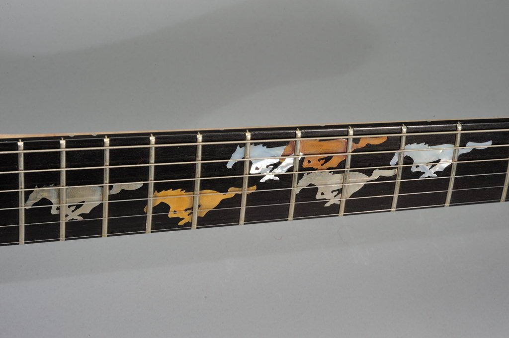 1 Piece Birdseye Maple Neck with Ebony Fretboard inlaid with Running Mustangs cut from Various Metals and Mother of Pearl.