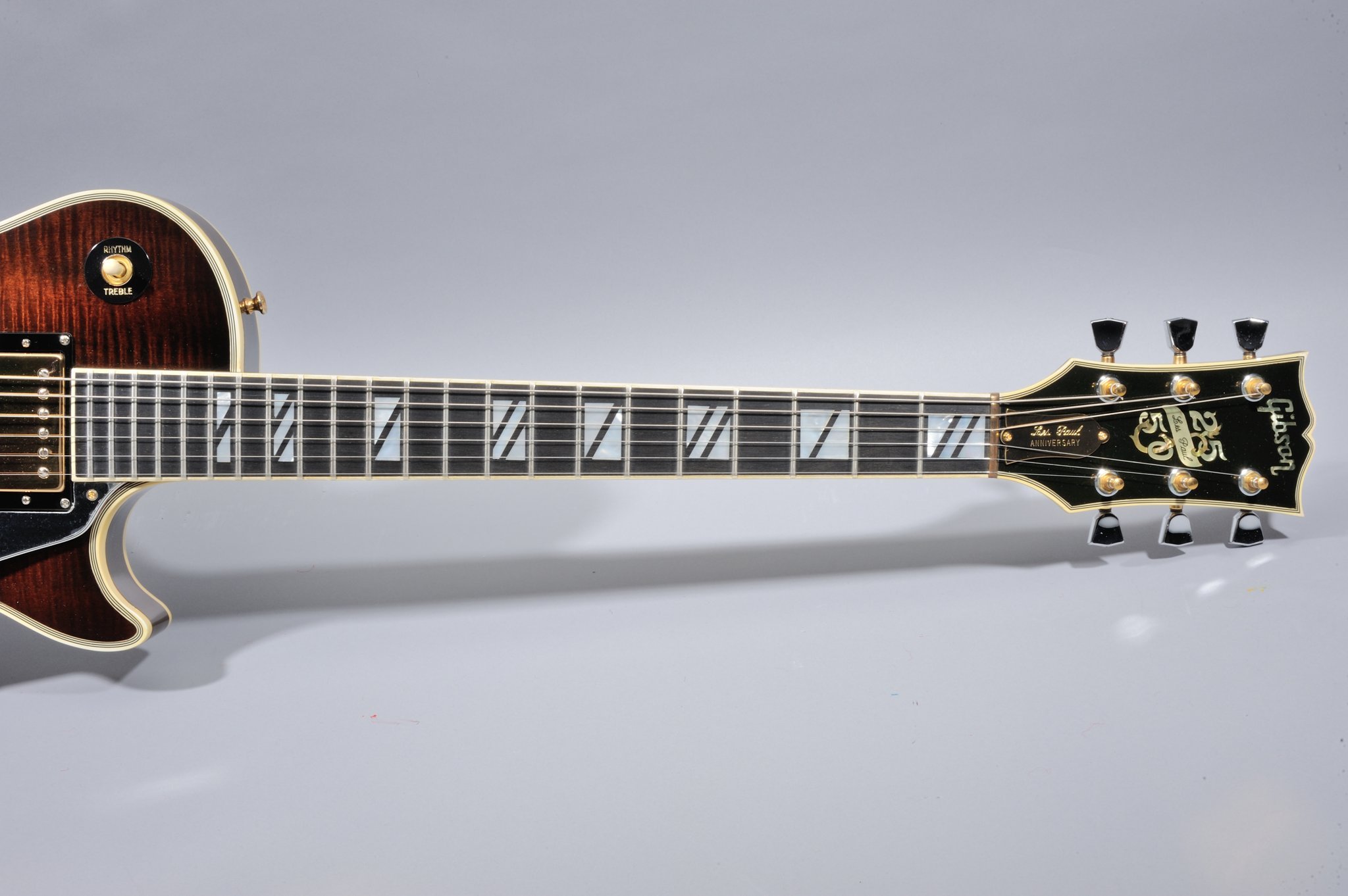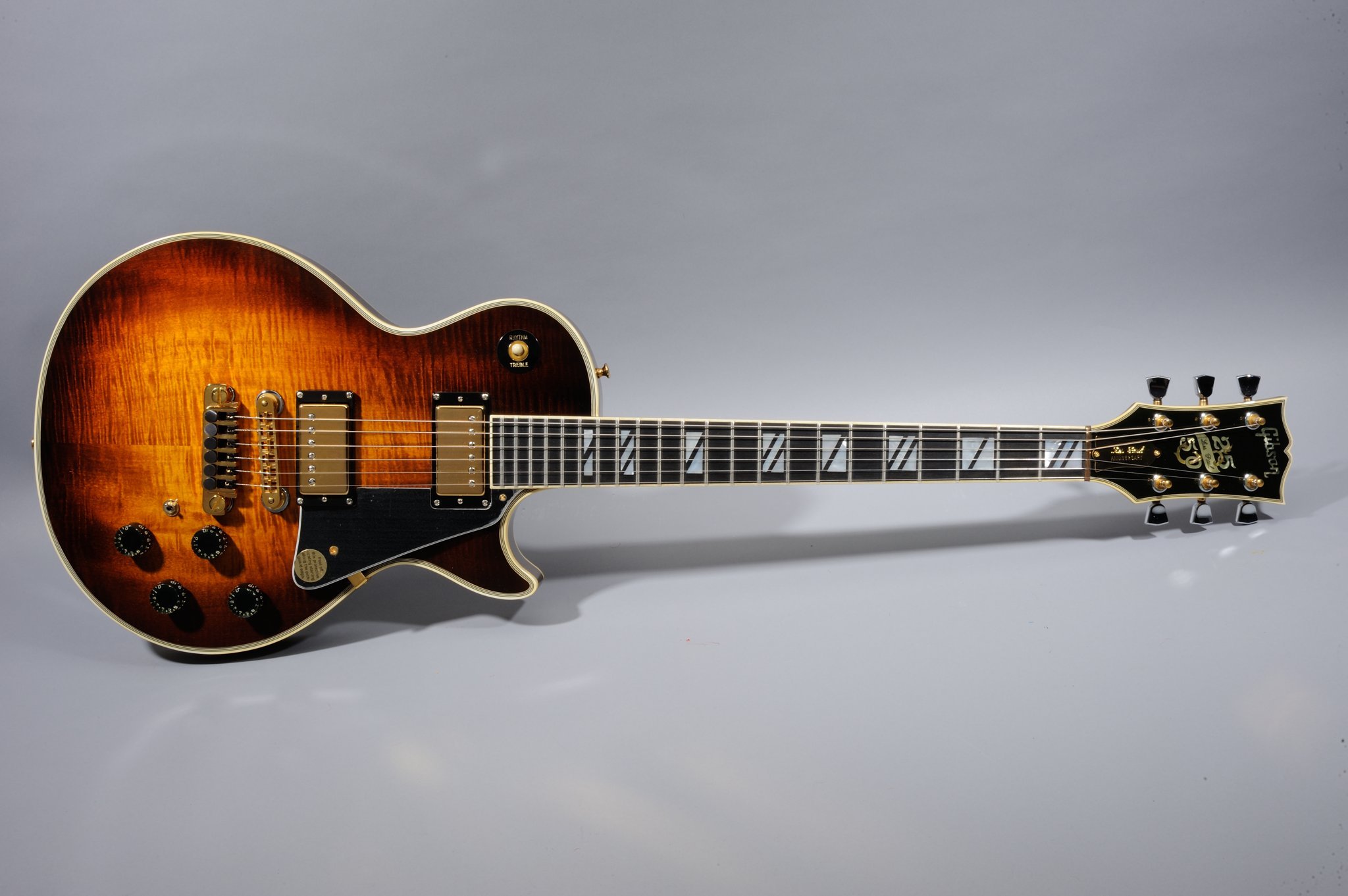 The 25/50 model is a distinctive model in the Les Paul lineage for many reasons, including the unique and intricate pearl and abalone "25/50" headstock inlay design, creative use of silver and gold hardware combinations (e.g., the tuners are gold with silver buttons), abalone side dot marker inlays, beautiful flamed maple top, five piece flamed maple neck, split block parallelogram inlays (one of only two Les Paul production models to sport these inlays), large control cavity, gold truss rod cover inscribed with "Les Paul Anniversary", brass nut, and a coil tap mini-switch (one of the few production Les Pauls with a coil tap until the Jimmy Page Les Paul was introduced).