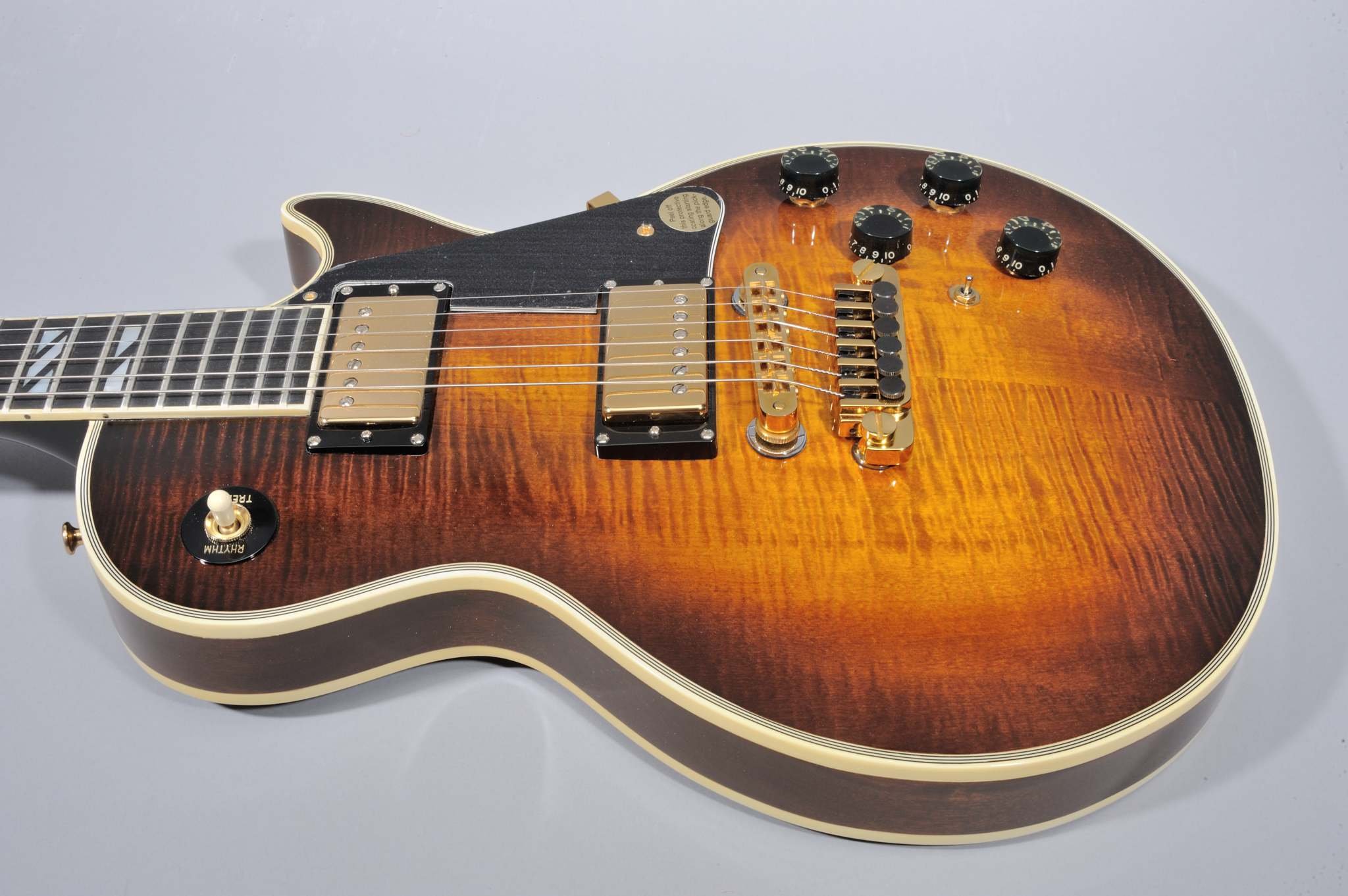 In addition to the above unique features, the 25/50 had multi-ply binding on the front and back of the body and the front of the headstock, a volute, Nashville bridge with TP-6 fine tuning tailpiece, black speed knobs, Schaller style "Gibson" tuners, and Series VII pickups. These Series VII pickups were potted with a black, rubber-like material that fills the gold covers and makes these pickups virtually impossible to remove from their covers for repair.