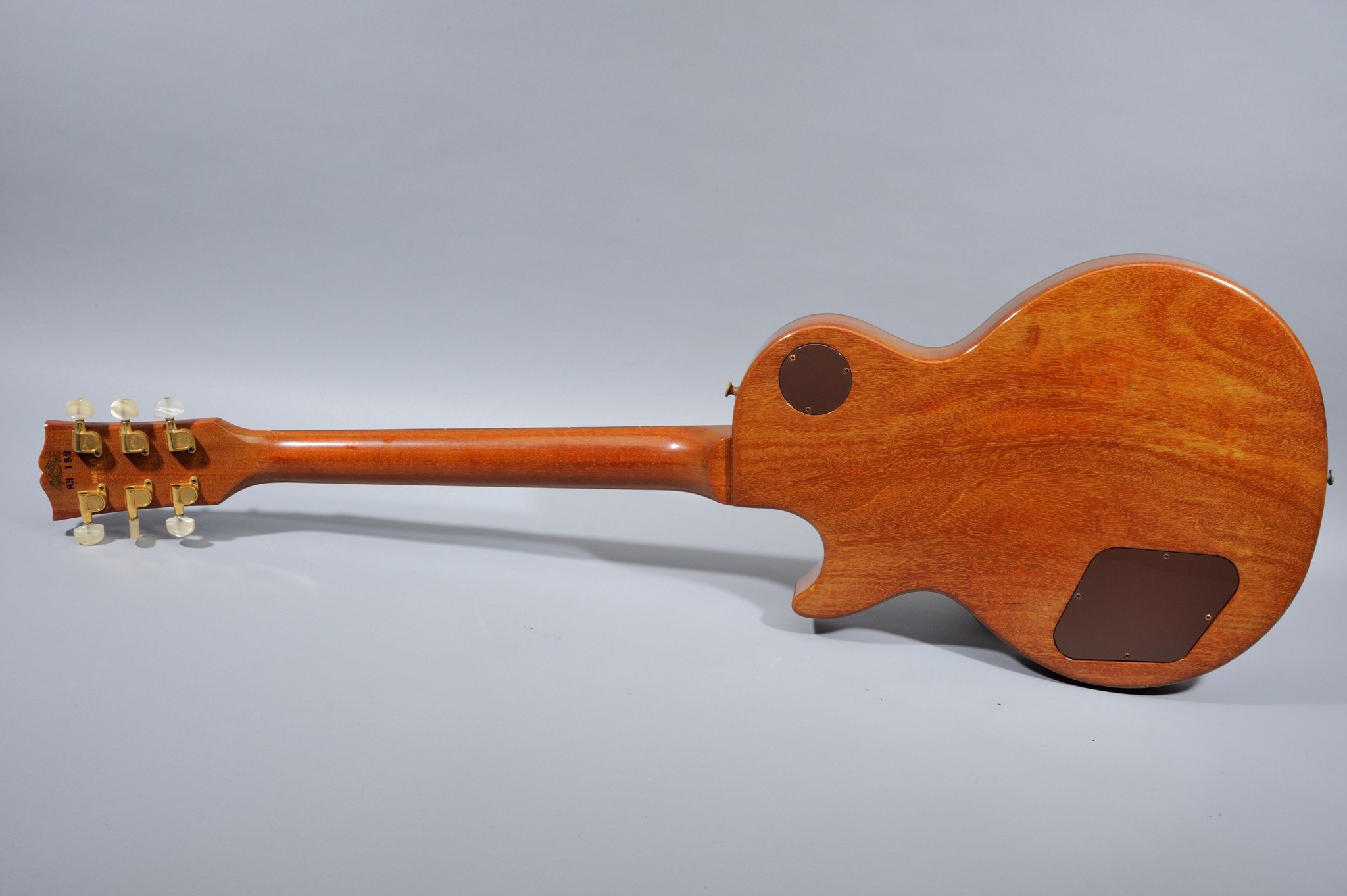 The ANT model (antique natural) came with a "...highly-figured curly maple top," brown binding with two cream pinstripes on the body and one cream pinstripe on the neck, a walnut head veneer in light stain with Gibson logo inlay, and individual pearloid kidney-shaped machine heads. ANT models are definitely the more exotic-looking of the two because of the color, contrasting dark binding, and less-common tuner buttons. Among the ANT models on the market there is less variation in color (all are antique natural, some more gracefully aged), but again, the grade/quality of the curly maple tops and the attention to bookmatching is highly variable.