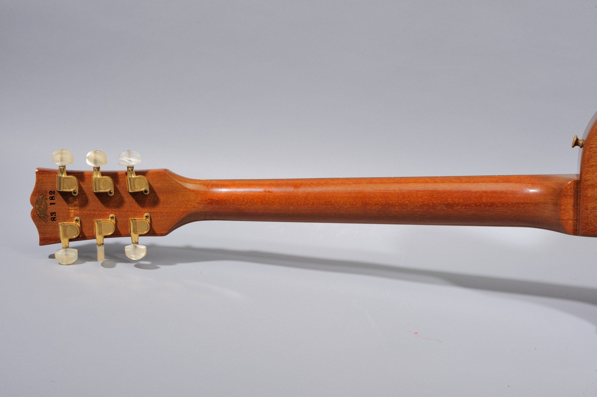 The ASB model (antique sunburst) came with a "...highly figured quilted maple top," solid cream-colored binding, traditional ebony head veneer with Gibson pearl inlay, and traditional keystone-shaped machine heads (probably all with double-ringed tuners). There is tremendous variation in the colors (dark tobacco to lighter brown, and at least one in three-color sunburst) and grade/quality of the quilted tops. It also appears some workers were meticulous about bookmatching the tops, while others picked up whatever was available - maybe they thought nobody would notice the sides didn't match because they were separated by a 2" walnut strip?