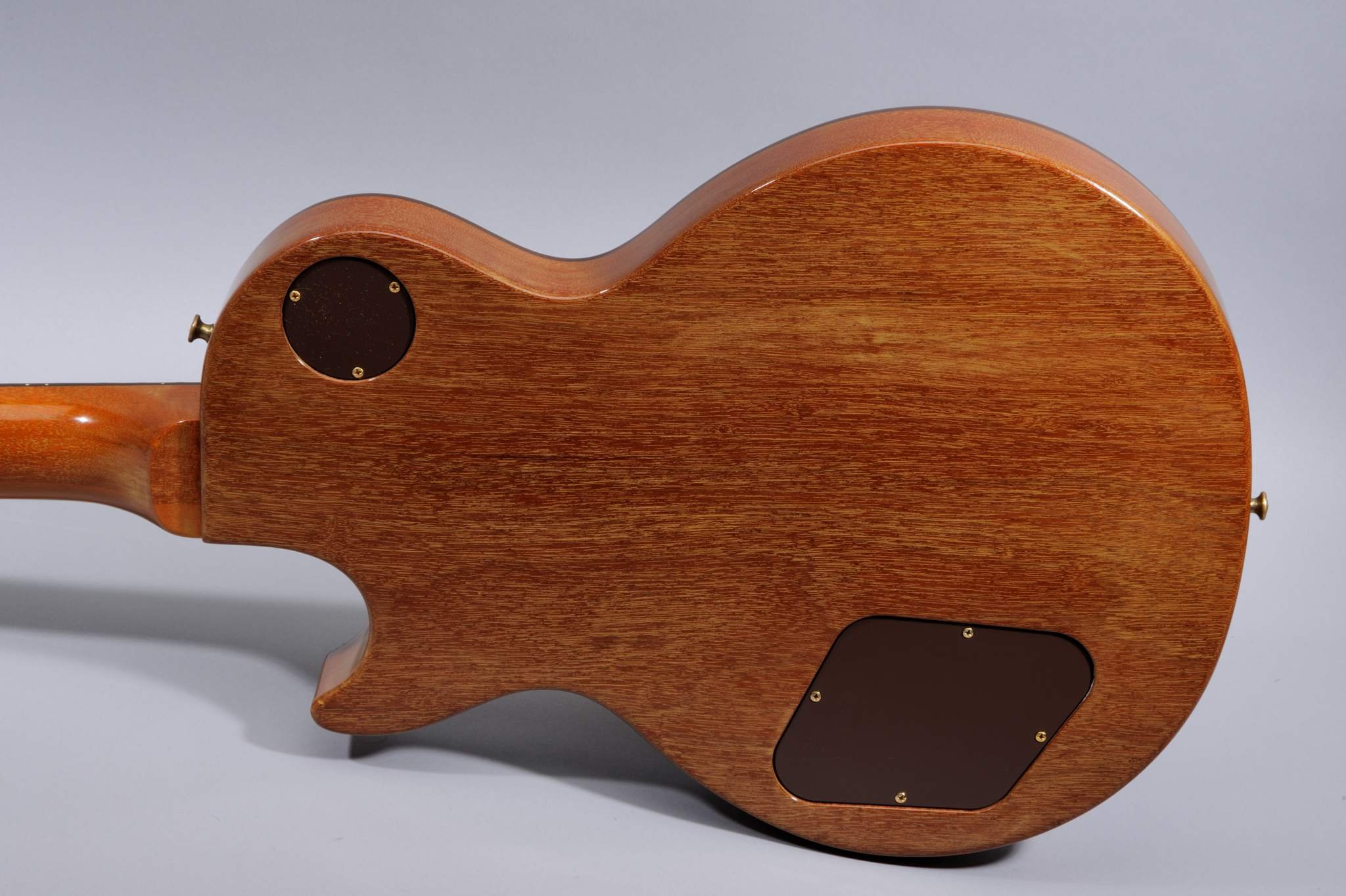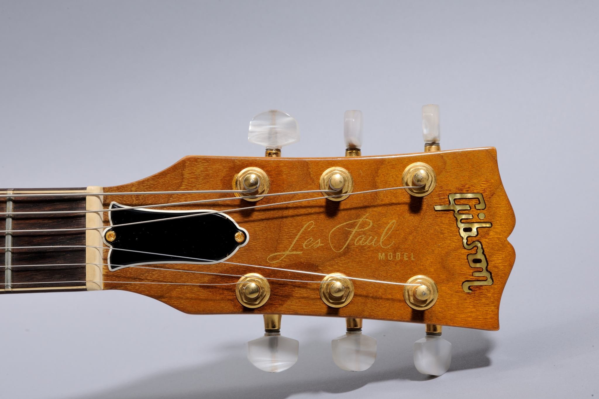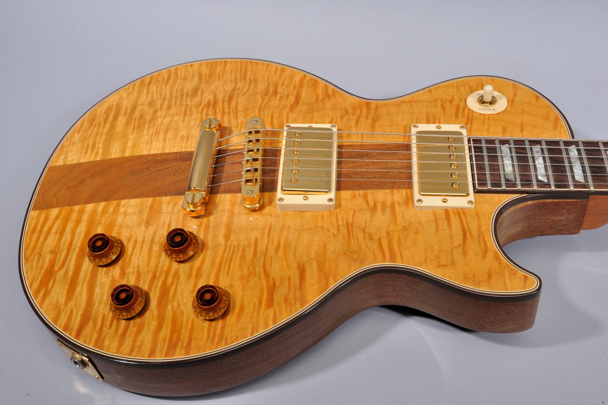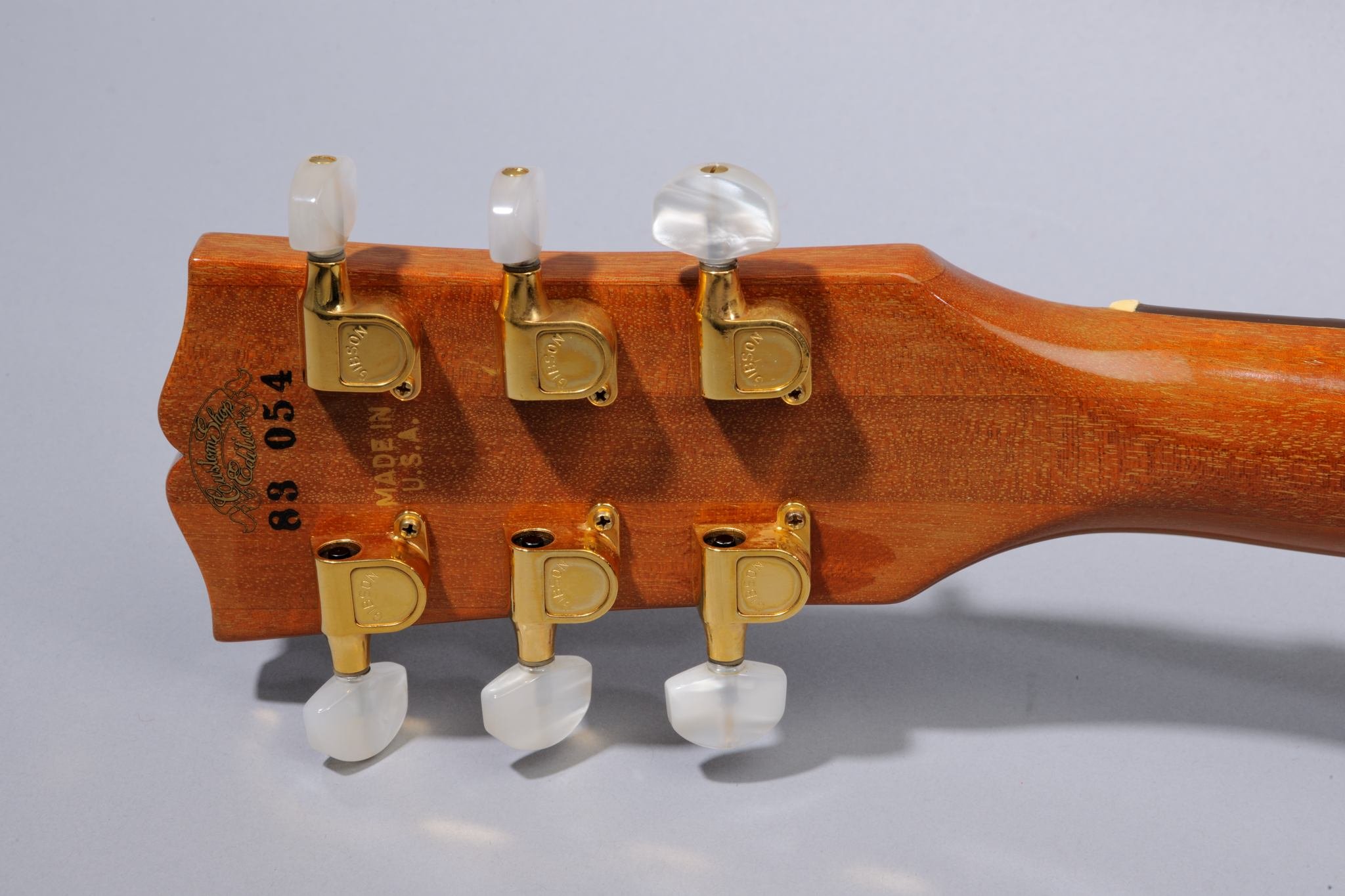 The ANT model (antique natural) came with a "...highly-figured curly maple top," brown binding with two cream pinstripes on the body and one cream pinstripe on the neck, a walnut head veneer in light stain with Gibson logo inlay, and individual pearloid kidney-shaped machine heads. ANT models are definitely the more exotic-looking of the two because of the color, contrasting dark binding, and less-common tuner buttons. Among the ANT models on the market there is less variation in color (all are antique natural, some more gracefully aged), but again, the grade/quality of the curly maple tops and the attention to bookmatching is highly variable.