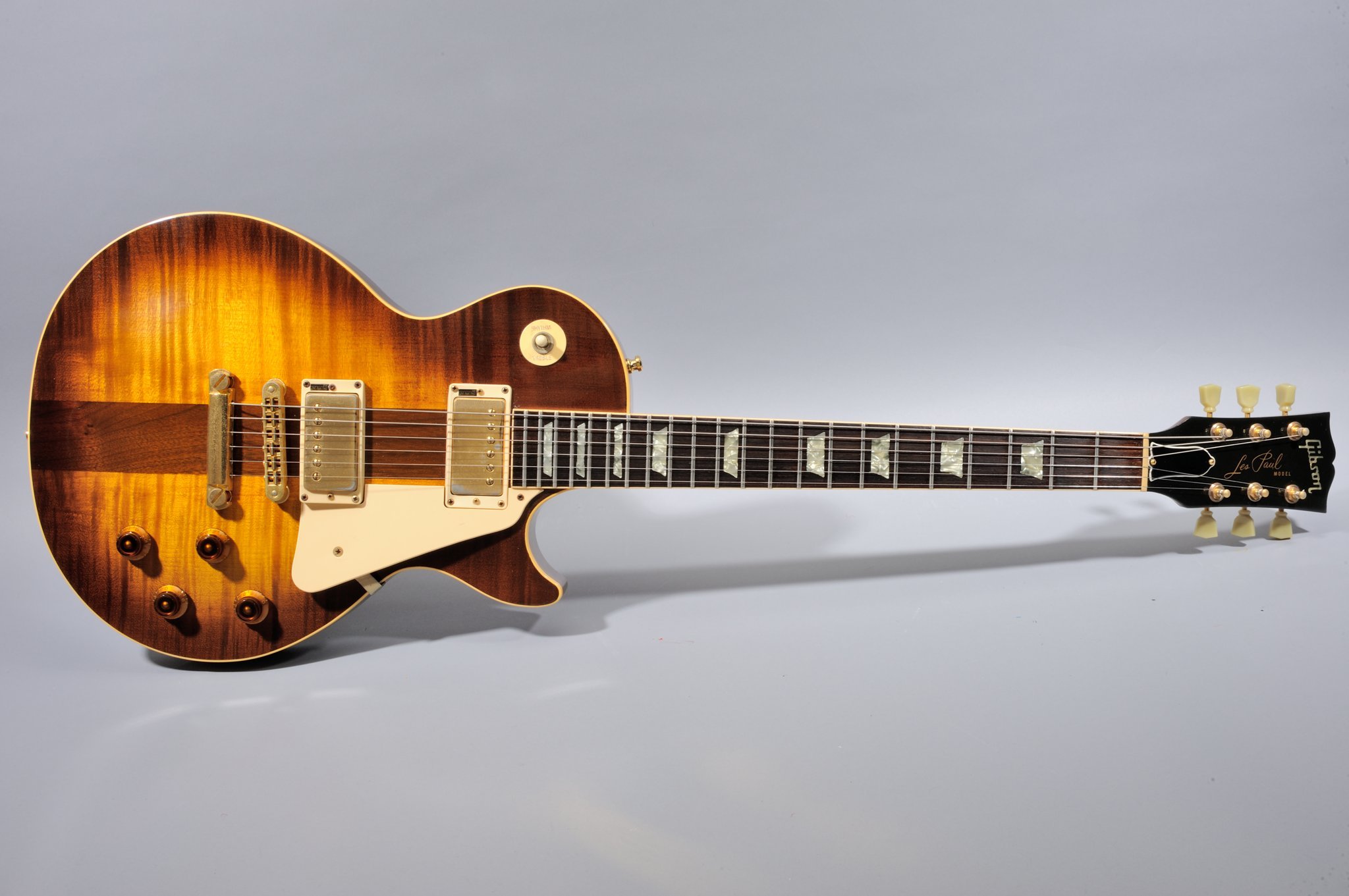 The ASB model (antique sunburst) came with a "...highly figured quilted maple top," solid cream-colored binding, traditional ebony head veneer with Gibson pearl inlay, and traditional keystone-shaped machine heads (probably all with double-ringed tuners). There is tremendous variation in the colors (dark tobacco to lighter brown, and at least one in three-color sunburst) and grade/quality of the quilted tops. It also appears some workers were meticulous about bookmatching the tops, while others picked up whatever was available - maybe they thought nobody would notice the sides didn't match because they were separated by a 2" walnut strip?