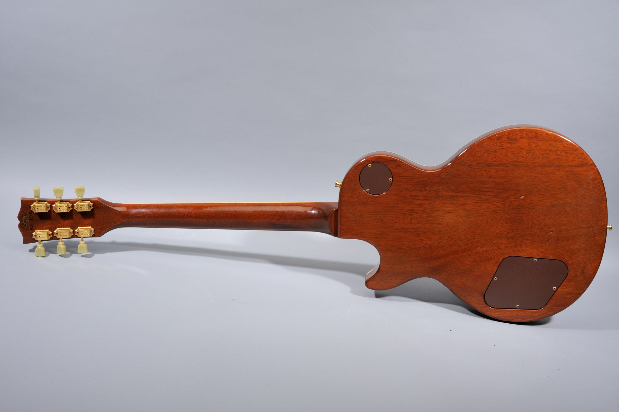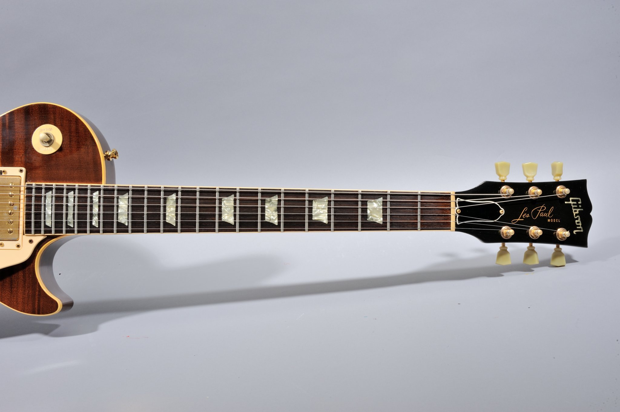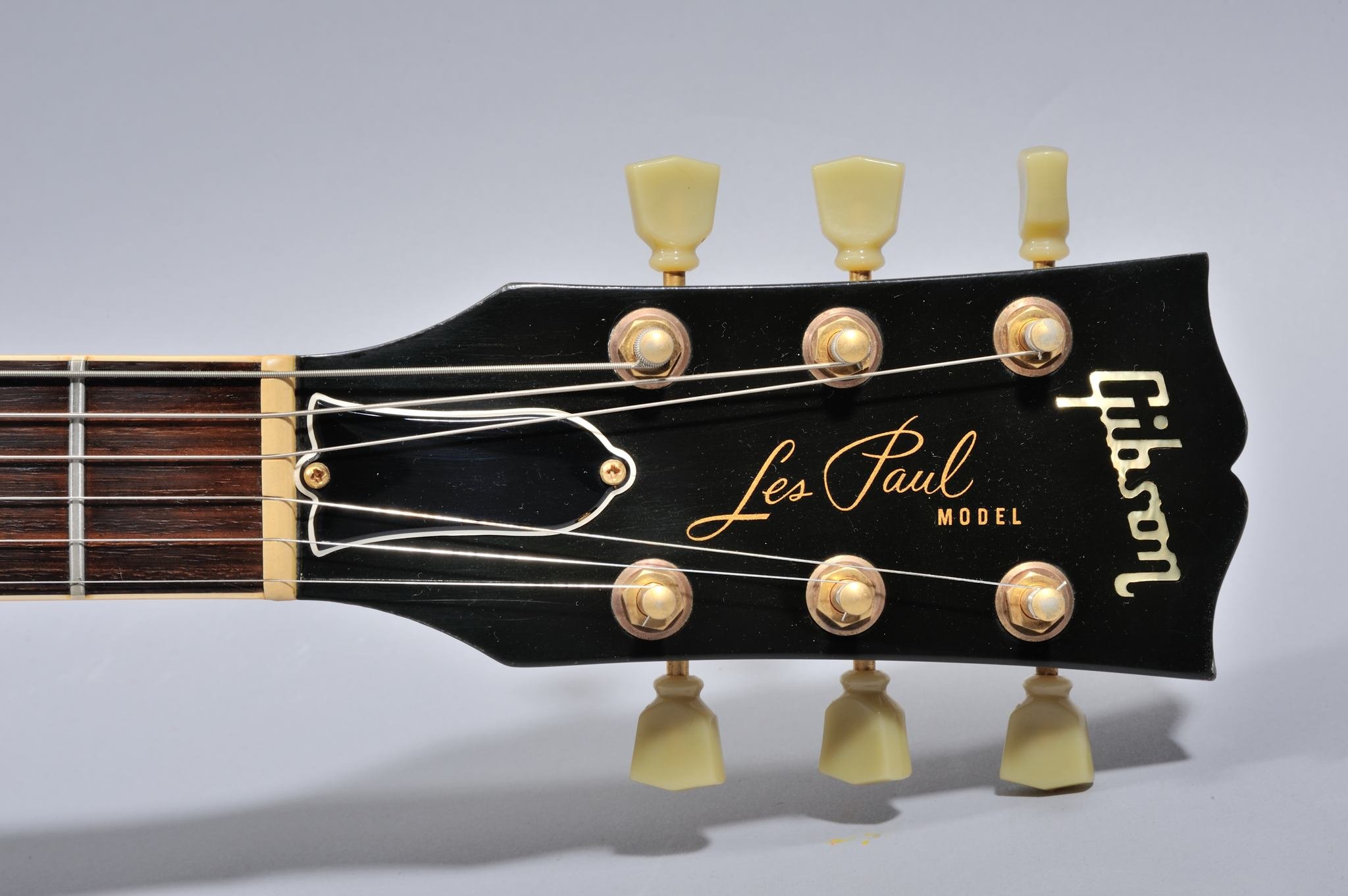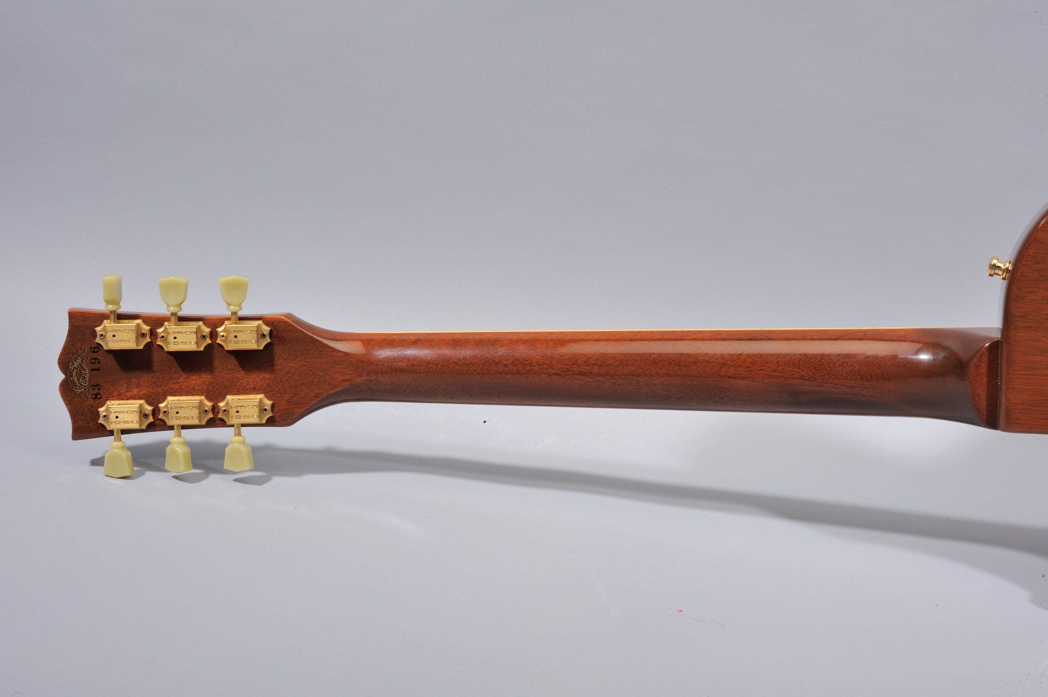 The ANT model (antique natural) came with a "...highly-figured curly maple top," brown binding with two cream pinstripes on the body and one cream pinstripe on the neck, a walnut head veneer in light stain with Gibson logo inlay, and individual pearloid kidney-shaped machine heads. ANT models are definitely the more exotic-looking of the two because of the color, contrasting dark binding, and less-common tuner buttons. Among the ANT models on the market there is less variation in color (all are antique natural, some more gracefully aged), but again, the grade/quality of the curly maple tops and the attention to bookmatching is highly variable.