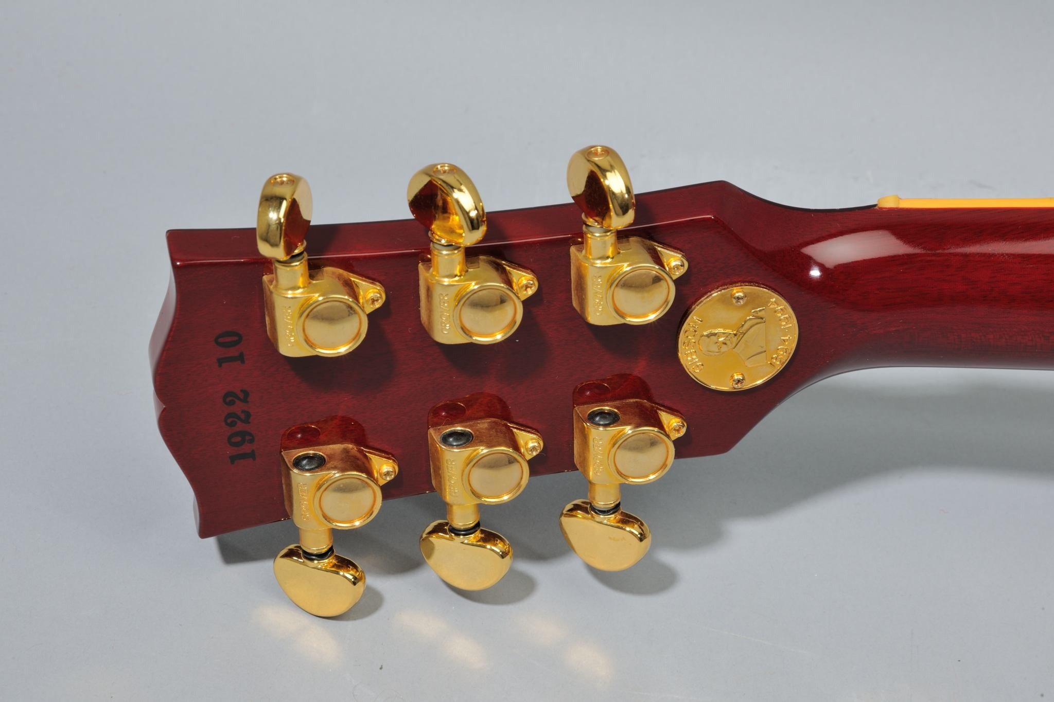 22K gold plated anniversary Orville Gibson coin embedded on the back of the headstock.