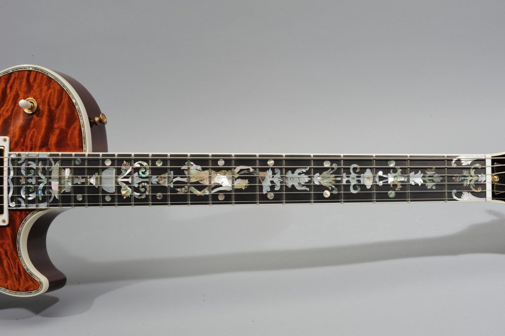 Ebony Fretboard with MOP and Abalone Harp Inlays.