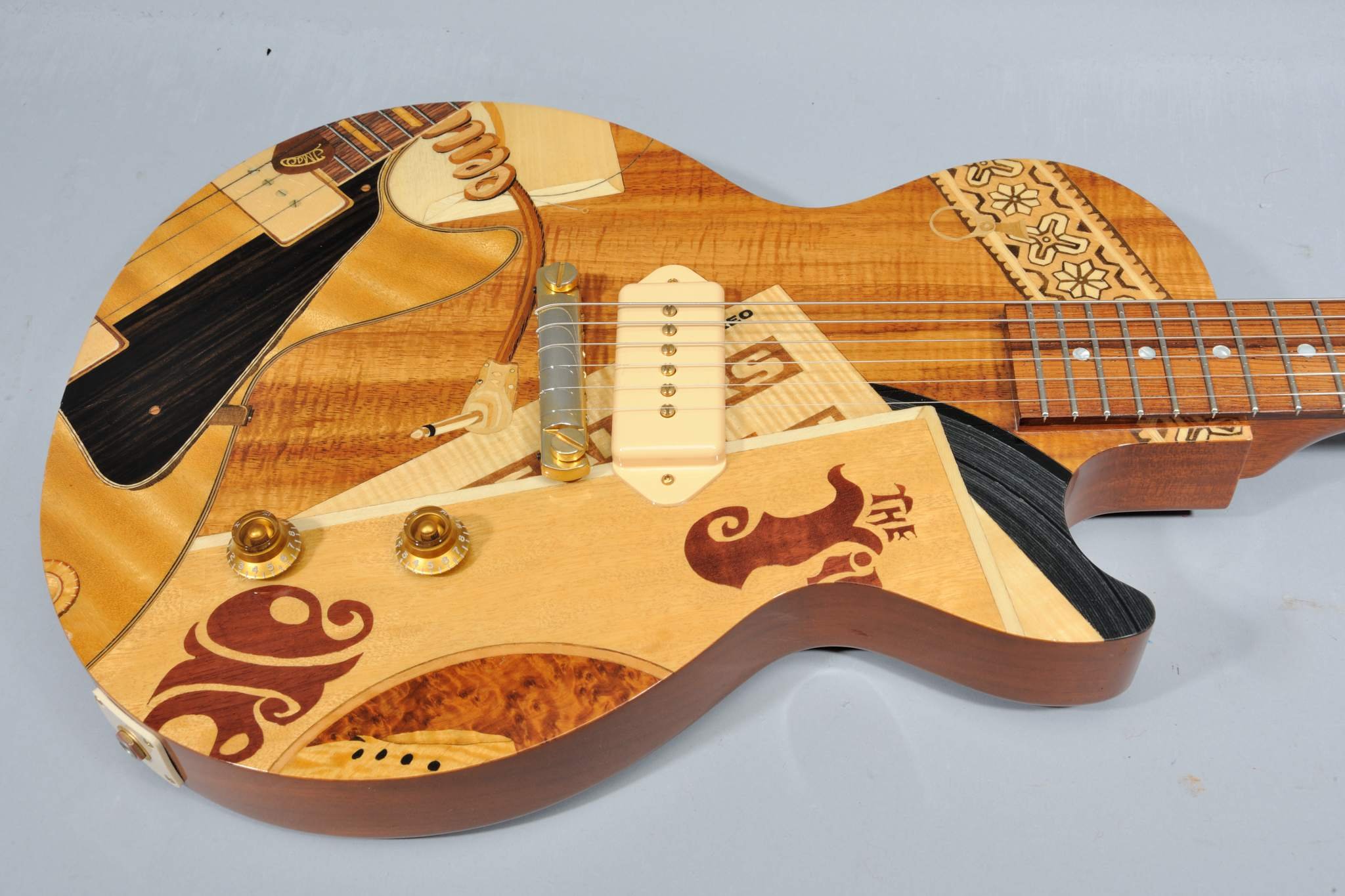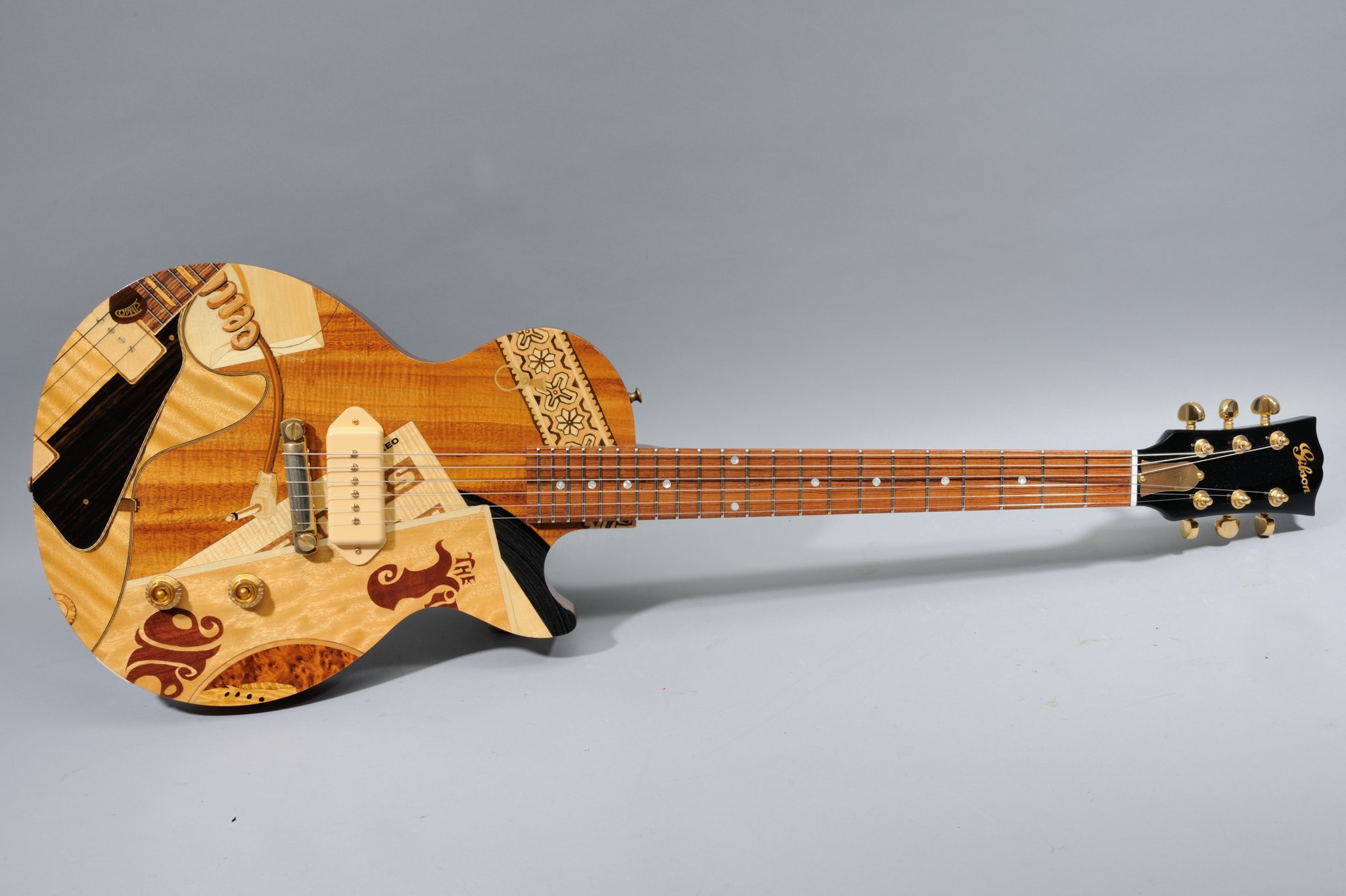 This is the second guitar the Gibson Custom Shop commissioned James Macdonald to design and create for their then running Visual Artist Program in 2002. This is a rare and unique instrument featuring hand cut marquetry using wood veneers from around the world to create artwork that tells a story. The full and proper name of this guitar is "Still Life: Fantasy Goldtop, 1968" but has since been generally called the "Fantasy Goldtop."