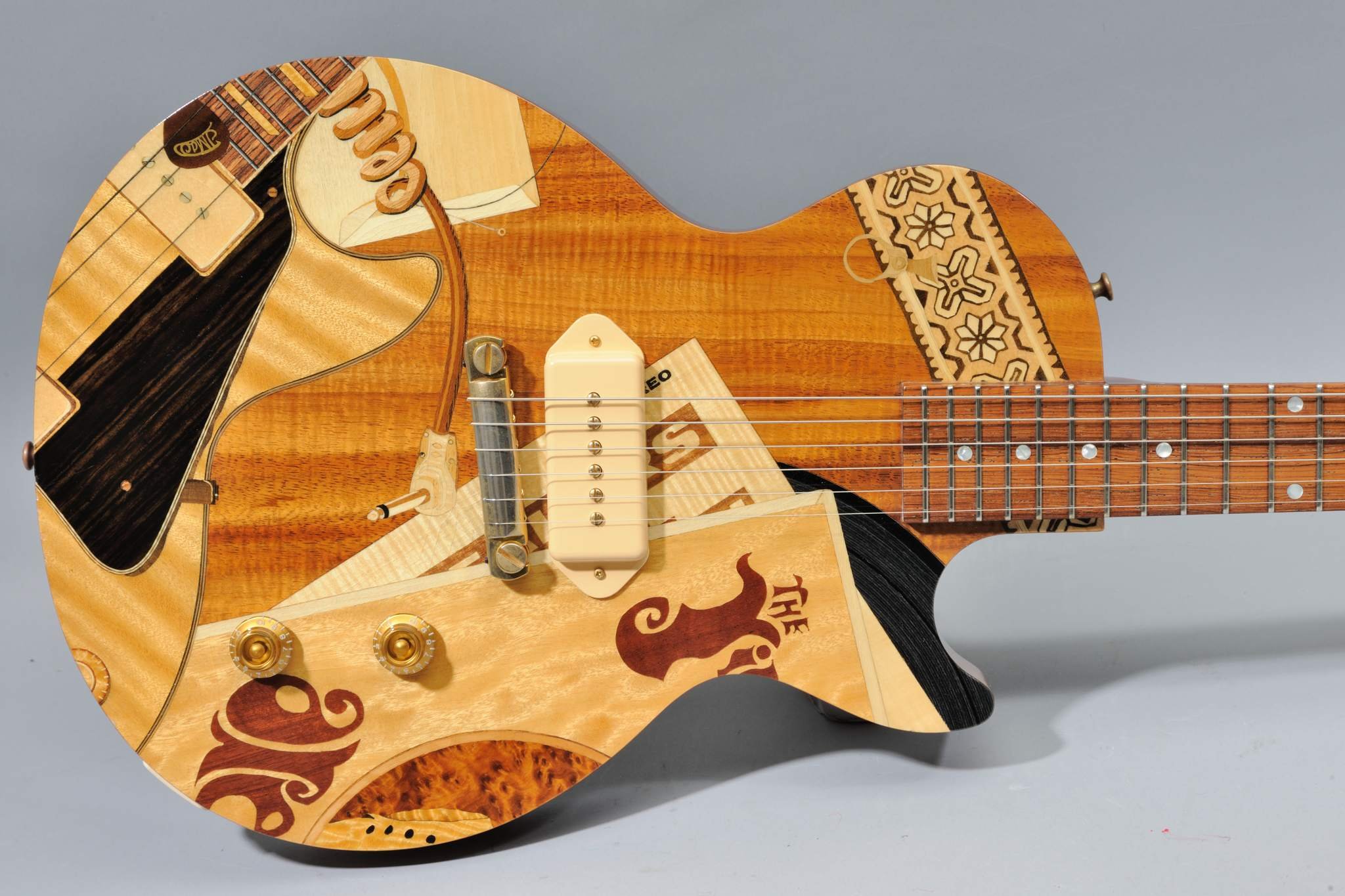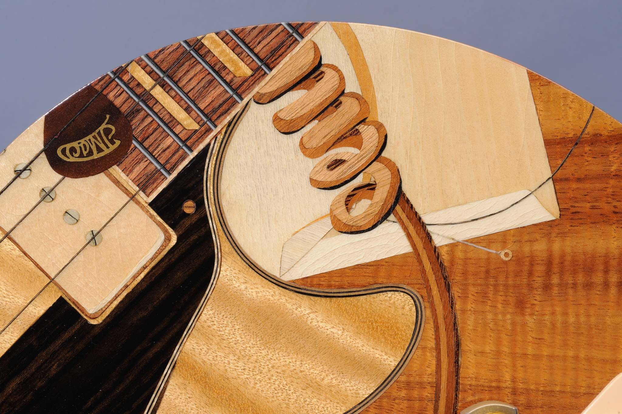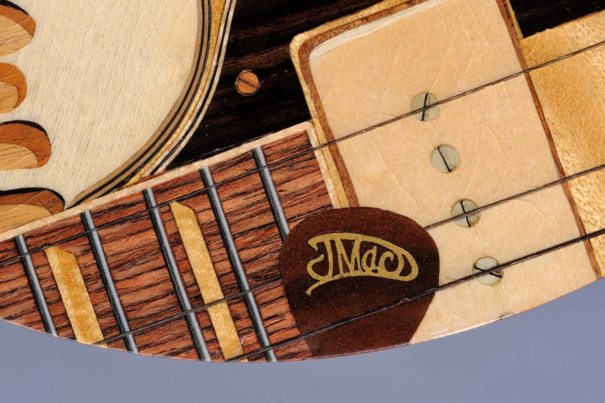 The upper left shows a "Hootenanny" strap and an old style beer pull tab. The lower left shows the fantasy guitar, modeled after the LP Standard Goldtop that Macdonald bought with his paper money in 7th grade. The guitar has a broken B string and there is an Ernie Ball replacement string show coiled and coming out of the paper wrapper. The guitar pick shown in the strings has "J MacD" inlaid in brass as a signature. Remember this is all done by hand cutting wood veneers!