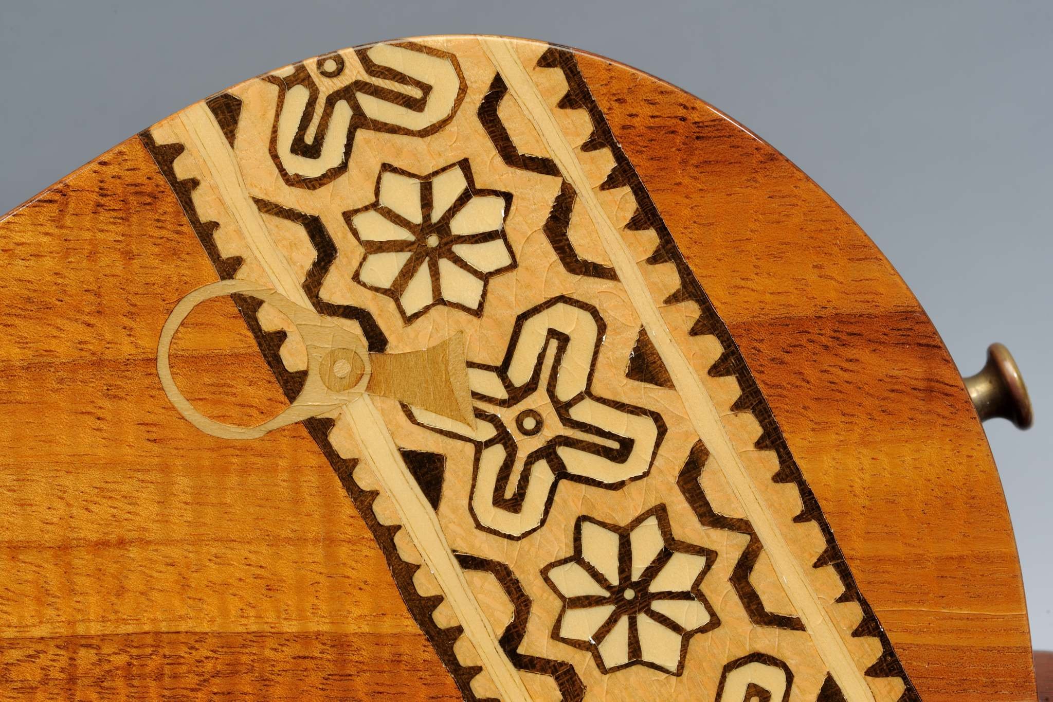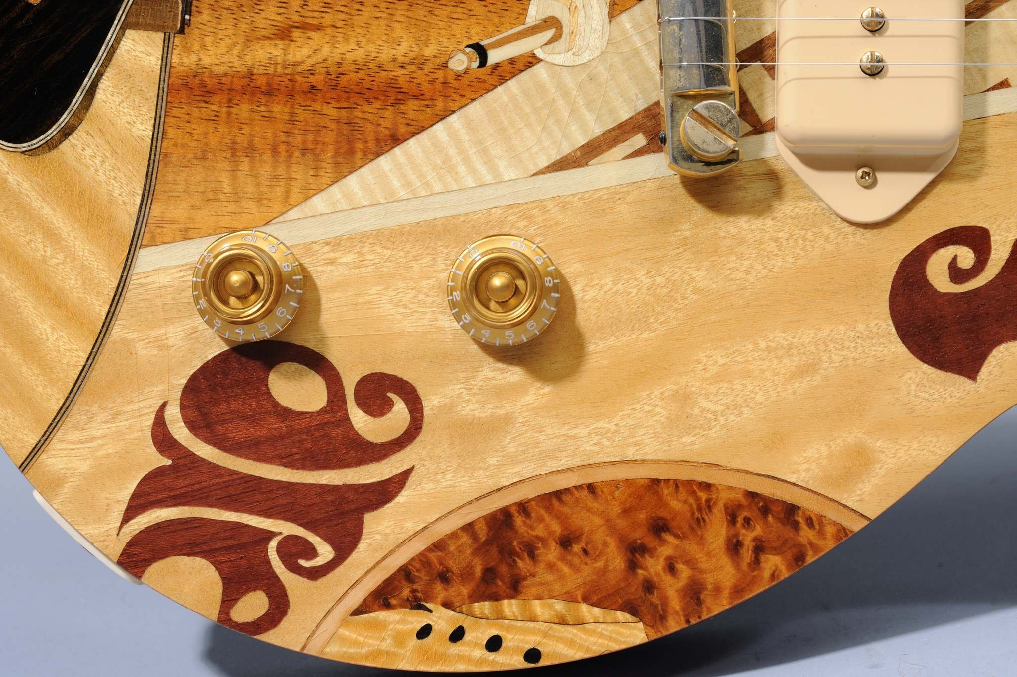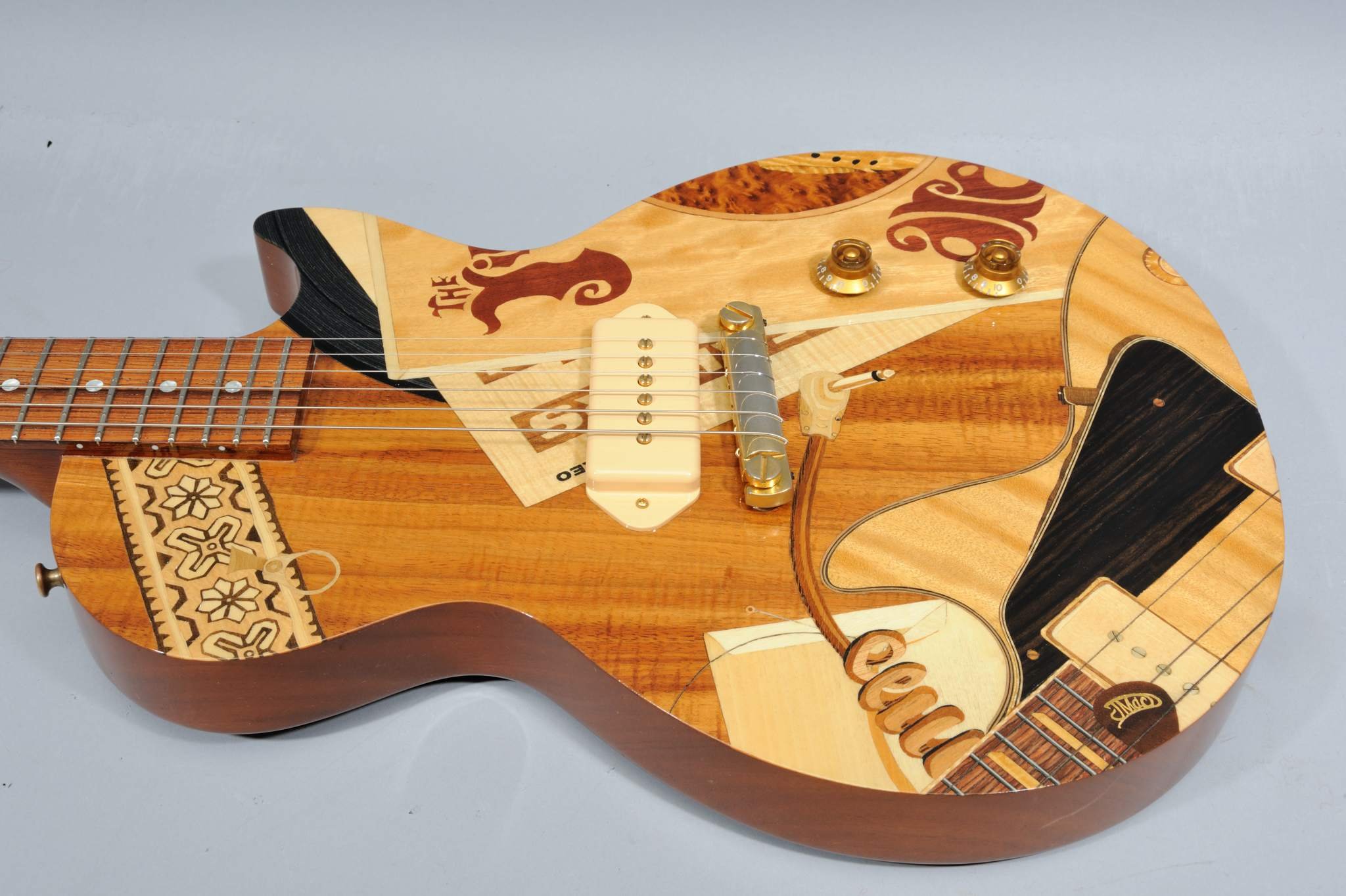 The upper left shows a "Hootenanny" strap and an old style beer pull tab. The lower left shows the fantasy guitar, modeled after the LP Standard Goldtop that Macdonald bought with his paper money in 7th grade. The guitar has a broken B string and there is an Ernie Ball replacement string show coiled and coming out of the paper wrapper. The guitar pick shown in the strings has "J MacD" inlaid in brass as a signature. Remember this is all done by hand cutting wood veneers!