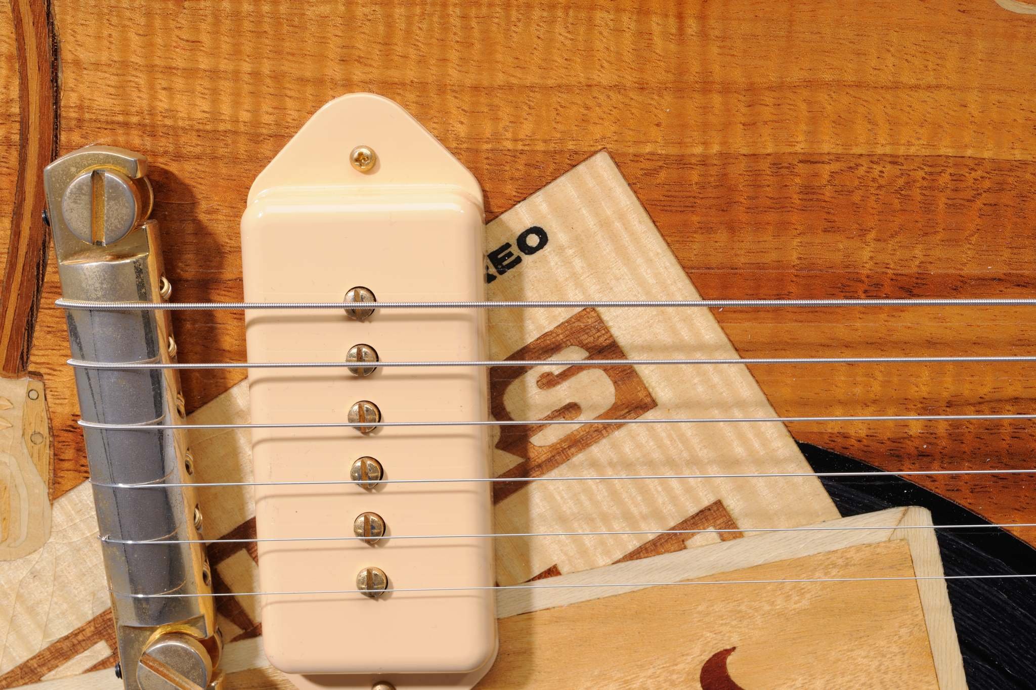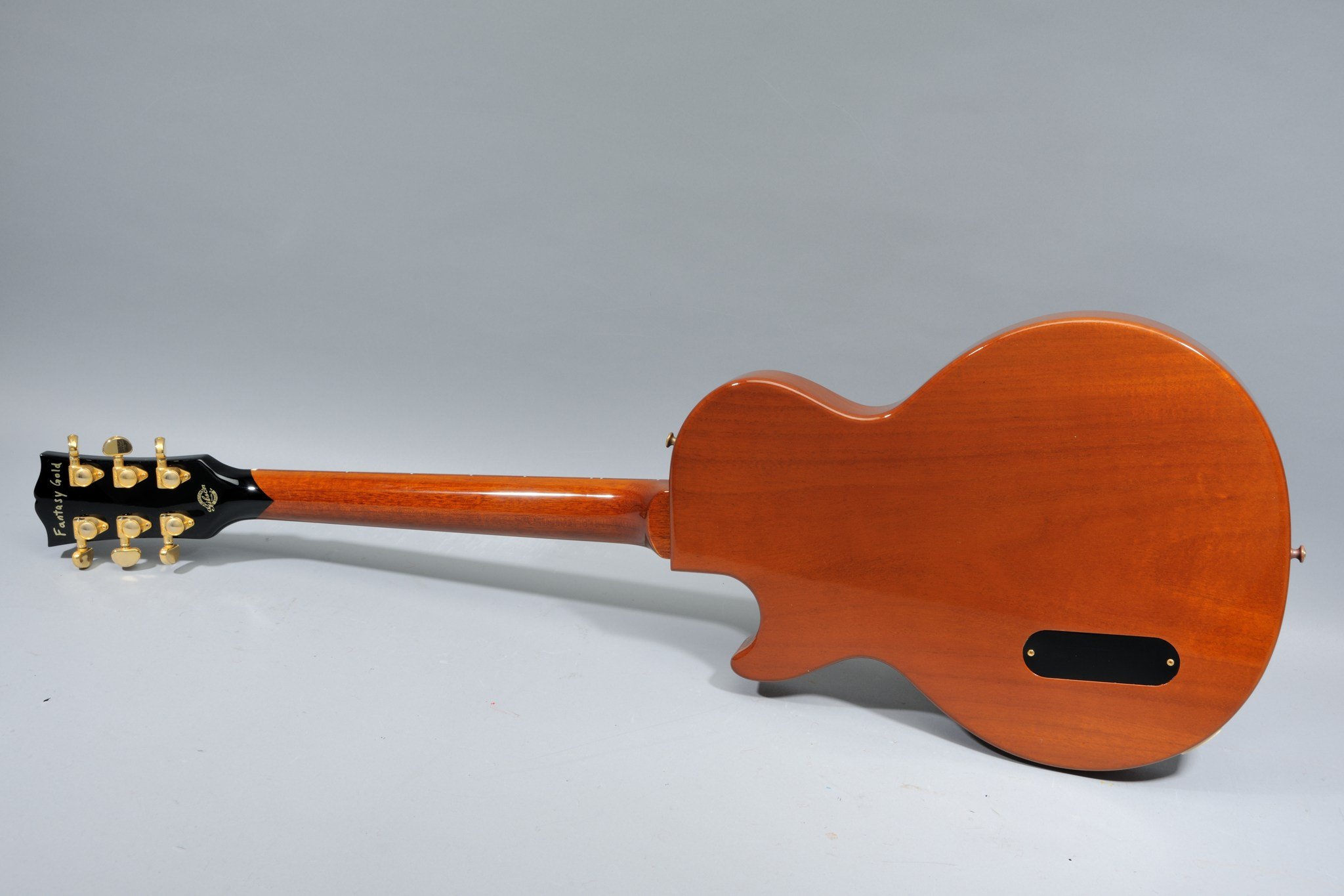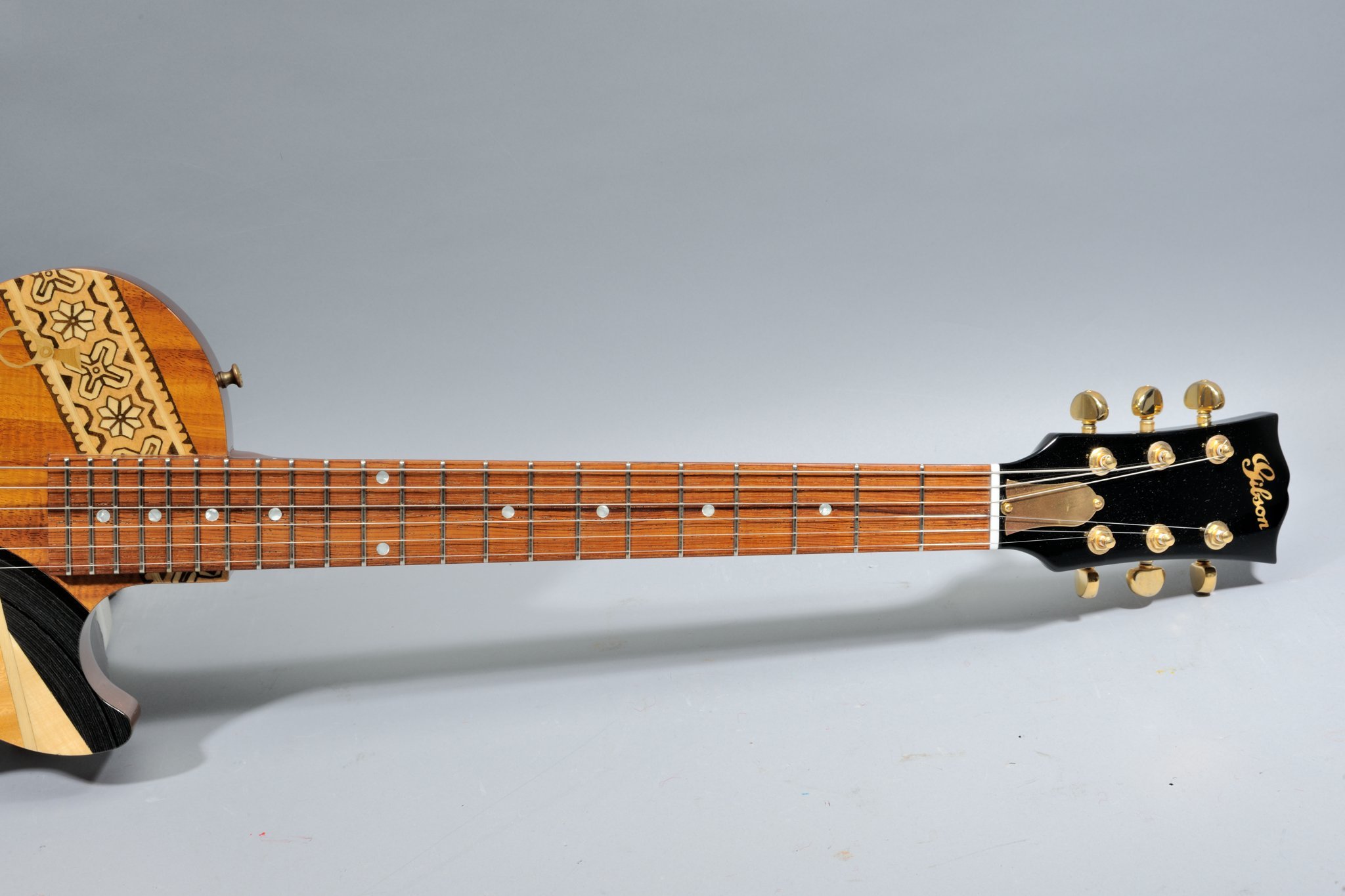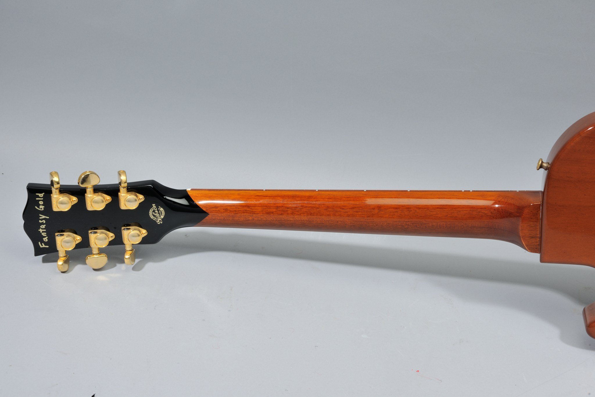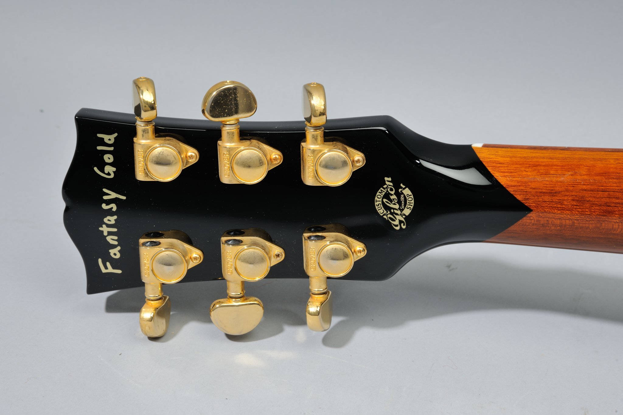 The factory headstock veneer was removed and replaced with a hand cut older style Gibson logo using satinwood, the same wood used for the Fantasy Goldtop body.