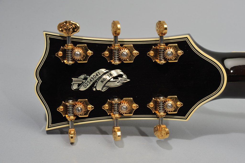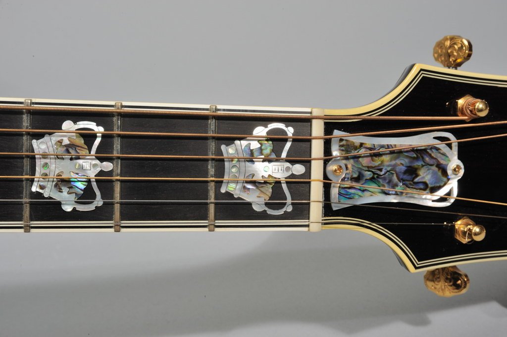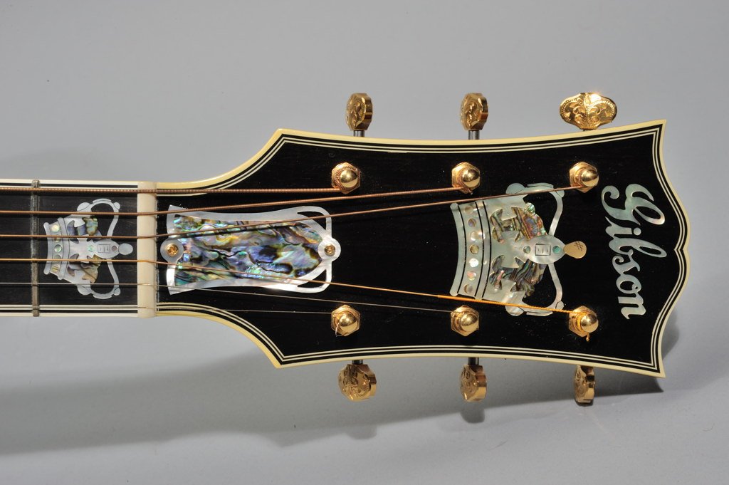 Headstock with Black Overlay Inlaid in Abalone with the Early Fancy Gibson Logo and Monarch Crown Ornamentation.