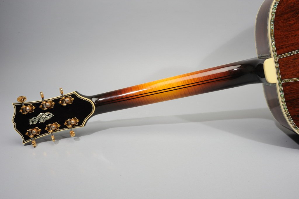 Back of the Headstock Overlaid in Black with Multiple Bindings and Inlaid with an Abalone Cartouche with an Arrow and the Engraved Serial Number.