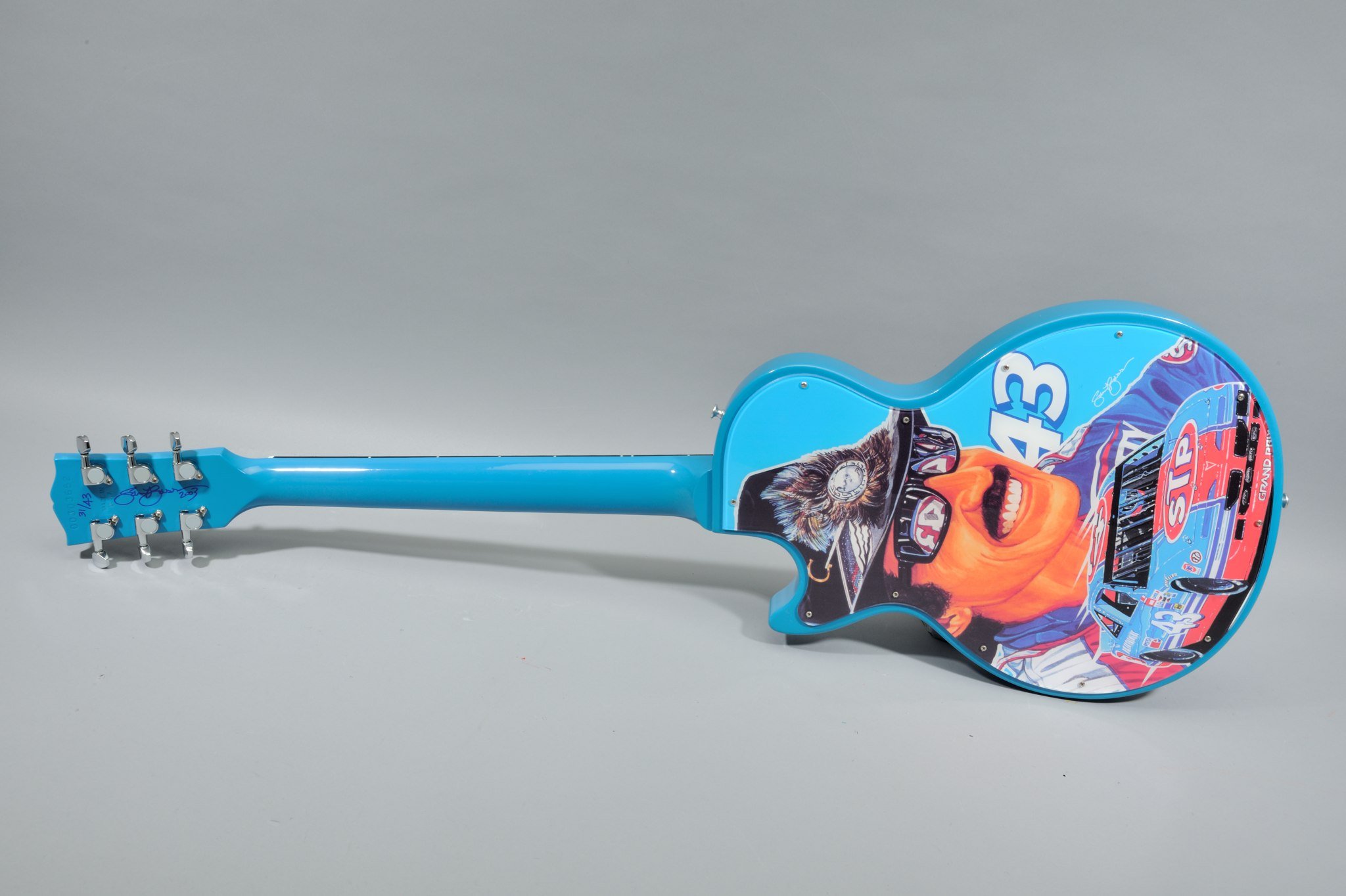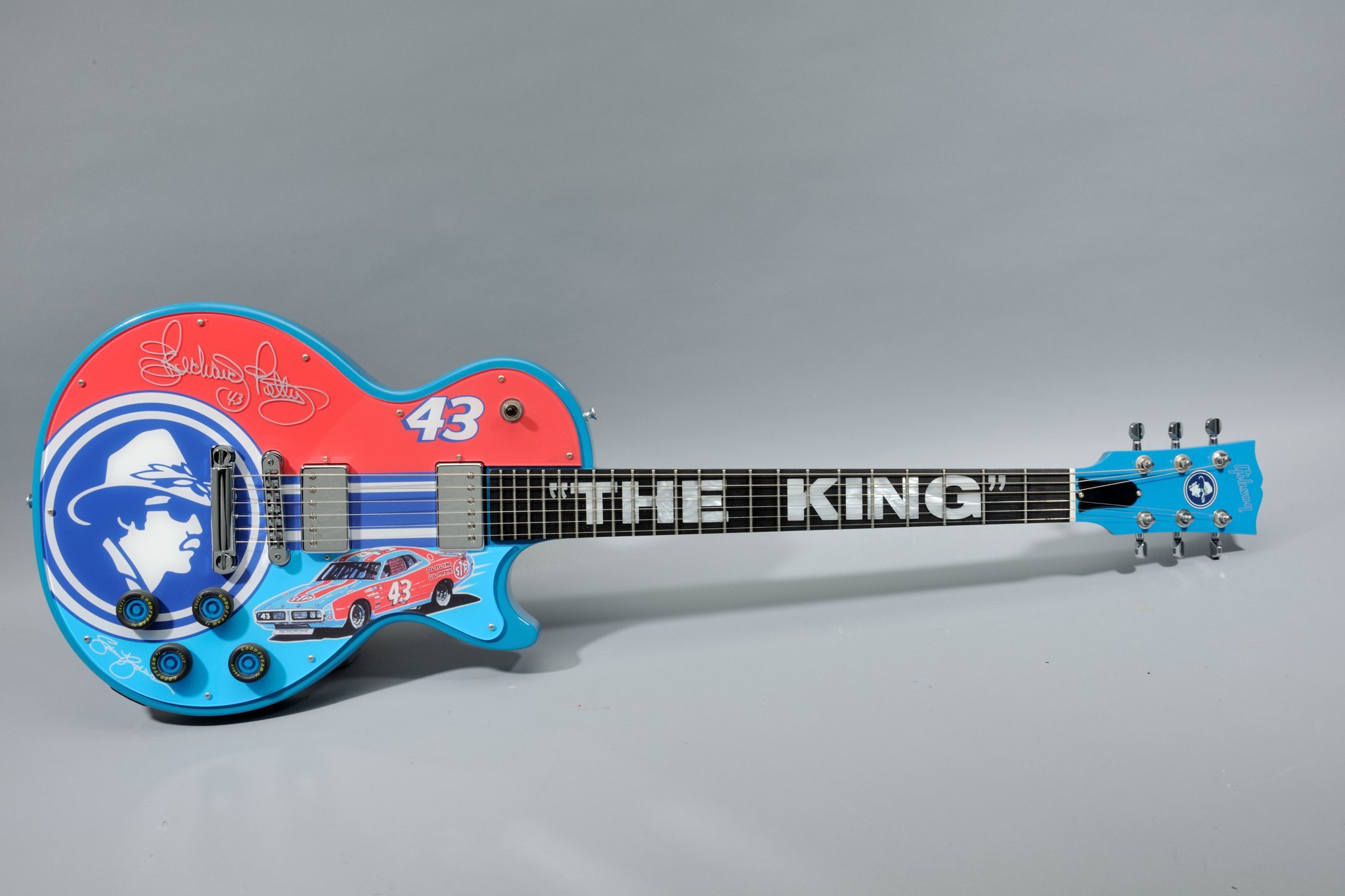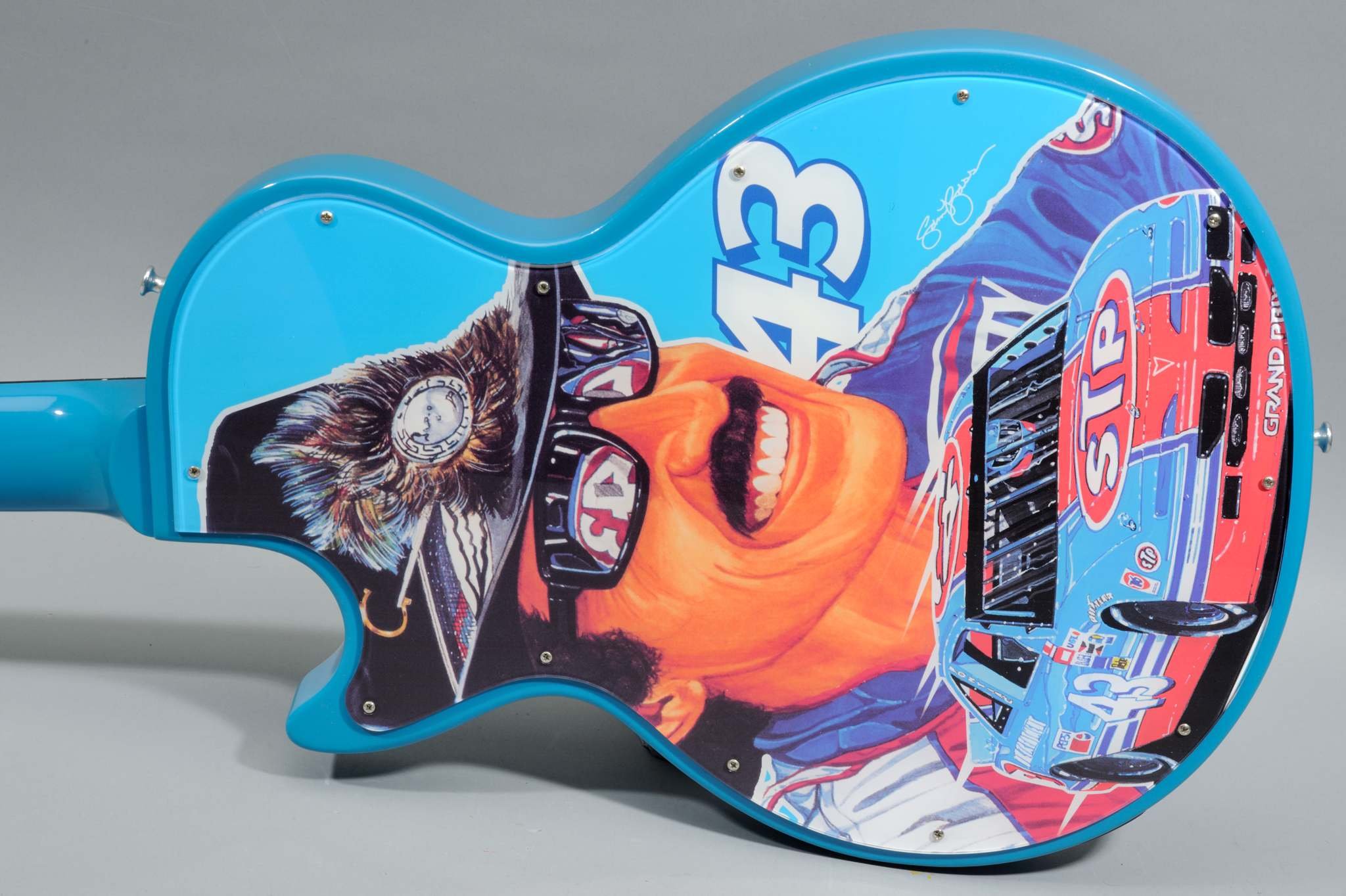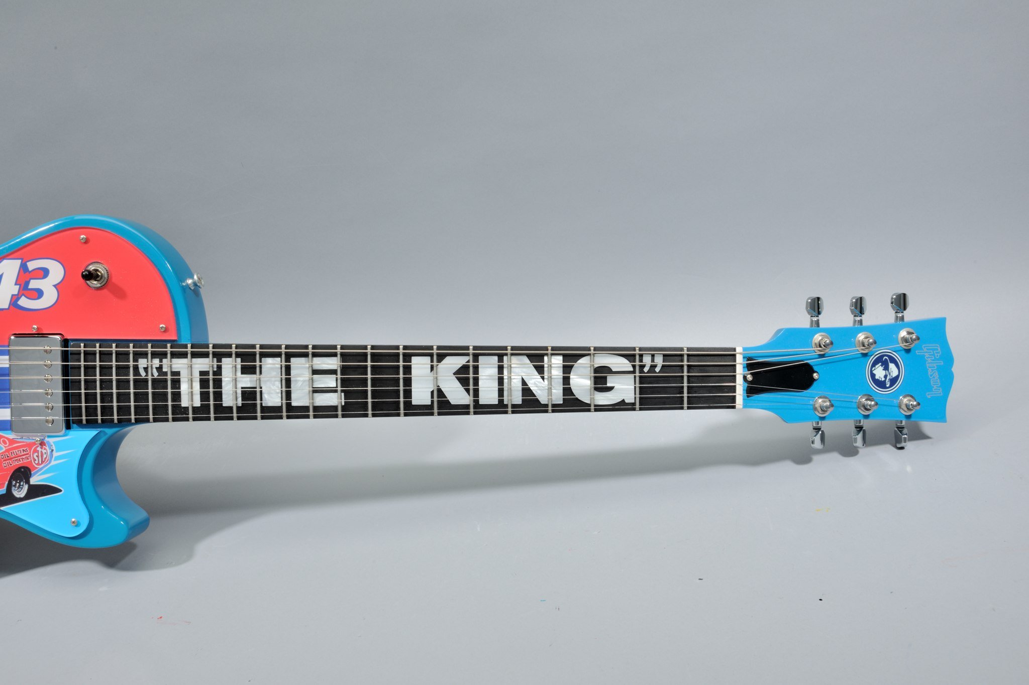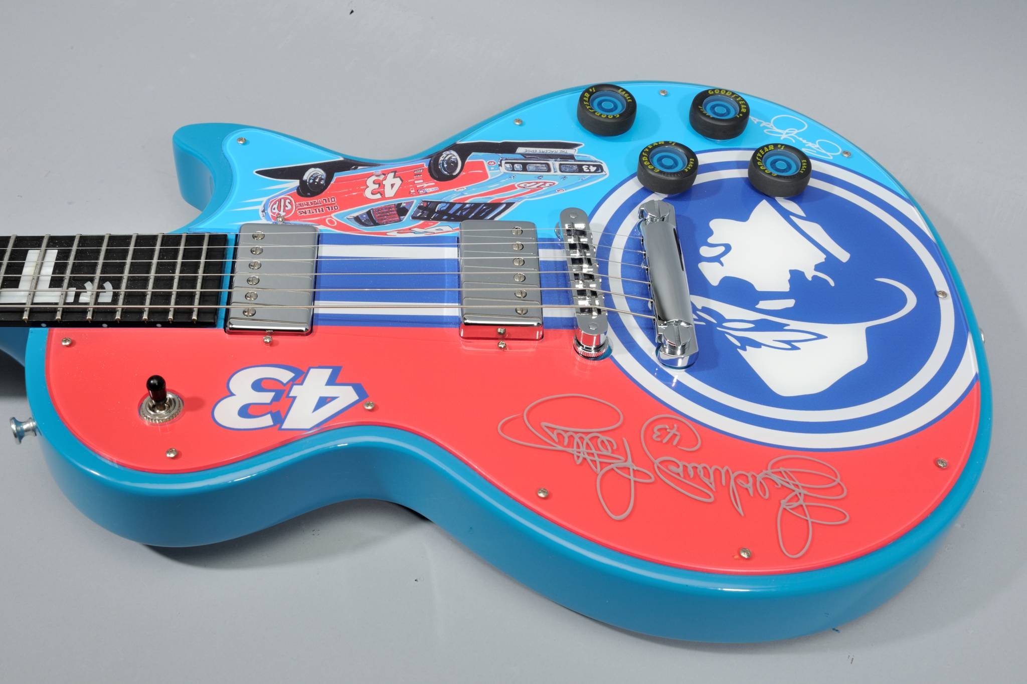 The guitar has a great blue finish with plates on the front and back that are fully covered in Richard Petty graphics. The neck has "The King" inlaid from fret 2 to 22. The back of the headstock has been signed and dated by Sam Bass. Even the knobs have Goodyear tyres around them.