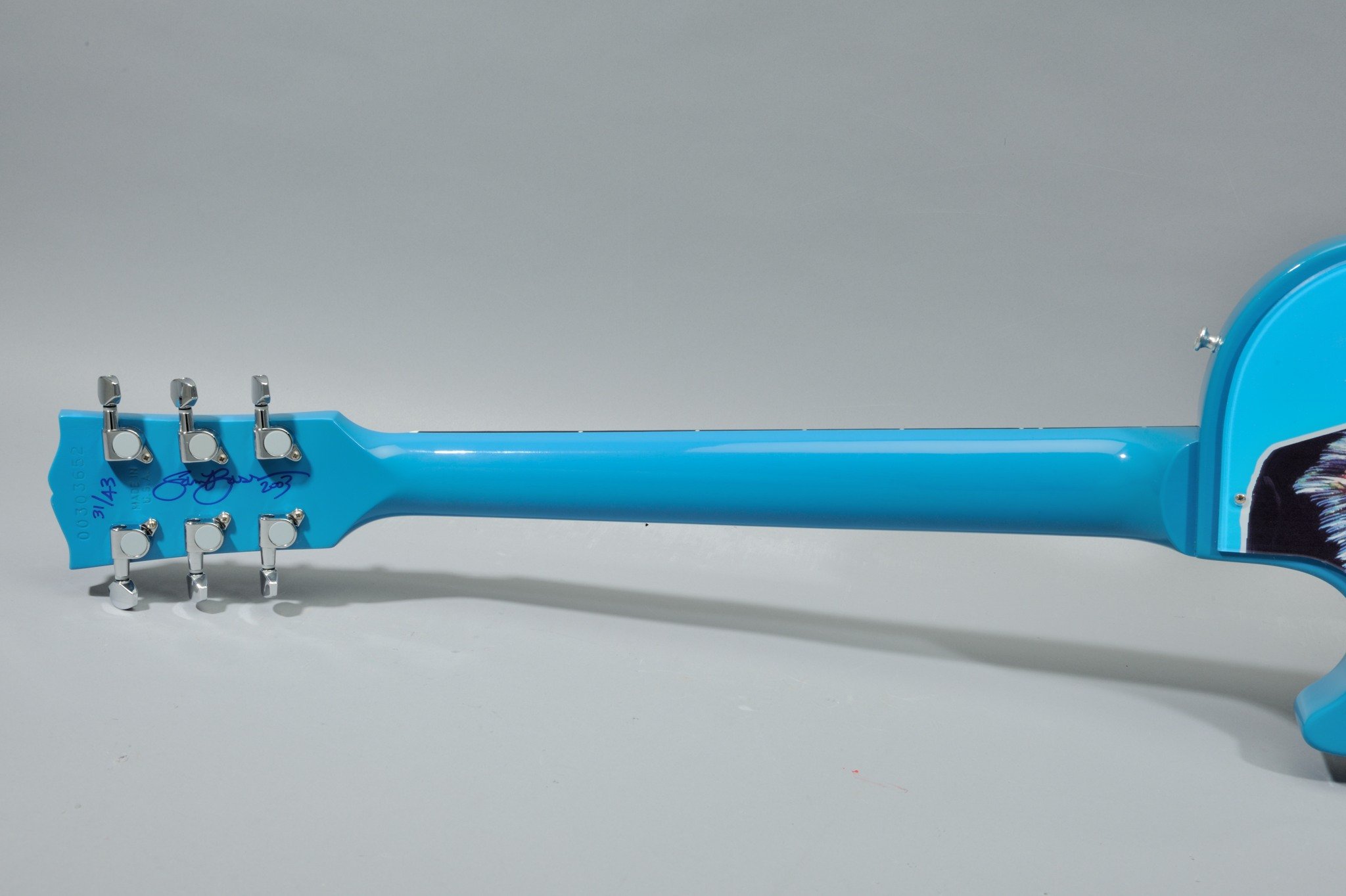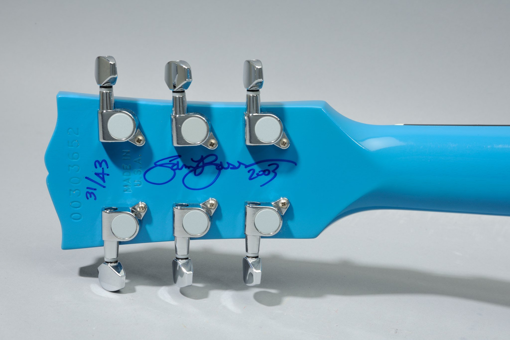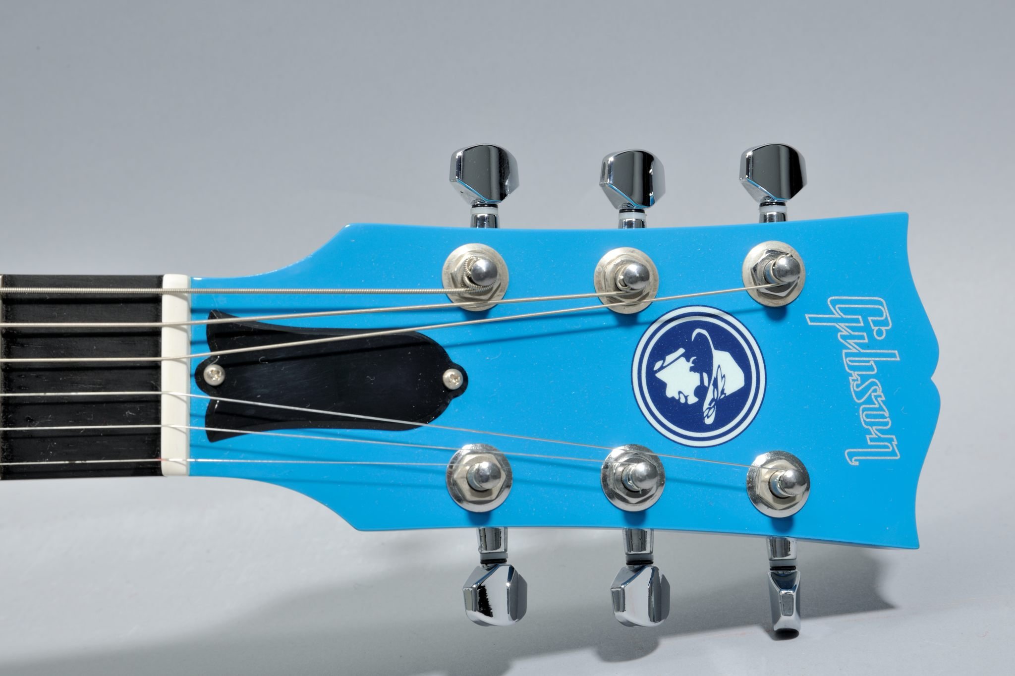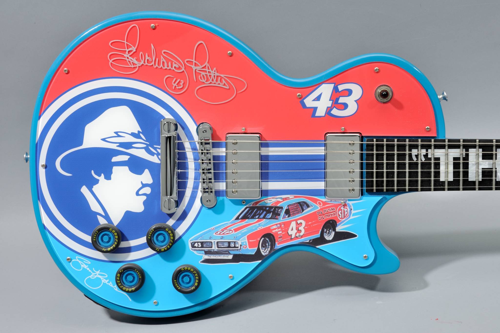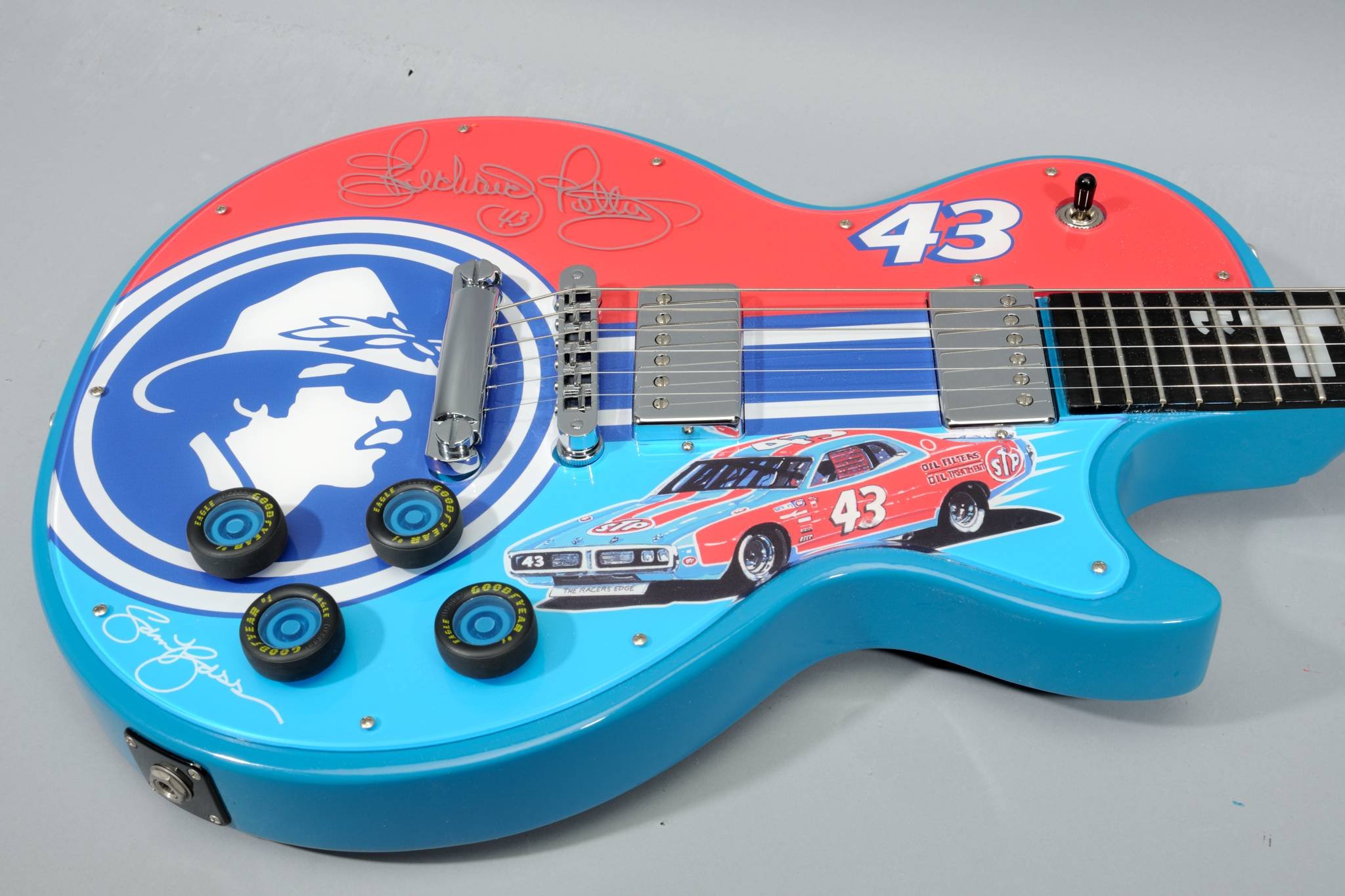 The guitar has a great blue finish with plates on the front and back that are fully covered in Richard Petty graphics. The neck has "The King" inlaid from fret 2 to 22. The back of the headstock has been signed and dated by Sam Bass. Even the knobs have Goodyear tyres around them.