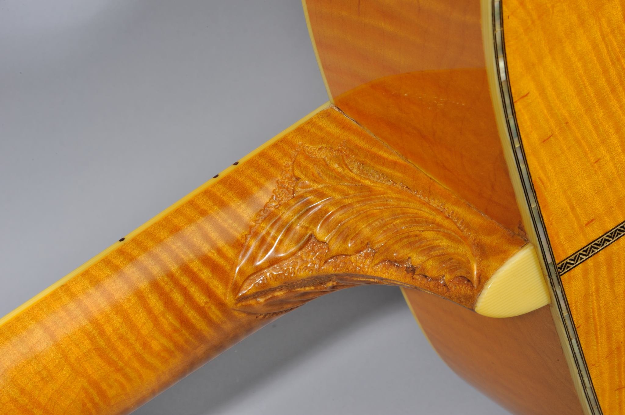 Headstock with Brazilian Rosewood Overlay Inlaid in MOP with the John Greven Logo & an Engraved Cartouche.
