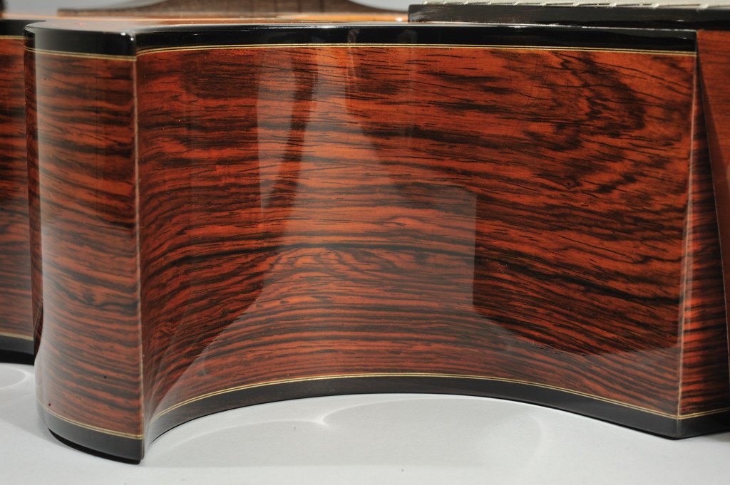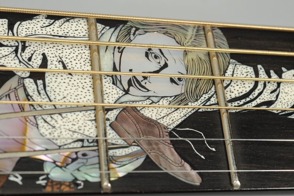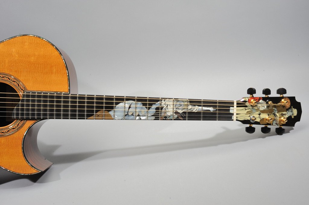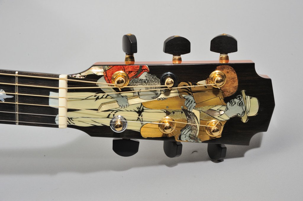 In addition to building the instruments, Laskin uses them as “canvases” for his engraved inlay art. He is now internationally acknowledged as having single-handedly taken the tradition of musical instrument decoration beyond the purely decorative. For Laskin, the inlay medium has become a tool for communication, not merely embellishment. “I don’t see inlay as a decoration, but as a canvas,” Laskin says. “My goal is to tell a story, convey a feeling, communicate. I don’t think, ‘Here’s some ebony, let’s throw some shell in there.’ I think, ‘Have I told a story?’”