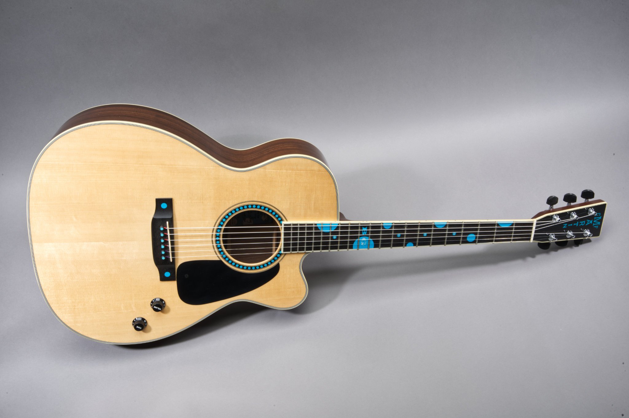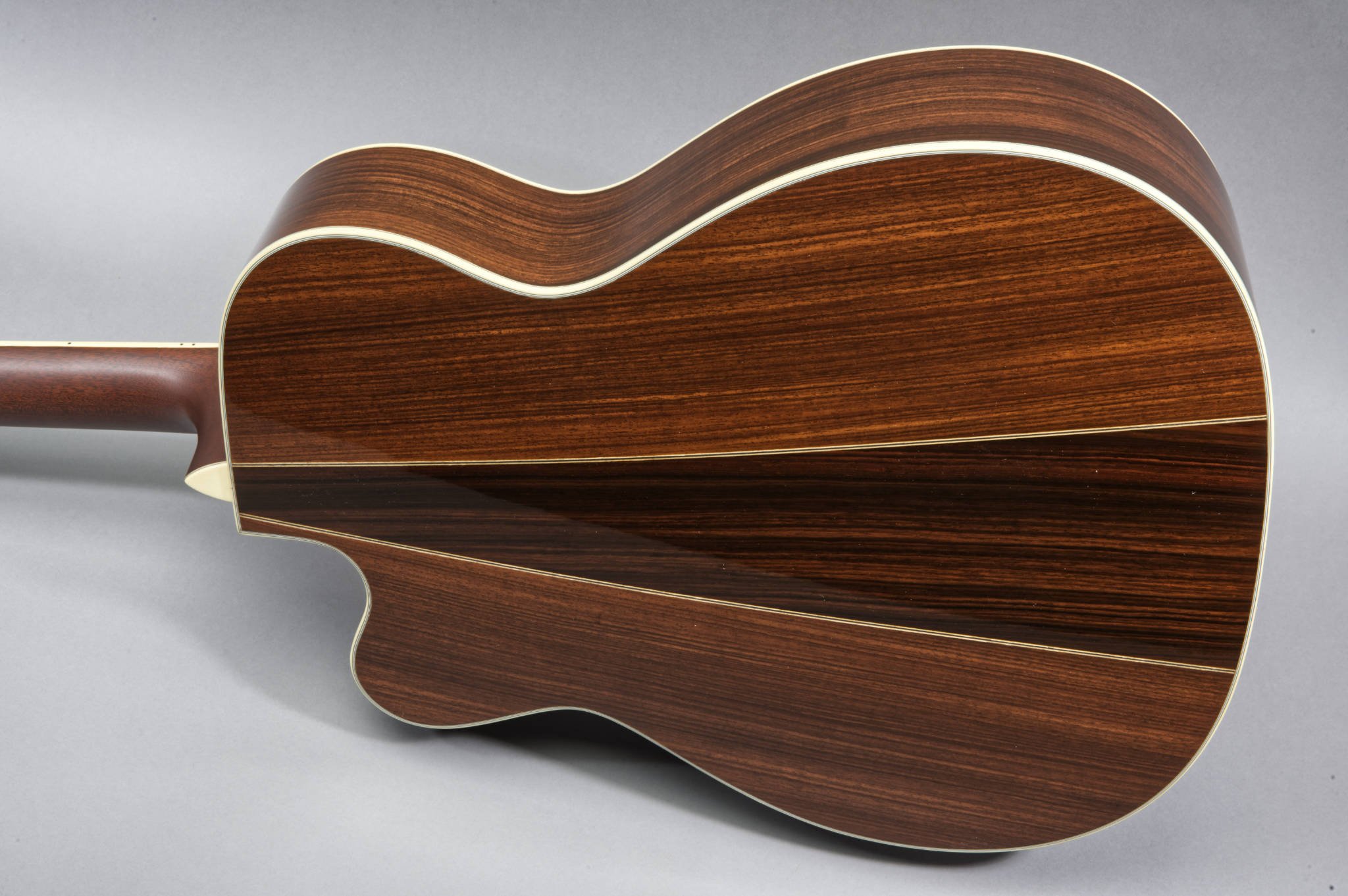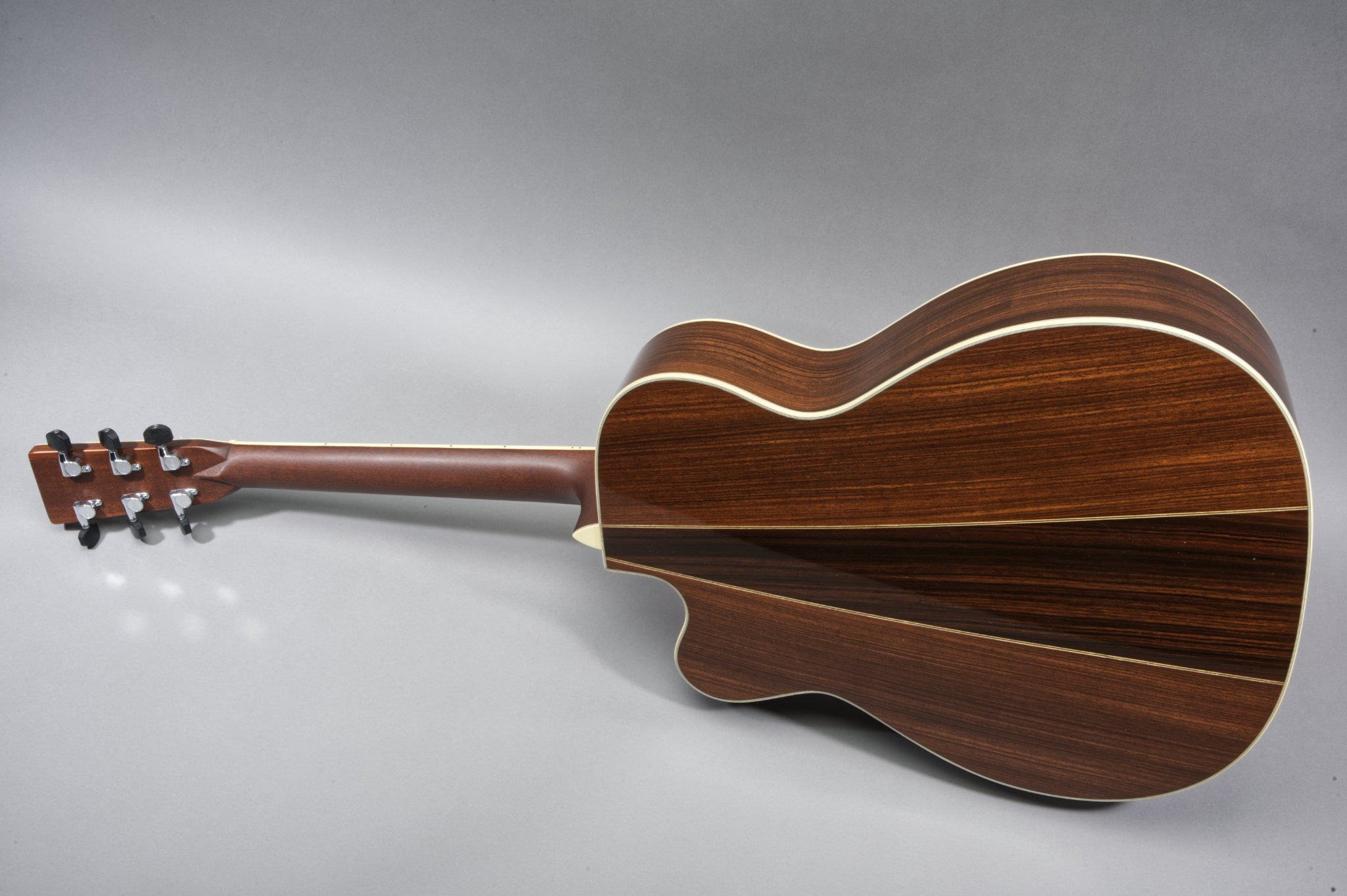 The JC Buddy Guy Blues Guitar combines Martin's J (Jumbo) body style with a cutaway for big sound and easy access to the upper frets. The Sitka spruce top is reinforced with 5/16" scalloped braces for clear tone and impressive dynamic range. The sides and Style 35 three-piece back are richly colored East Indian rosewood. The low profile 1-11/16" (at the nut) neck is carved from genuine mahogany.