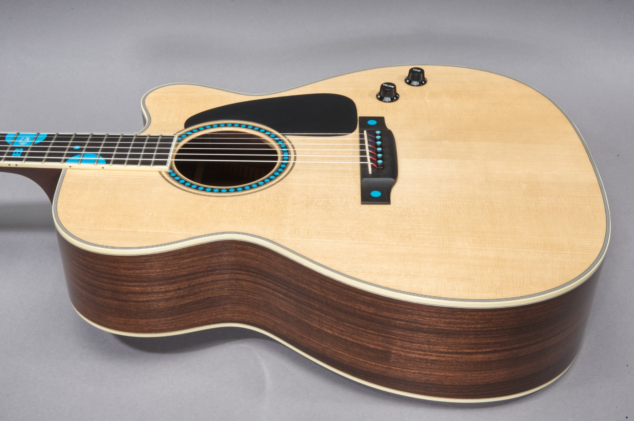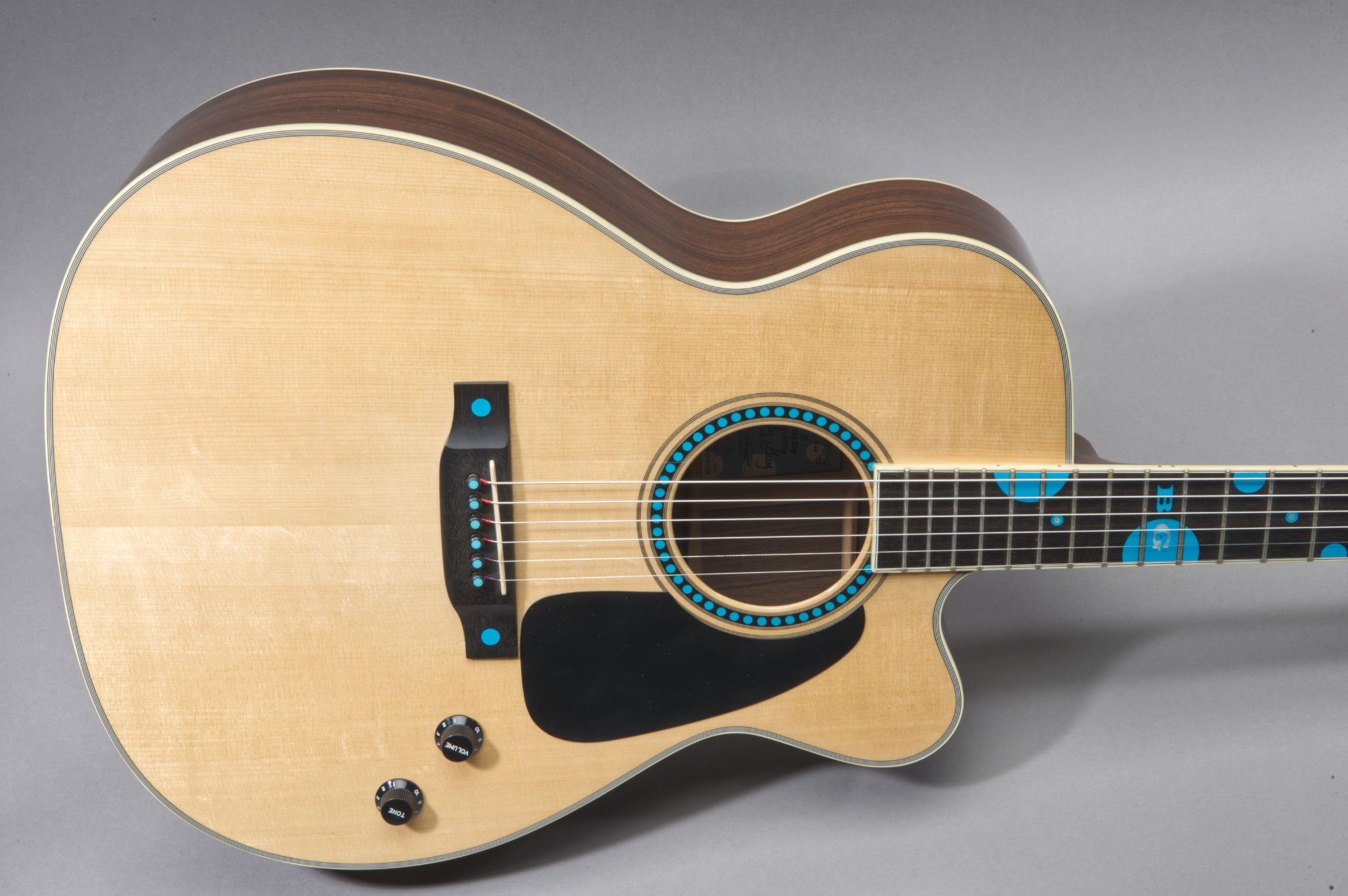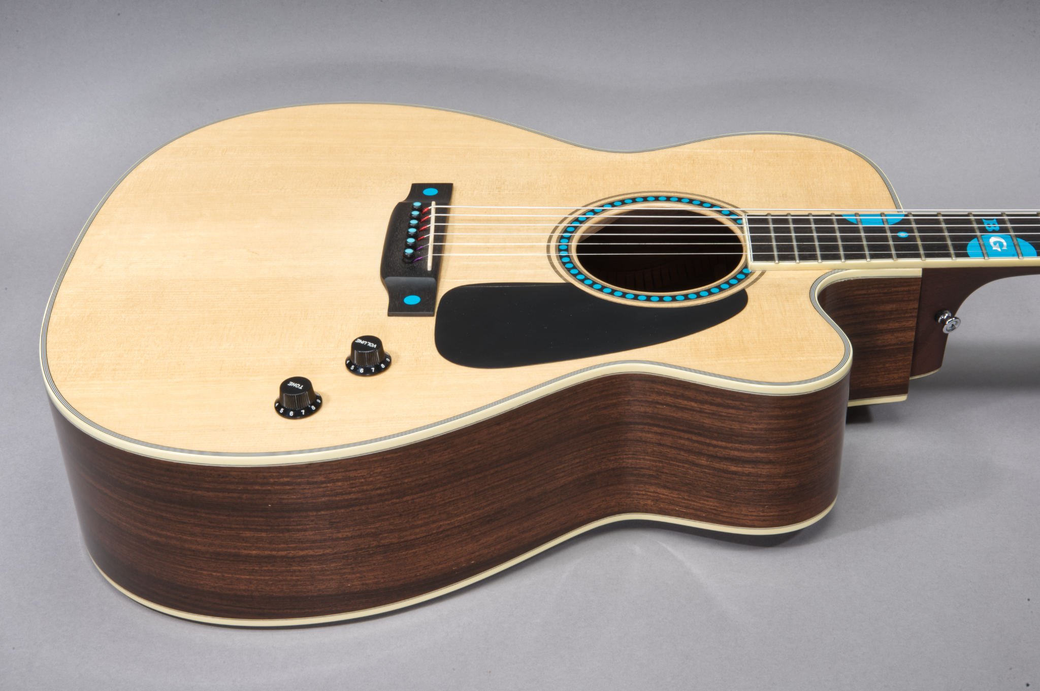 The JC Buddy Guy Blues Guitar is factory equipped with Fishman VT electronics. To simplify "on the fly" adjustments in the tradition of electric blues, the volume and tone knobs are mounted on the top, just below the bridge and the polished and beveled black pickguard.
