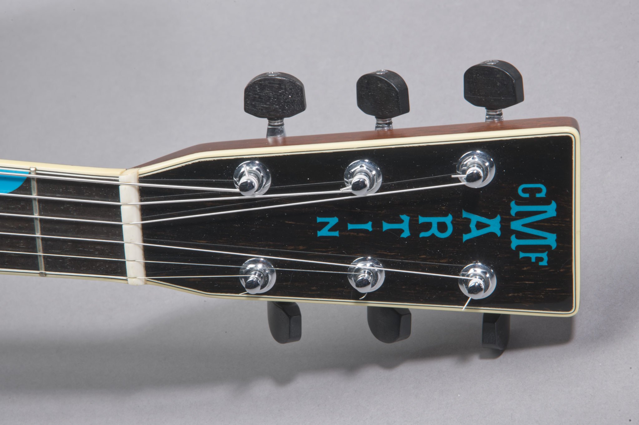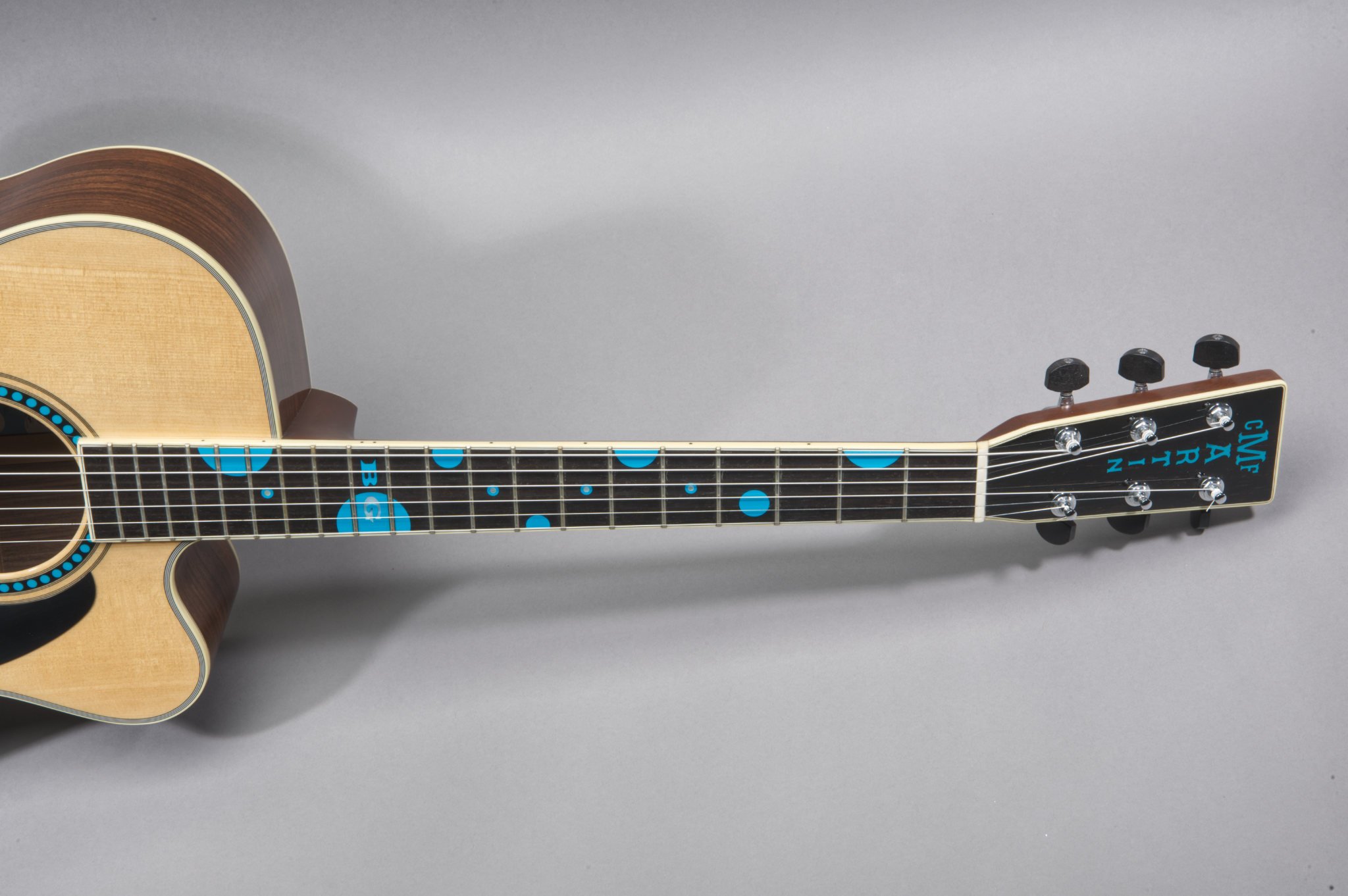 But it is the appointments that really set the JC Buddy Guy Blues Guitar apart. Buddy likes polka dots on his guitars, and polka dots he got. The unique rosette features three five-ply black/white rings, the inner two flanking a ring of turquoise composite dots. Turquoise composite dot inlays also accent the black ebony belly bridge and the ebony bridge pins. The black ebony fingerboard provides the palette for a random "splash" of turquoise composite polka dots. Buddy Guy's "BG" initials serve as the position marker at the 12th fret, while mother of pearl dots, bordered in turquoise, mark the 5th, 7th, 9th and 15th frets. The black ebony headplate showcases the block letter "C. F. Martin" logo, also inlaid in turquoise composite.