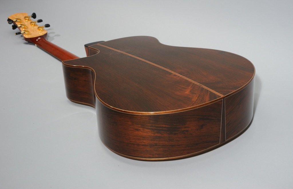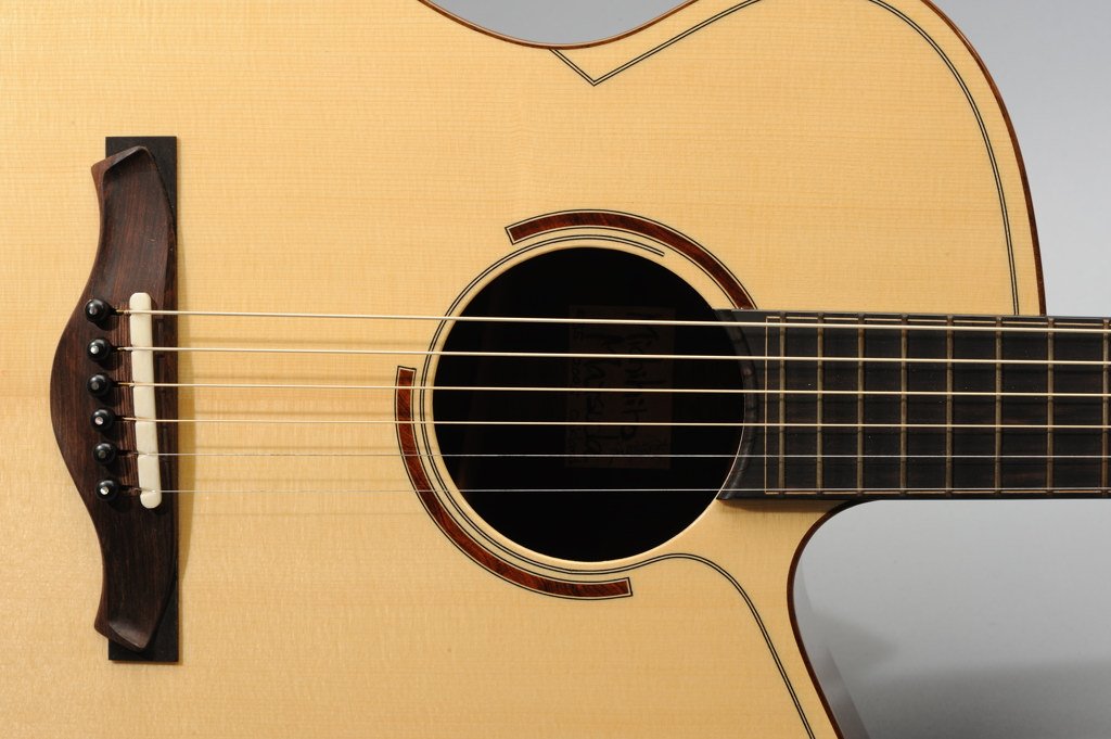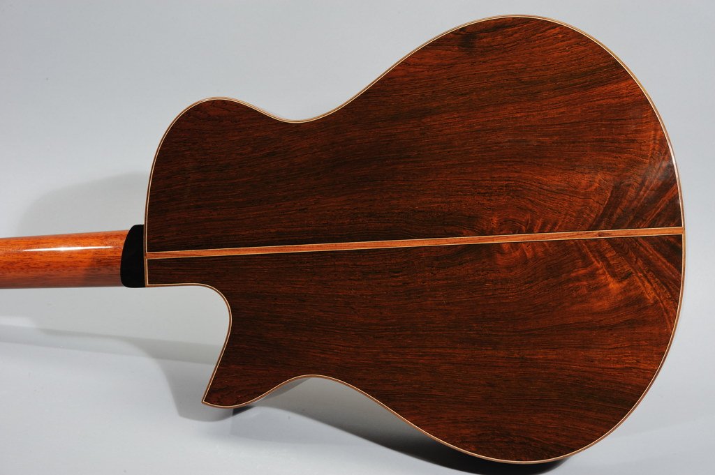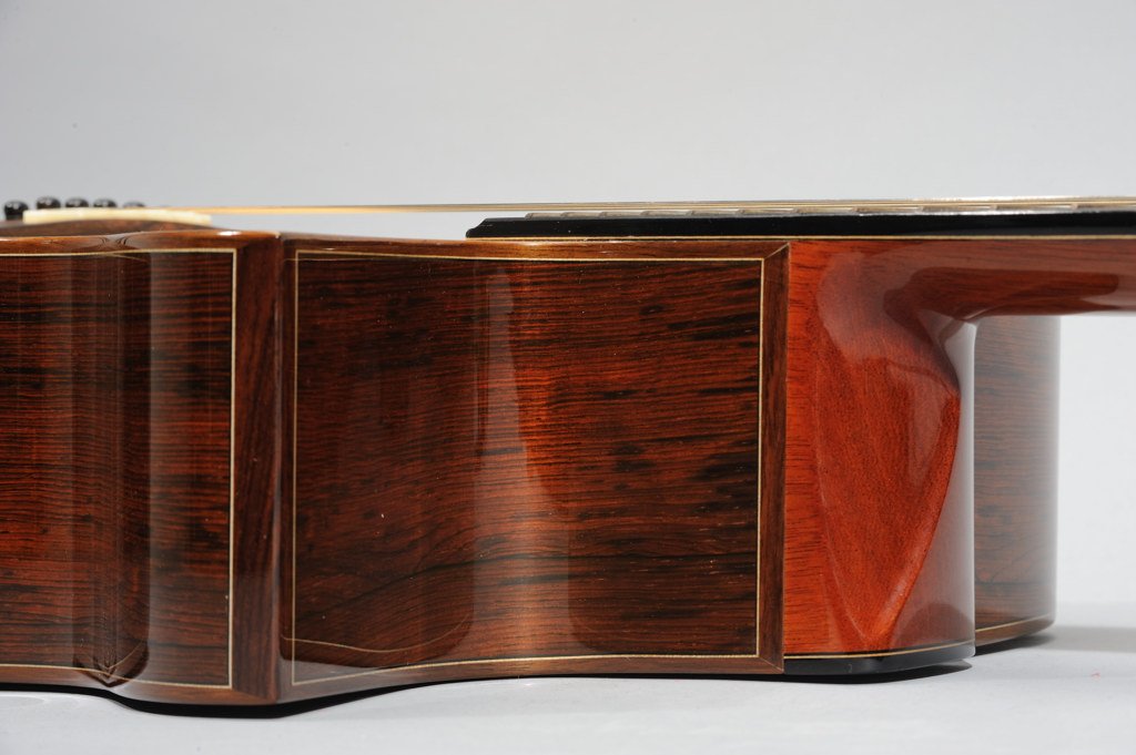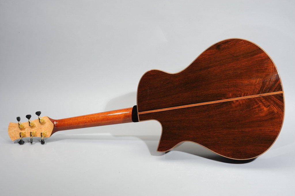 He also studied guitar restoration with the well-known instrument repairman Frank Ford, the co-owner of Gryphon Stringed Instruments. Matsuda spent about three years in Somogyi’s shop honing the guitar making skills he learned at Sakashta’s shop and at the Roberto-Venn School. He credits Somogyi, Sakashta, and Ford with helping him understand the structural complexities involved in hand building acoustic guitars. Matsuda is especially thankful to Somogyi for showing him the meaning of craftsmanship, and most importantly, teaching him the subtle art of making wood sing.