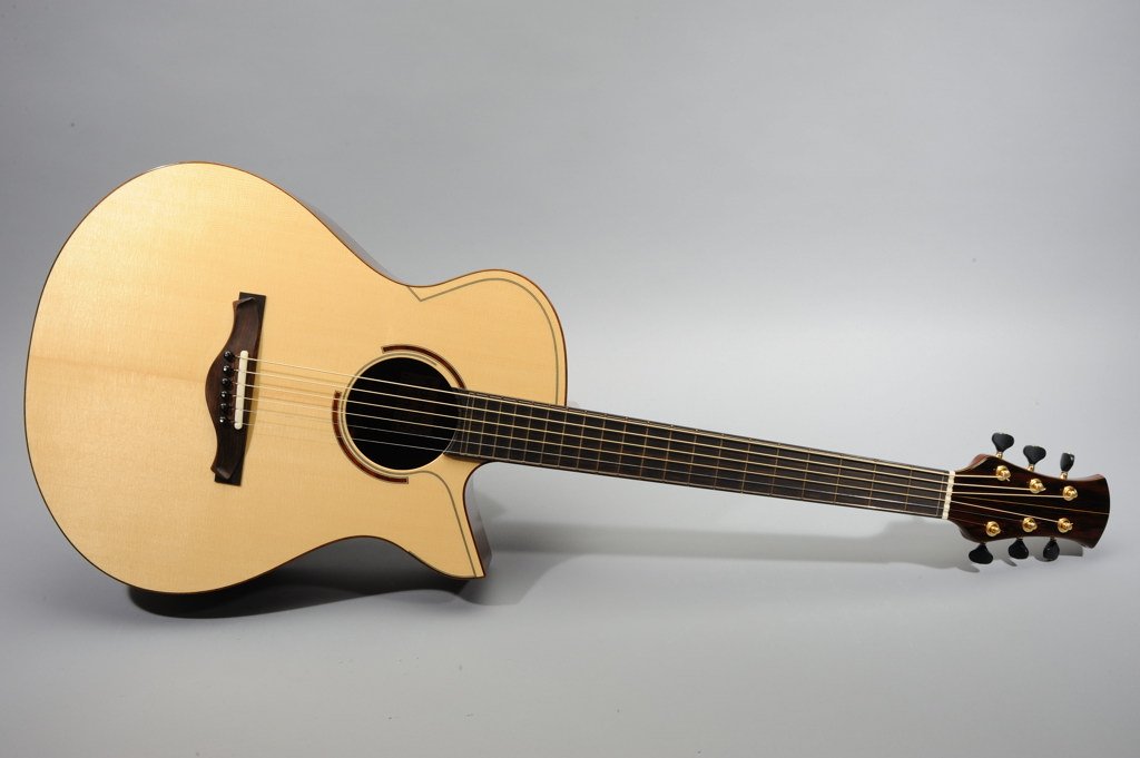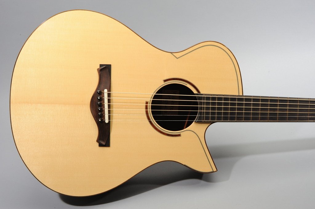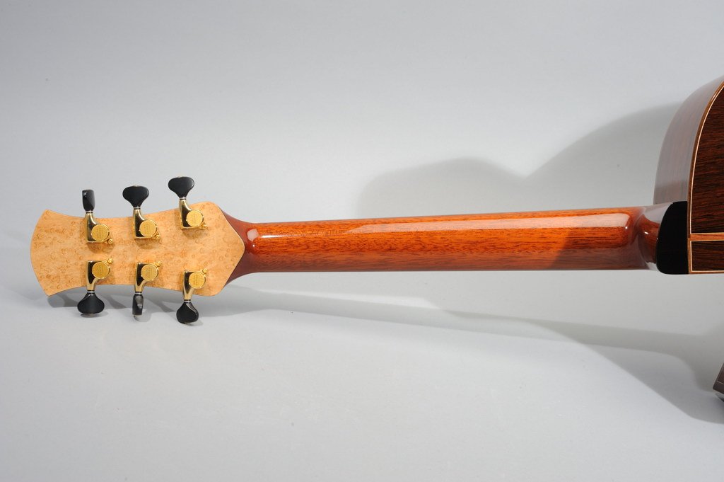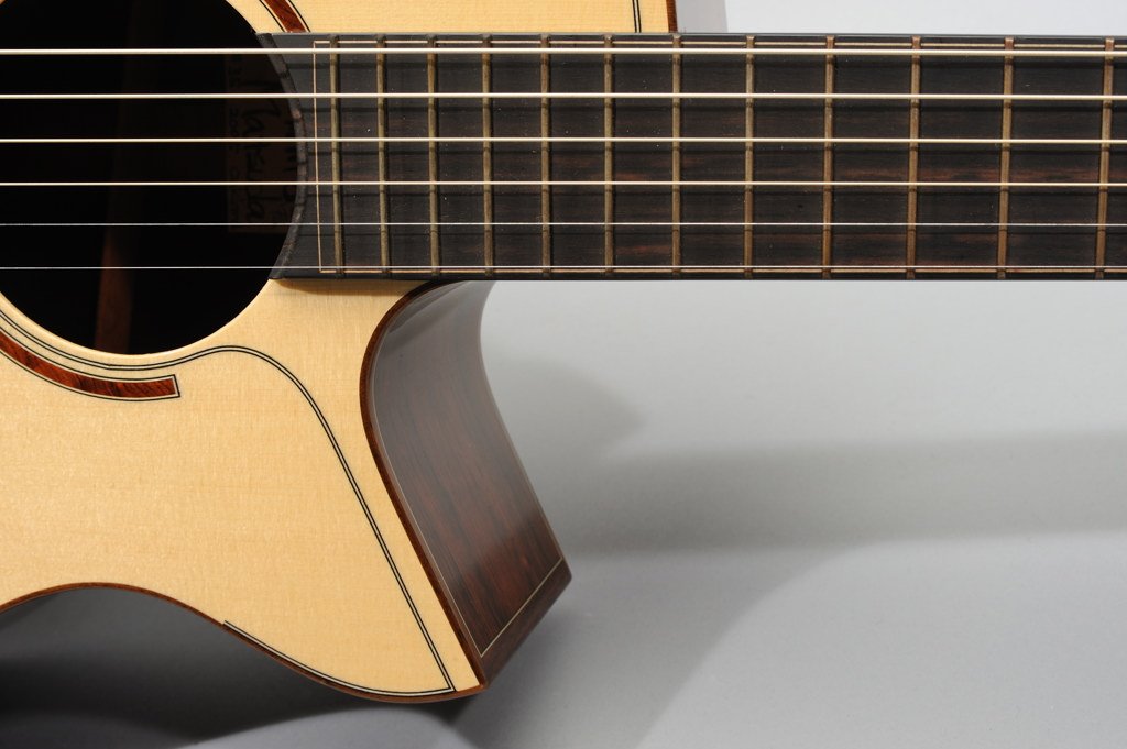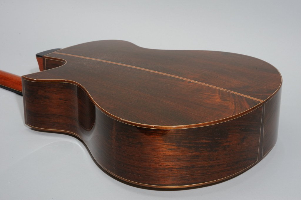 He also studied guitar restoration with the well-known instrument repairman Frank Ford, the co-owner of Gryphon Stringed Instruments. Matsuda spent about three years in Somogyi’s shop honing the guitar making skills he learned at Sakashta’s shop and at the Roberto-Venn School. He credits Somogyi, Sakashta, and Ford with helping him understand the structural complexities involved in hand building acoustic guitars. Matsuda is especially thankful to Somogyi for showing him the meaning of craftsmanship, and most importantly, teaching him the subtle art of making wood sing.
