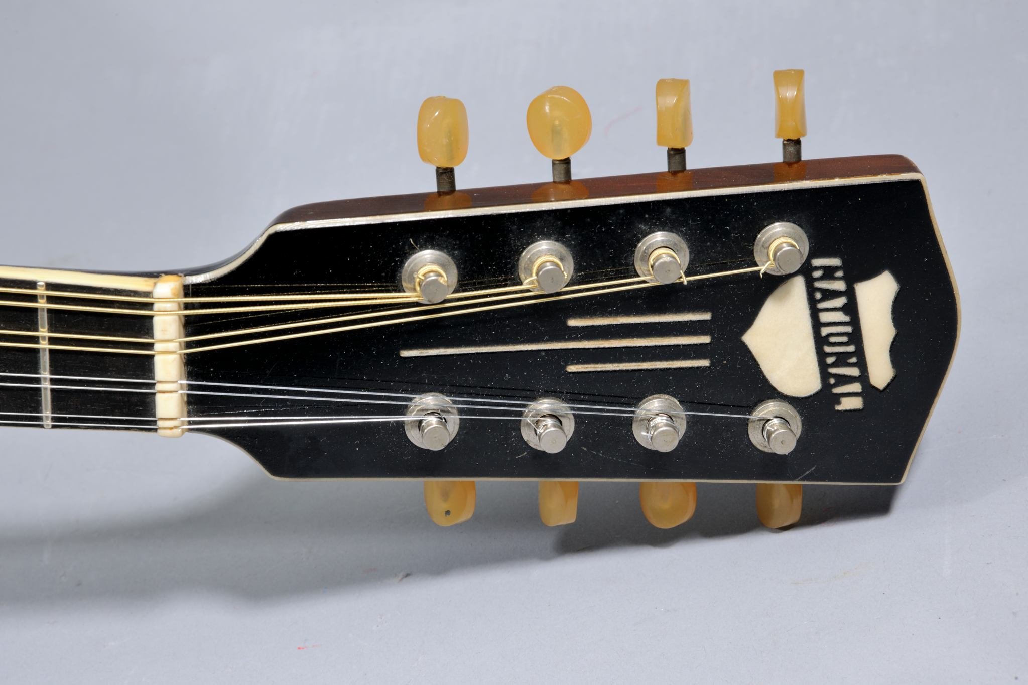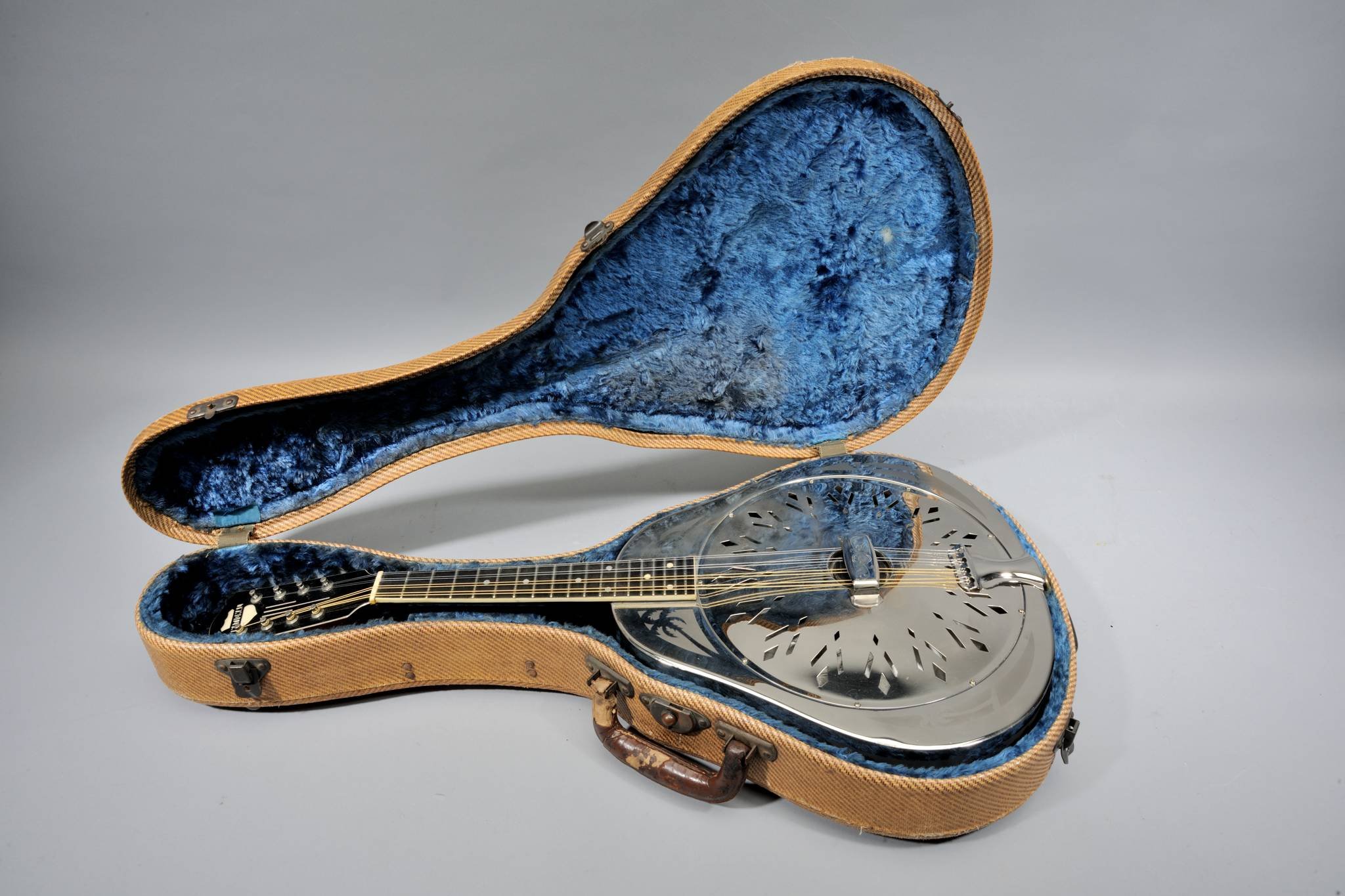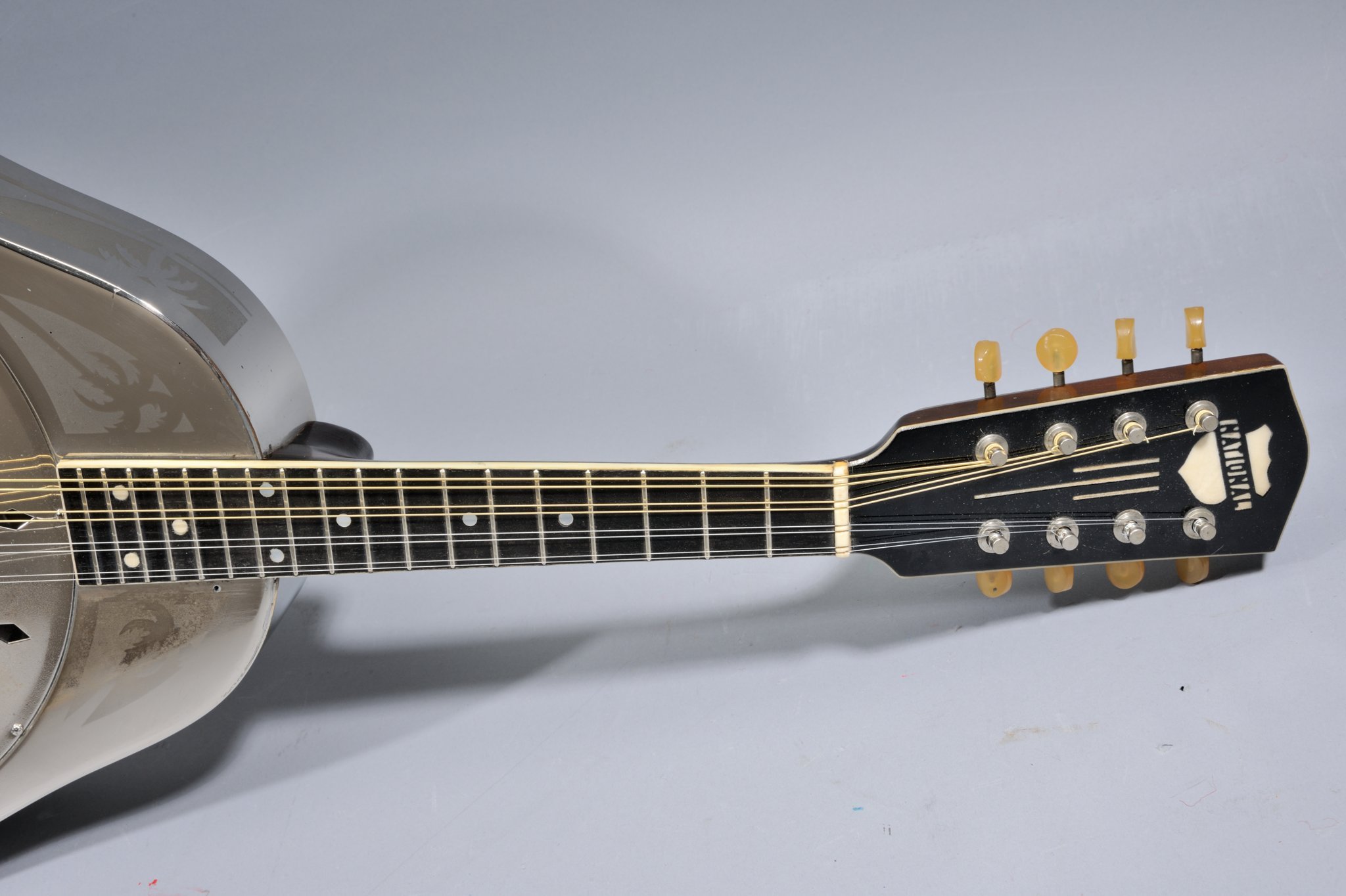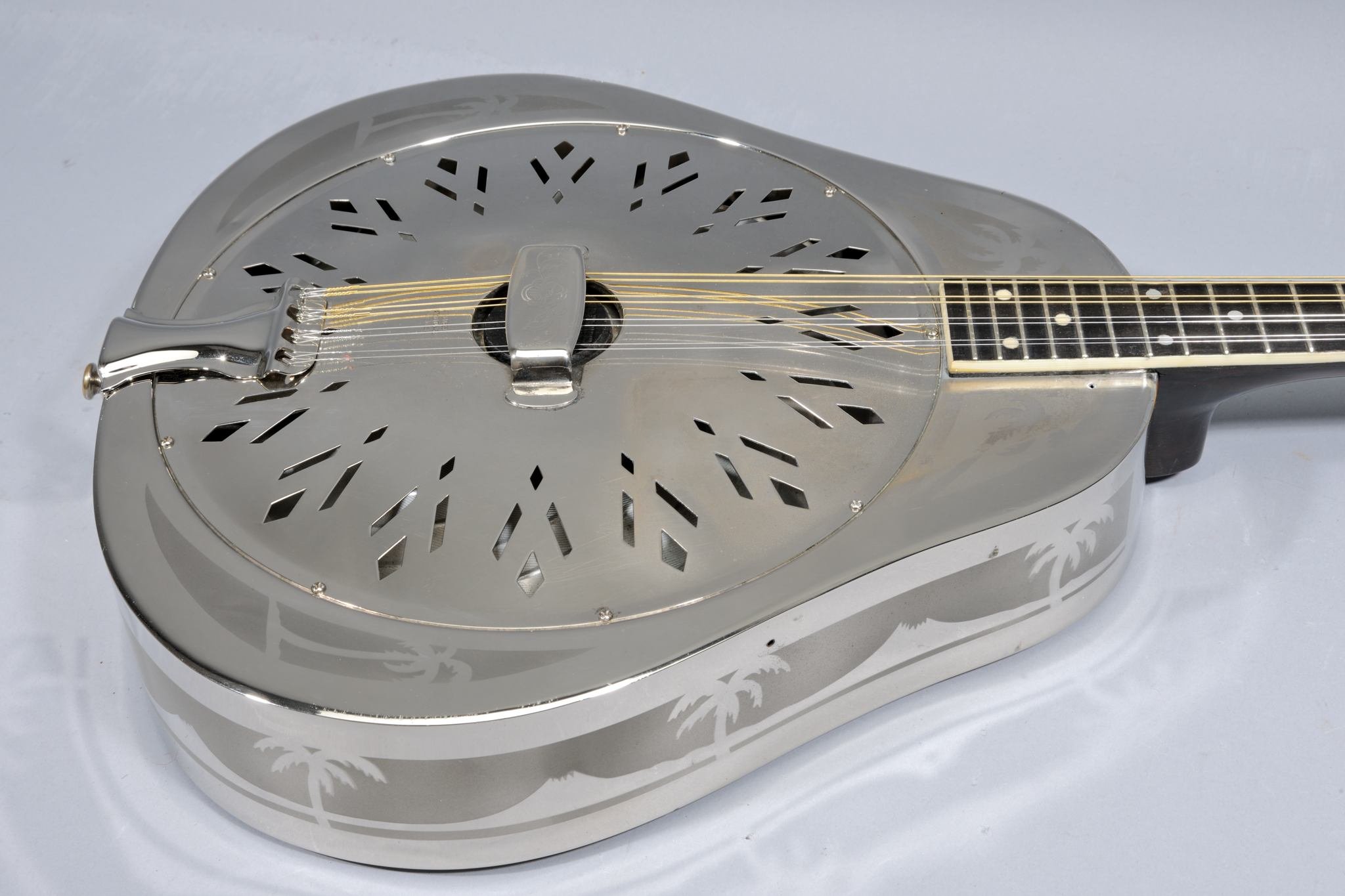 The tailpiece is shiny and could be chrome-plated. The serial number appears on a brass plaque behind the nut and the tuners are encased in two oblong gear covers, each bearing the National crest and logo and the three art-deco stripes; its original tuner buttons are caramel-colored pearloid. Uncommon pieces like this are fascinating and there really are not a lot of them in circulation. Heck, Brozman annotated only 3. National mandolins are among the loudest of all 8-stringed critters. Artistically, it sets itself apart from the enervated and the mundane – evoking a vision of the prewar era when ensembles were loud and only the stentorian could cut through. Its sound is that of string band music from a lost era, as heard on a 78-RPM record in a vision wherein the entire family is sitting around the wooden cabinet containing the radio, everyone dressed up in tattered yet serviceable clothing, the dominant color of which is gray.