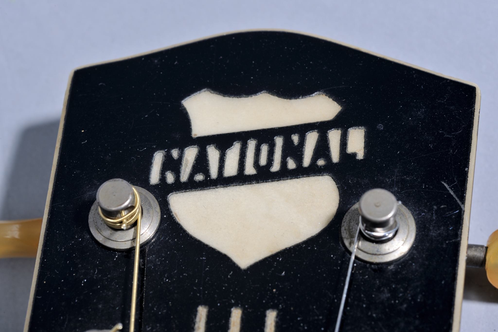 Per Bob Brozman, the “G” series of National prewar serial numbers dates from 1940 to 1941. Unbelievably enough, he actually lists this very mandolin – it’s on page 278 of his essential reference book about Nationals. He calls it a “#0 Mandolin Late Style.” There are two other mandolins listed in that section. By “late style” we believe he means that it has the “chicken feet” cover plate, just like the 14-fret Style O guitars such as the one that appears on the cover of Dire Strait’s Brothers in Arms. It has the celluloid-bordered ebony fingerboard, and the ivoroid bordered, polished black headplate bearing the National name in a parallelogram near the center of an ivoroid crest with the triple art deco “Chorus of Yums” appearing below. The cover plate is held in place by 9 roundhead Phillips screws starting at the 12 o’clock position.