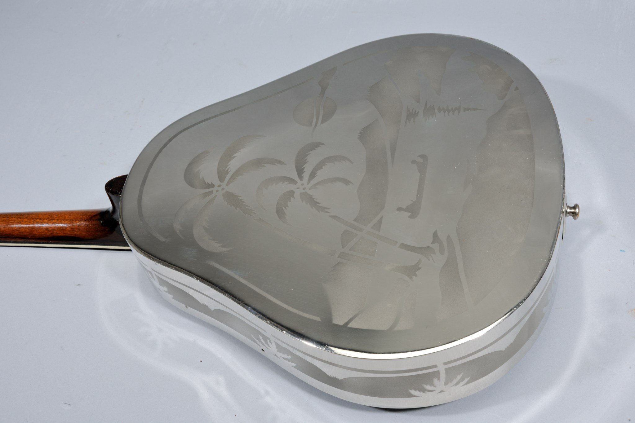 What makes this mandolin majestic, notwithstanding that it was already knightly just from being a nickel-plated brass-bodied semi-triangularly shaped body mandolin from the era of The Greatest Generation, is that it has a rose engraved on the cross piece that one’s hand rests on at the center of the cover plate, over the black biscuit bridge. In addition it has the sand-etched Hawaiian scenes on top, sides and back depicting the archipelago, the twin palm trees, the 3 inactive volcanoes, the dual canoeists, the clouds and the setting sun, and that’s just on the back, there’s also volcanoes and palm trees in a repeating pattern on the sides and at least 3 more trees on the front. This mandolin once had a pickguard, but that has long since gone to cellulose-nitrate heaven leaving behind a down-to-the-brass coloration to the upper treble bout and two screw holes in the metal. Said nickel-plated metal shows a few normal dings, light scratches and cloudiness – as one would expect – but the dark sunburst back of the mahogany neck, aside from a few crazing lines is quite amazingly clean, suggesting that this wasn’t played all that much. It bears the long scale of 14 7/8” (approximately), with a fretboard width of 1 3/16th which we deem the most comfortable width for a mandolin.