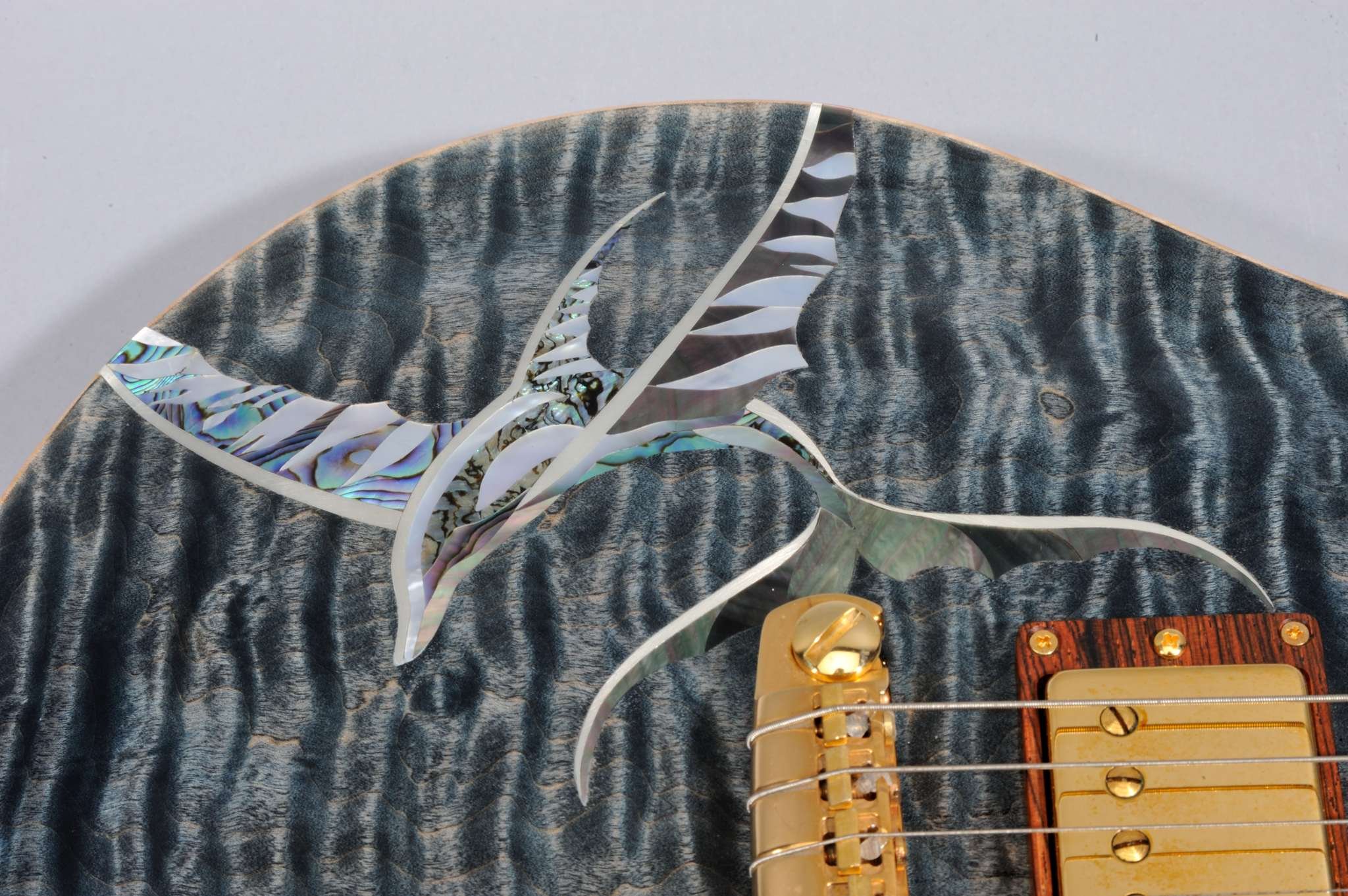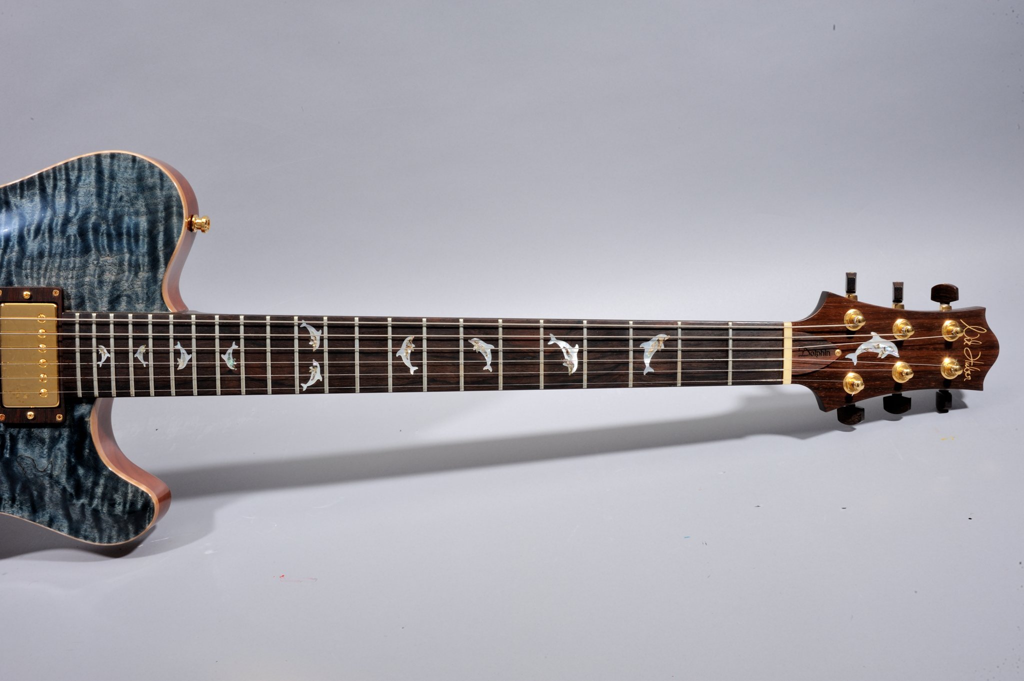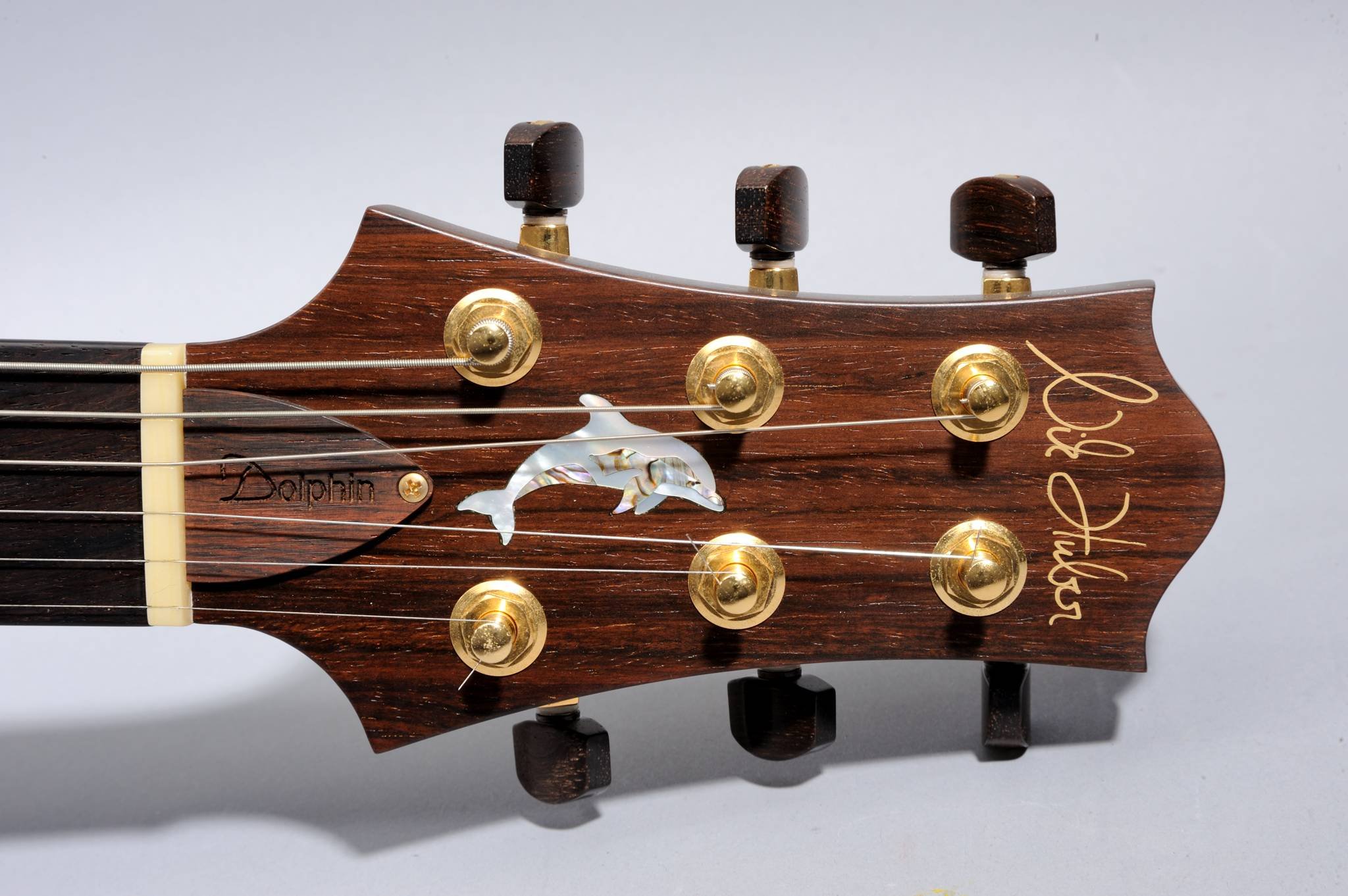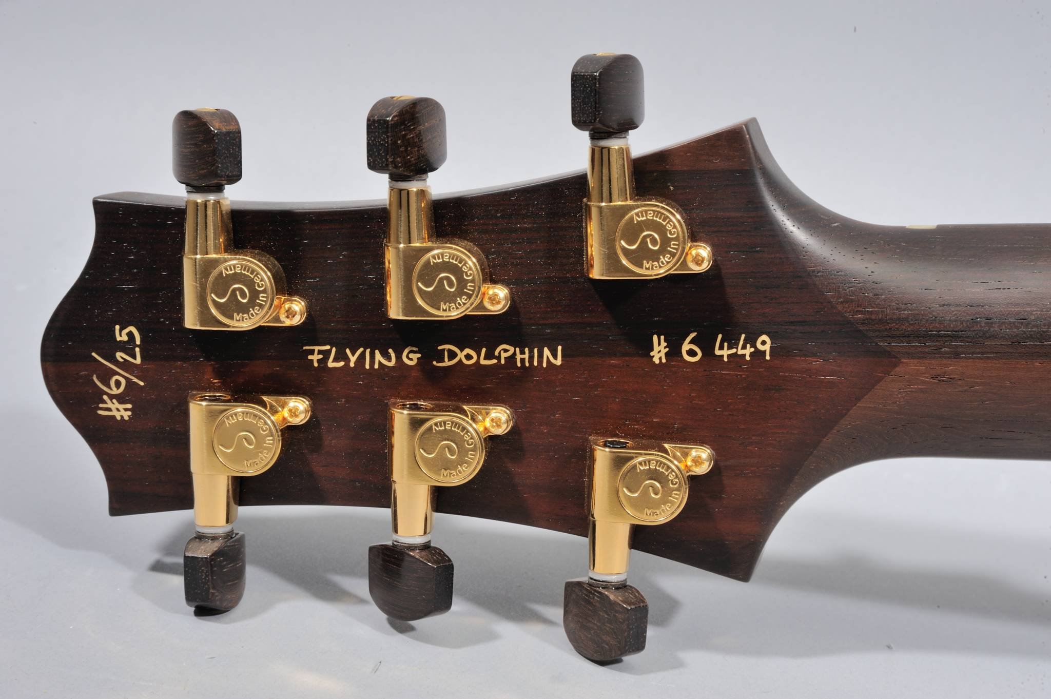 The Flying Dolphin includes an 85 piece Hand-cut Multi-Inlay made of Abalone, Black Pearl, Mother of Pearl, and Sterling Silver on the top of the body. Body inlays are very unique, and very difficult to build.