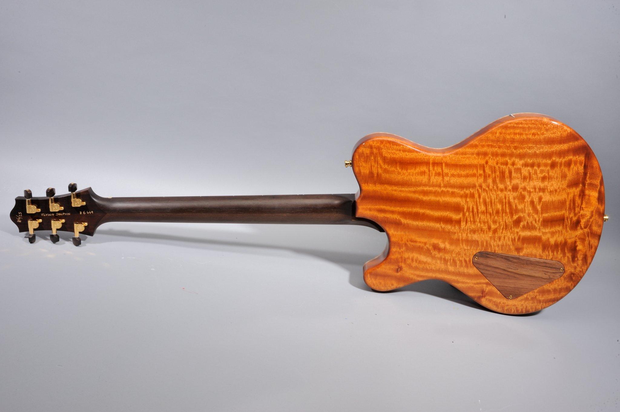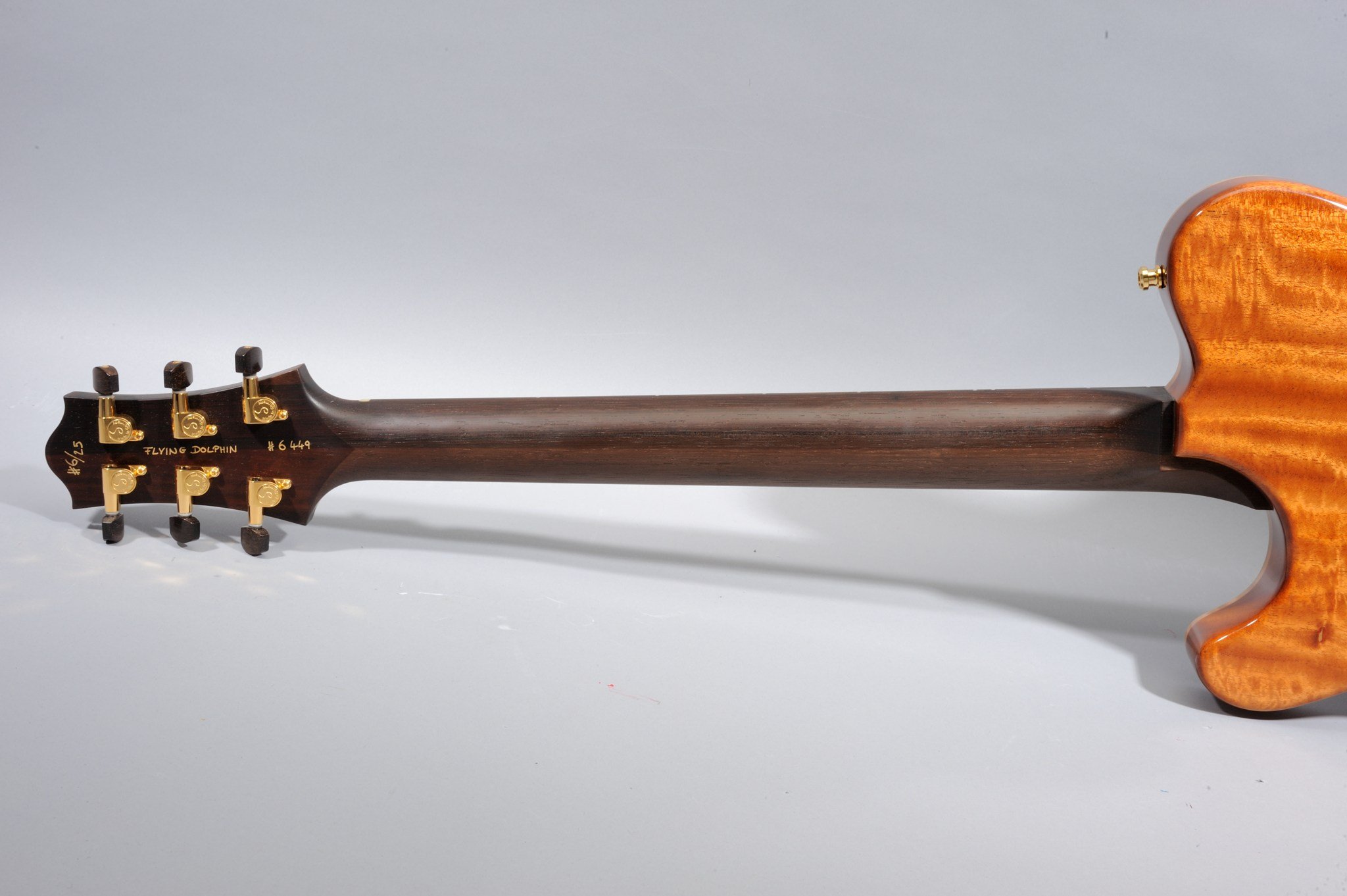 Flying Dolphin #6 also has the Brazilian Rosewood package consisting of a solid 2-piece Brazilian Rosewood Neck, Fingerboard, backside cover plate, pickups rings and truss rod cover. This guitar has Nik’s Dolphin inlays in the fretboard position markers. It has 2 Haussel Humbucker Pickups which could be splitted. This one also sports Ebony tuning keys and Gold Hardware.