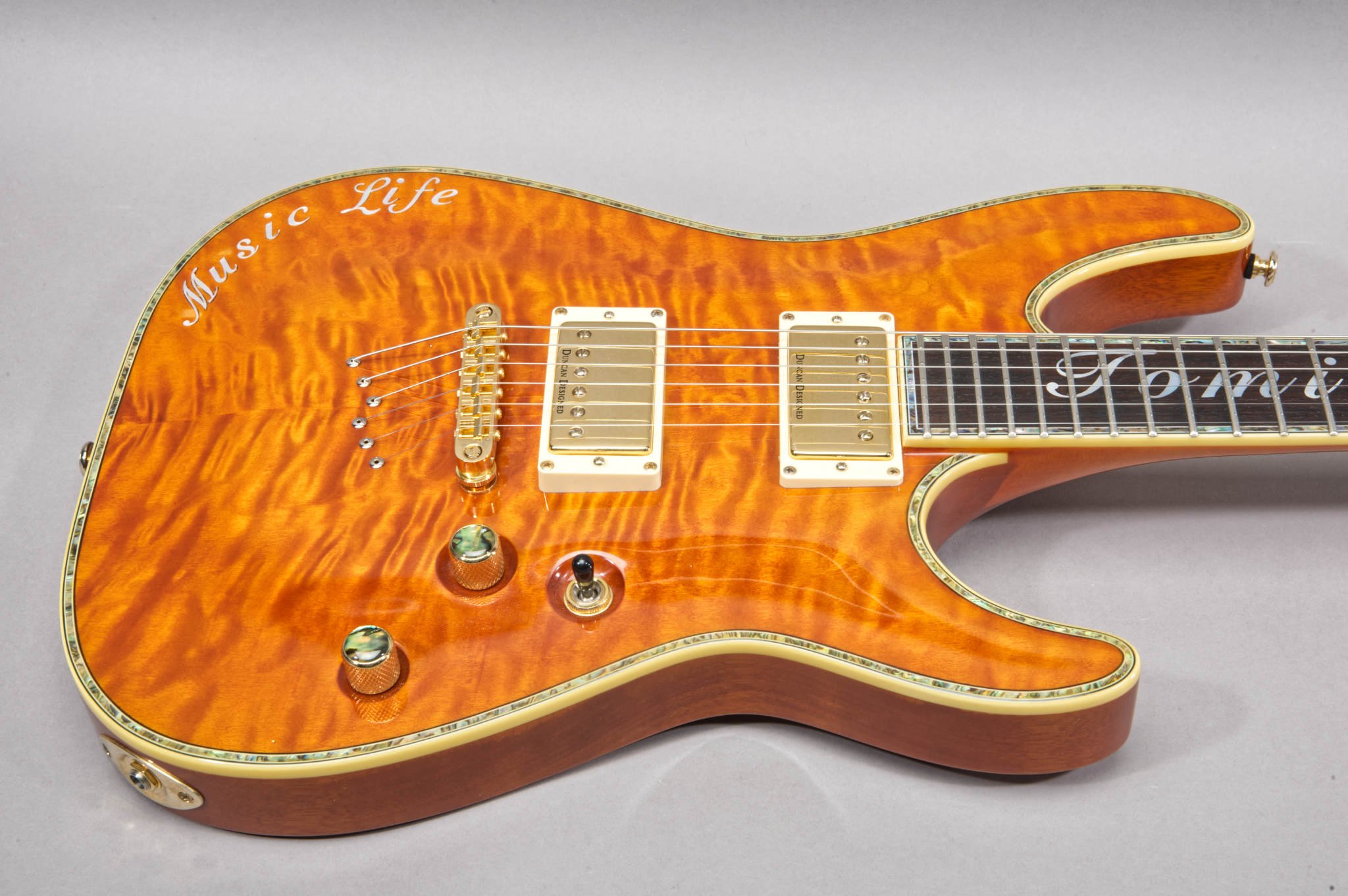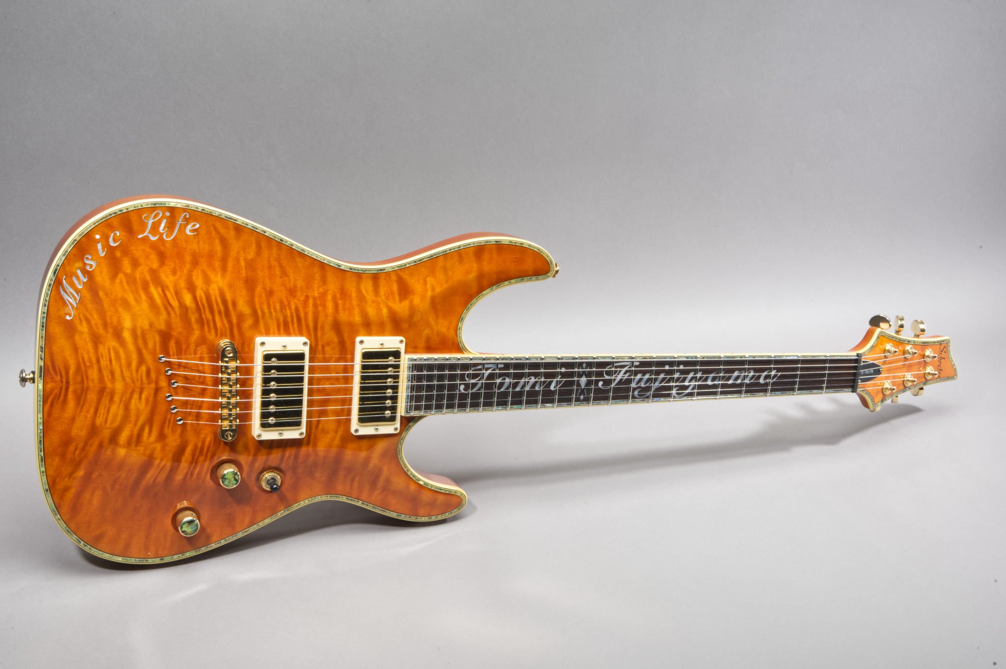 Tomi Fujiyama MOP Inlays on the Ebony Fretboard & Music Life Inlays on the body.