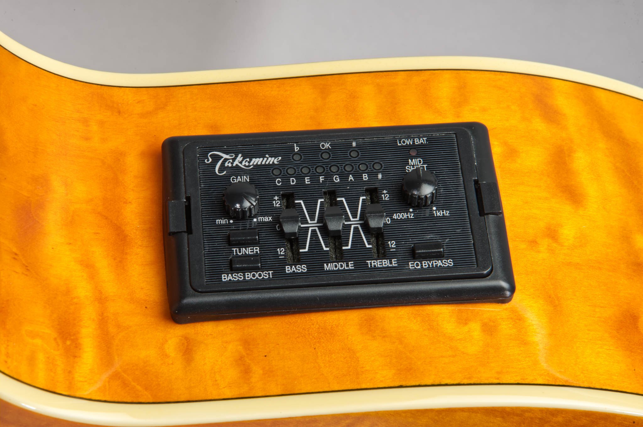 Electronics Takamine TK-40B preamp system with a built-in tuner, three-band EQ and gain controls, mid-shift control, bass-boost switch and EQ bypass switch.