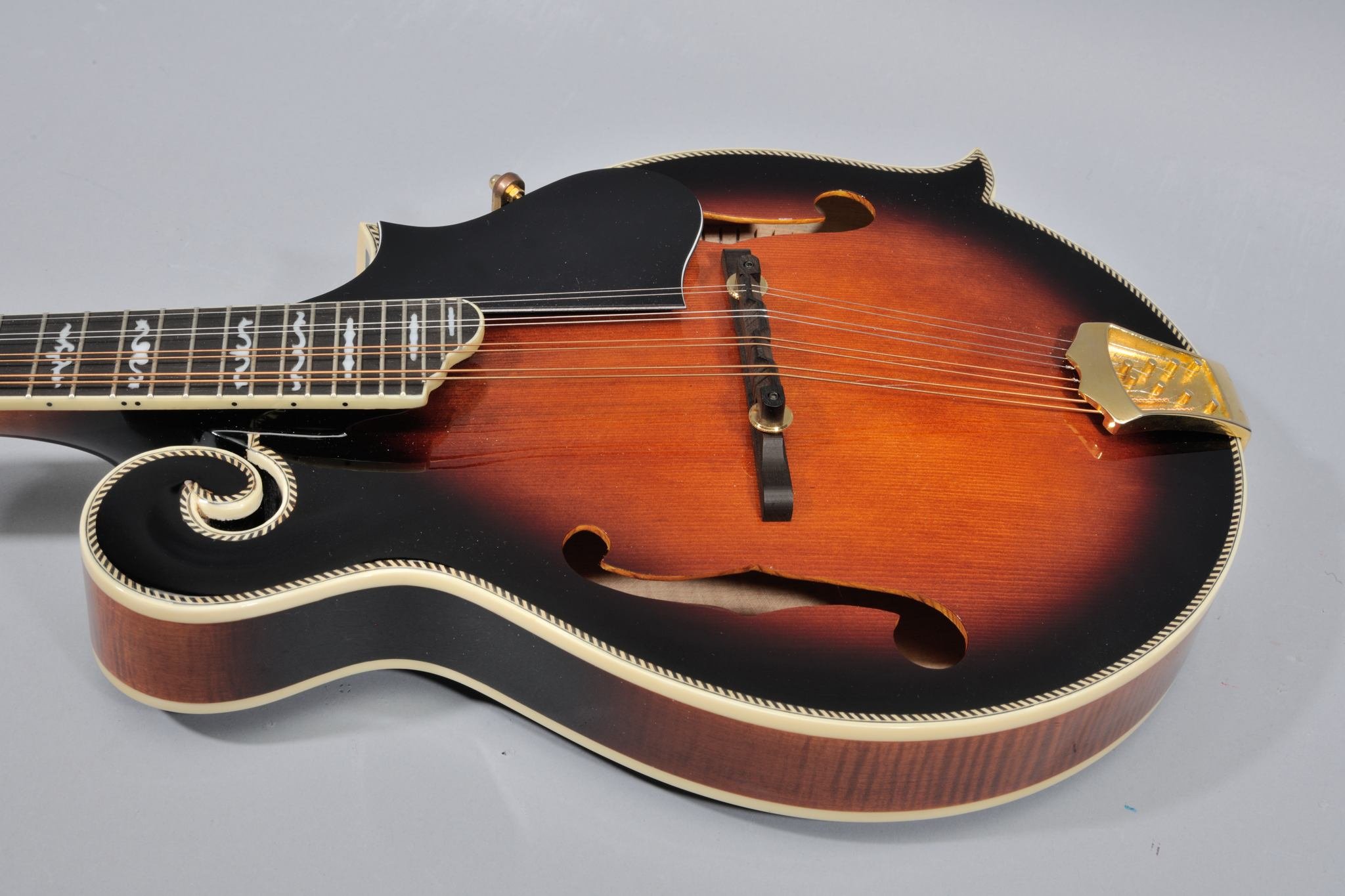 Carved Solid Spruce Top with dual F-holes & Herringbone purfling.