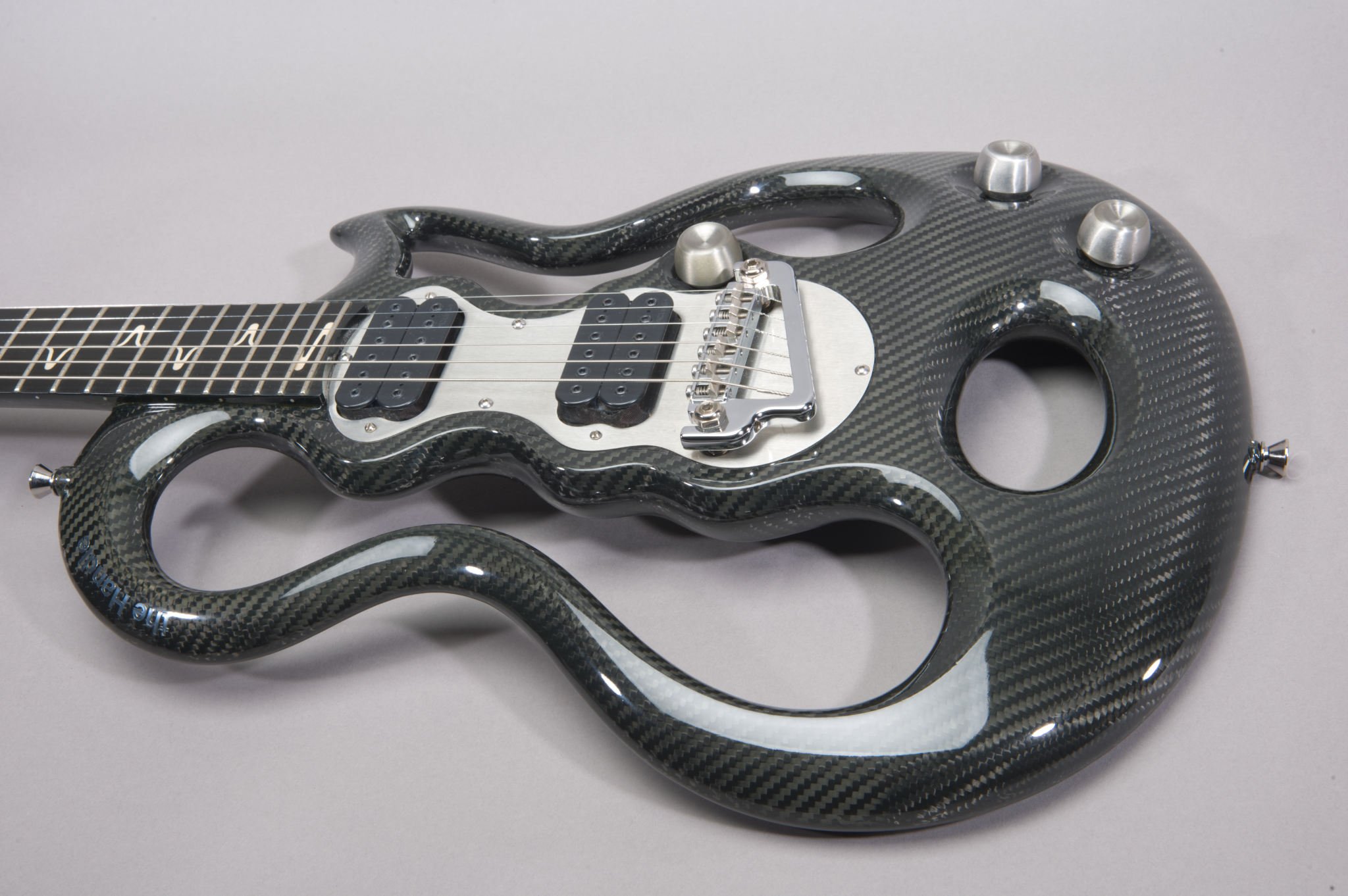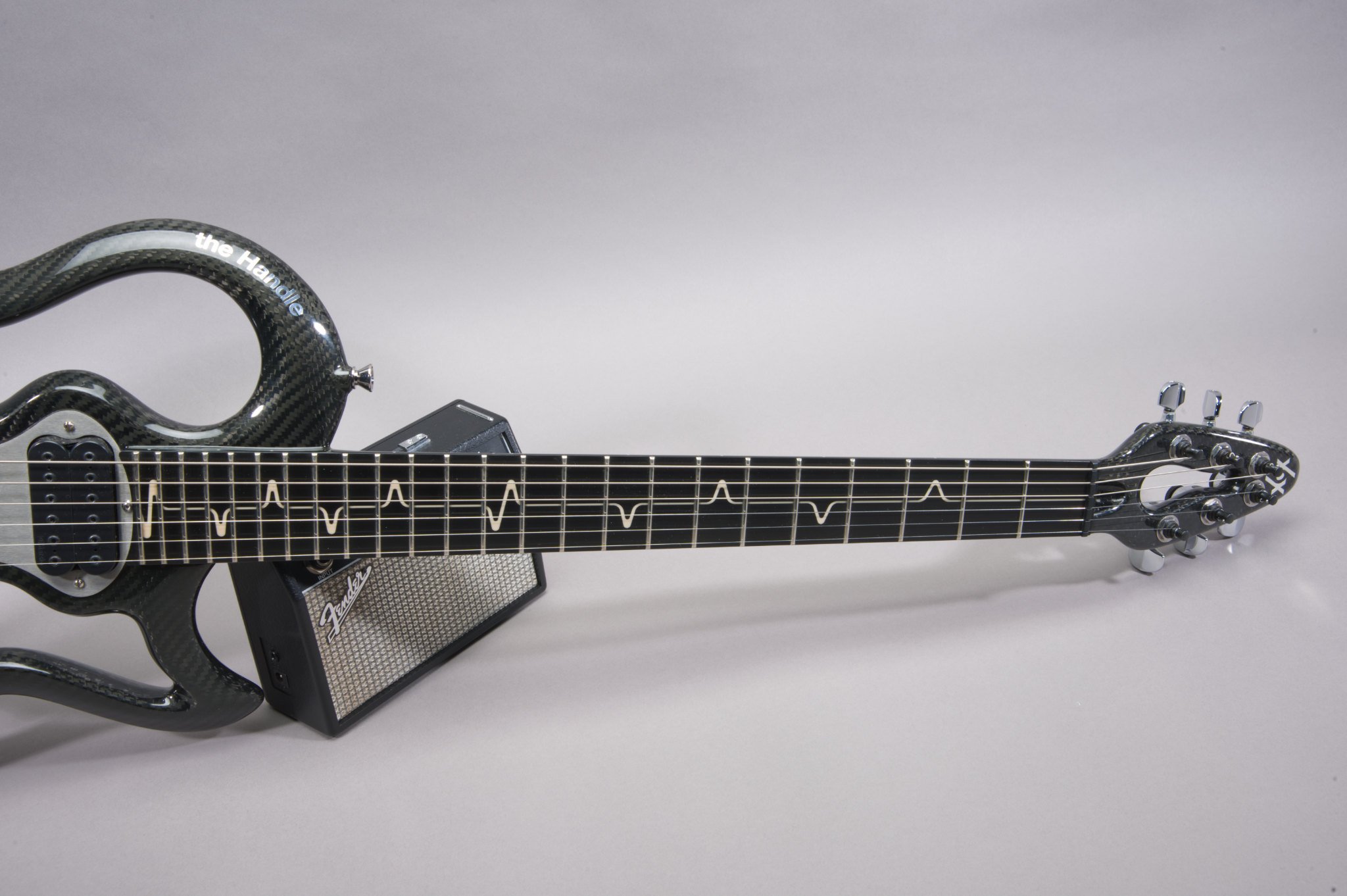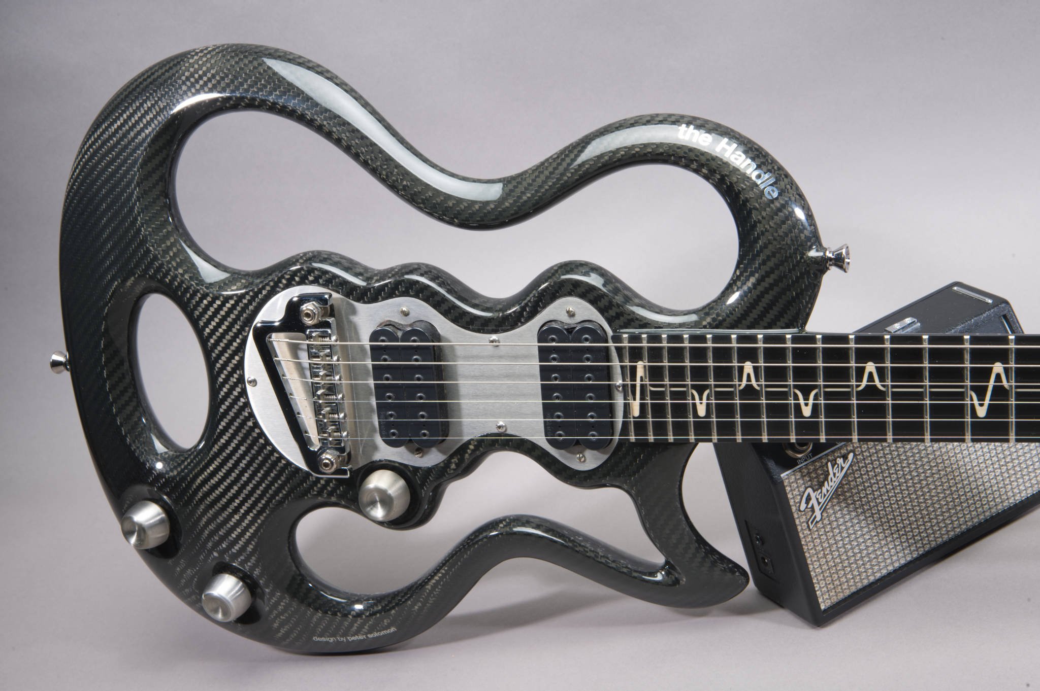 The Handle model manufactured by XOX Audio Tools was designed by Peter Salomon. The body and neck of the guitar form a hollow carbon fiber monocoque structure.
