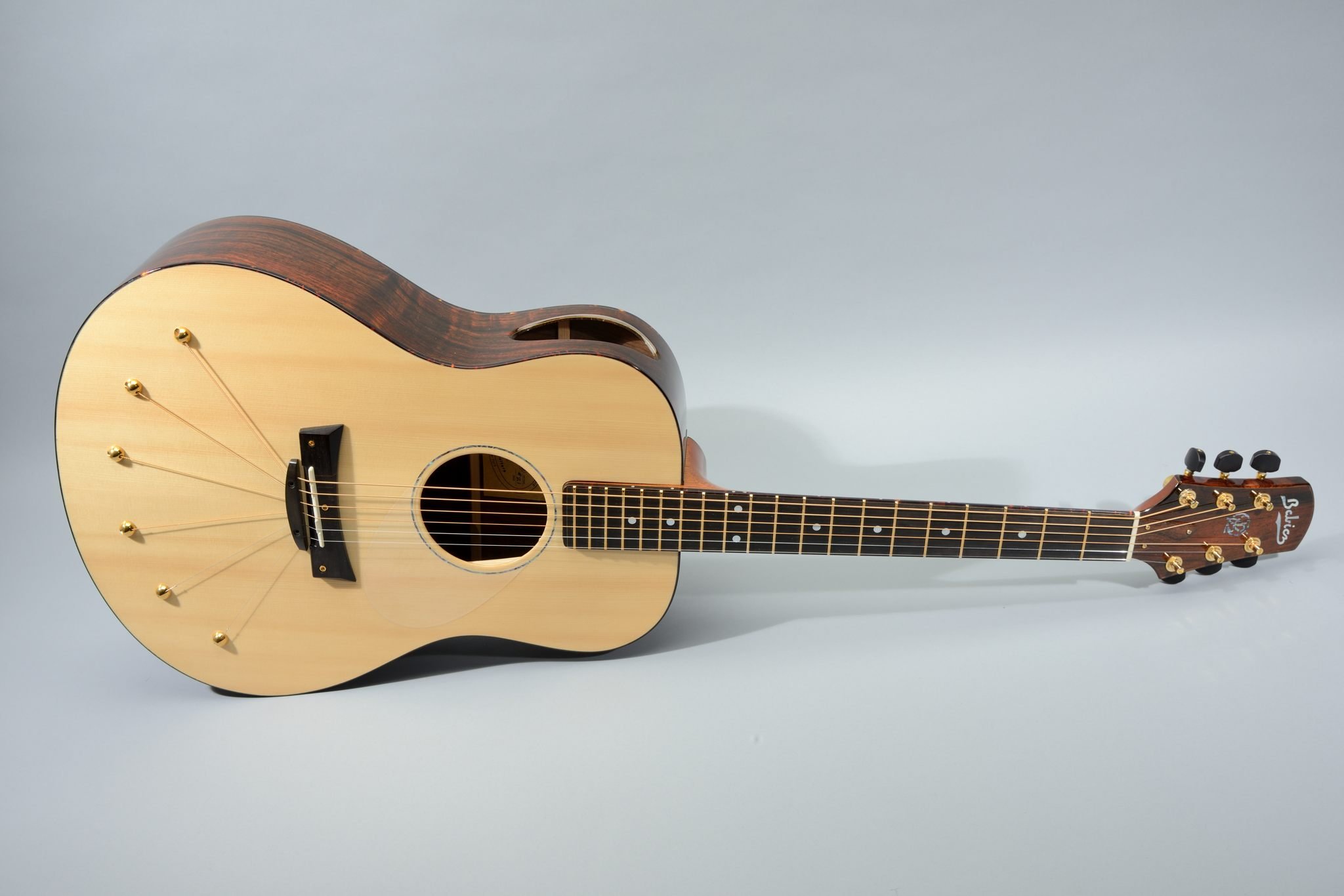 This guitar also features patented Torque Reducing Split Bridge, Continually Adjustable Neck and String Anchored Lateral Compression Soundboard.