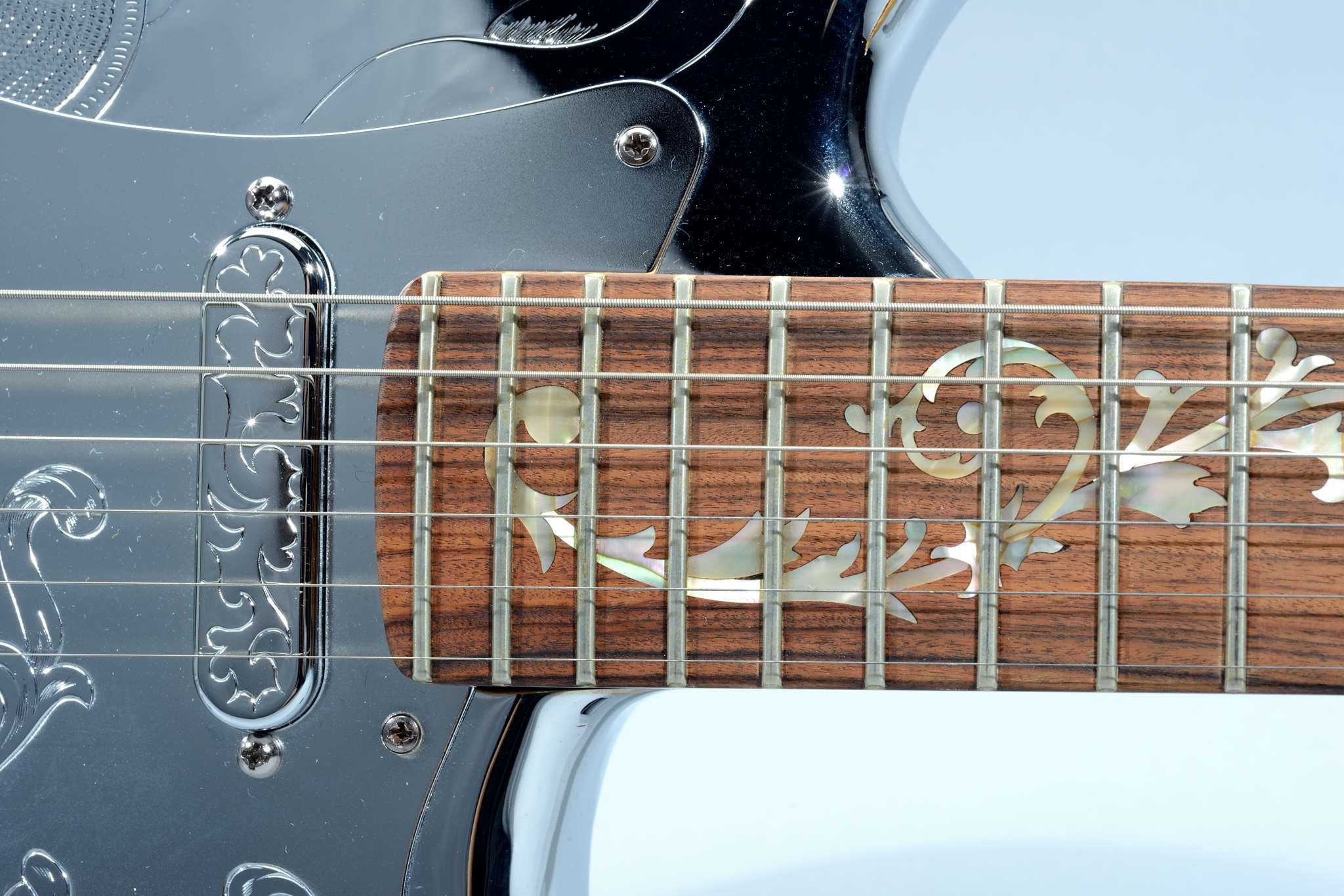 The Art Nouveau Stratocaster was designed and built by J.W. Black, and Ron Chacey who did the intricate engraving on the body and inlay on the neck.